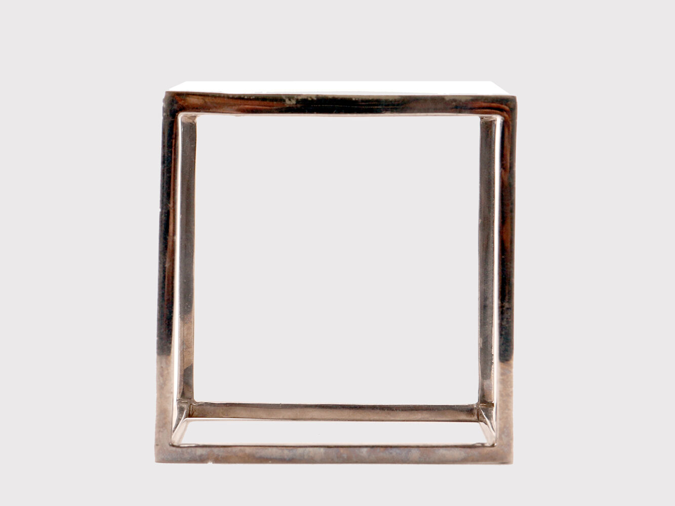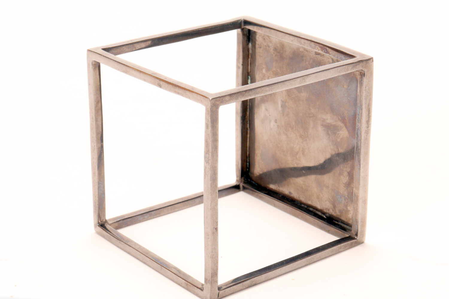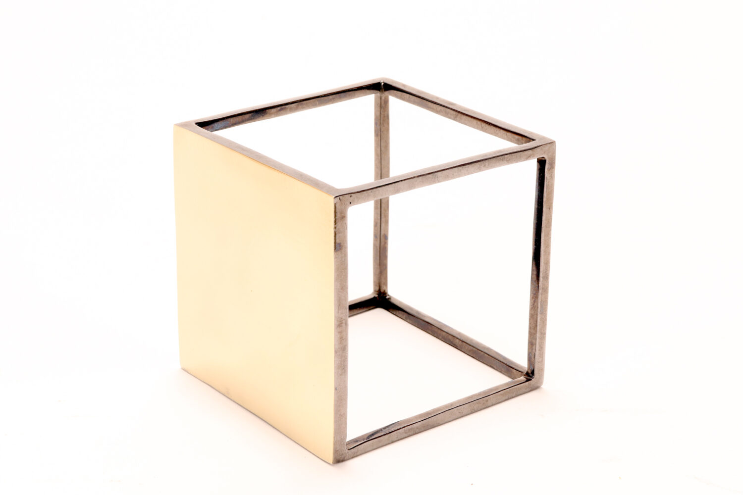 Prototipo di bracciale in di forma cubica realizzato in ottone brunito. Un lato del solido è una lastra in ottone brunito a forma di quadrato, gli altri cinque lati sono vuoti. Designer Stefania Bosio per Ornamenta. Italia anno 2000.