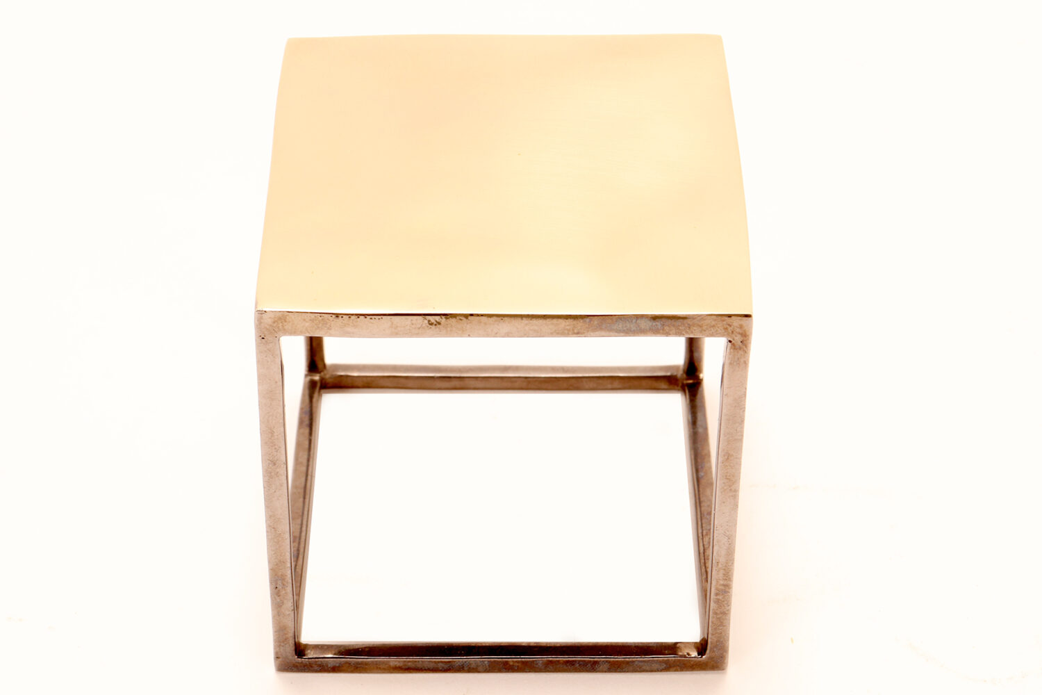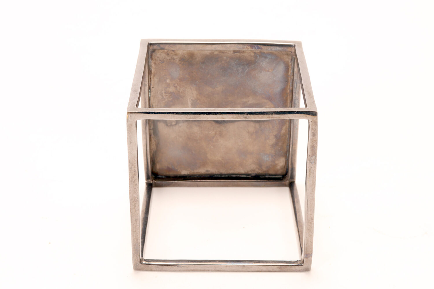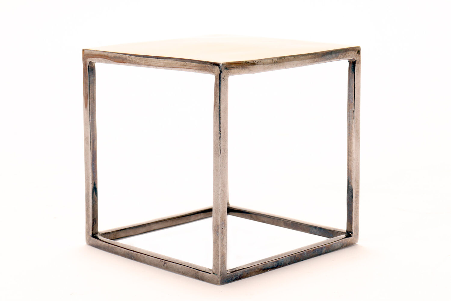 Prototipo di bracciale in di forma cubica realizzato in ottone brunito. Un lato del solido è una lastra in ottone brunito a forma di quadrato, gli altri cinque lati sono vuoti. Designer Stefania Bosio per Ornamenta. Italia anno 2000.