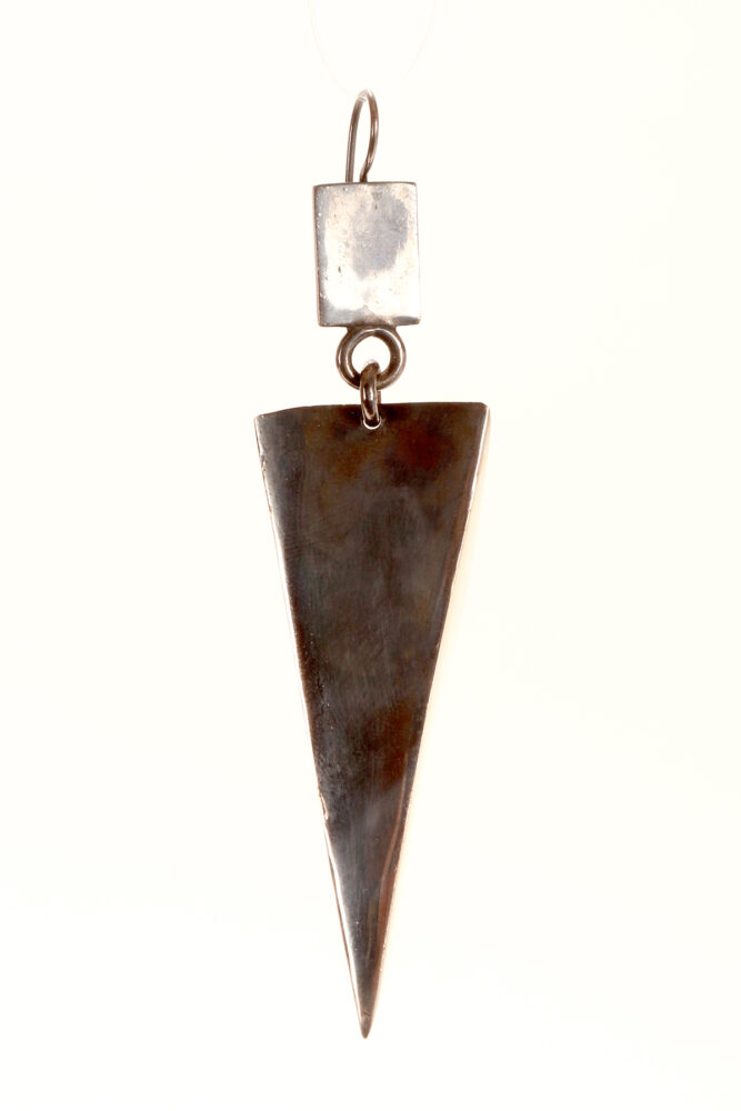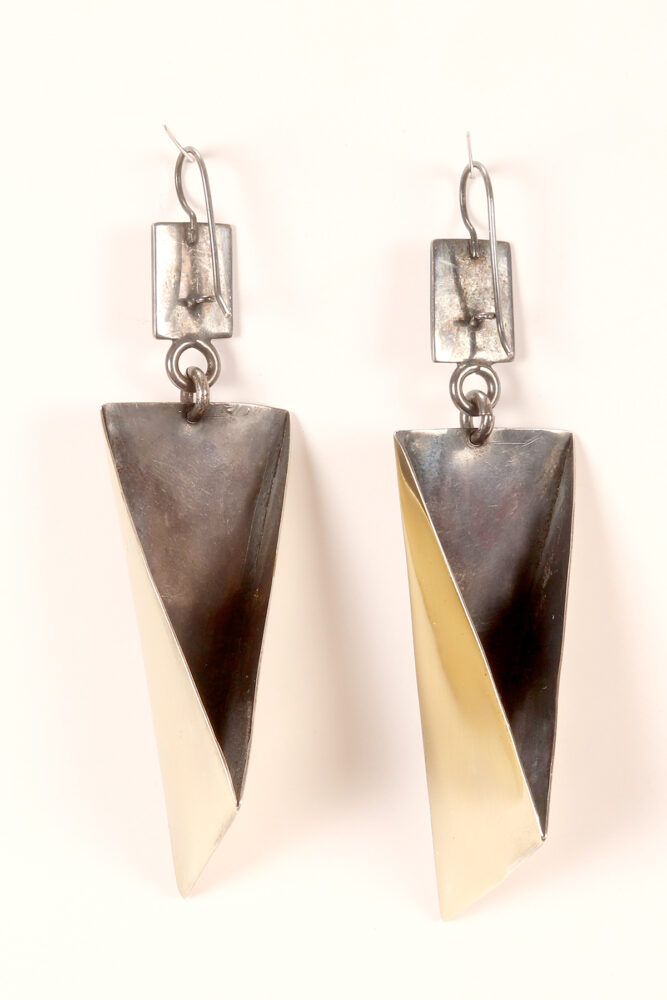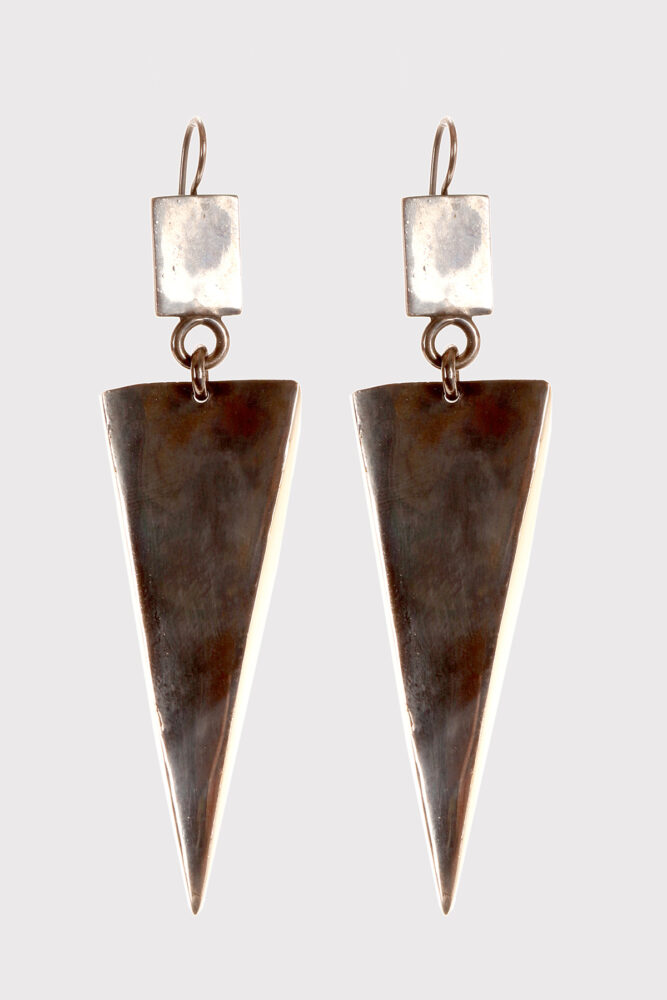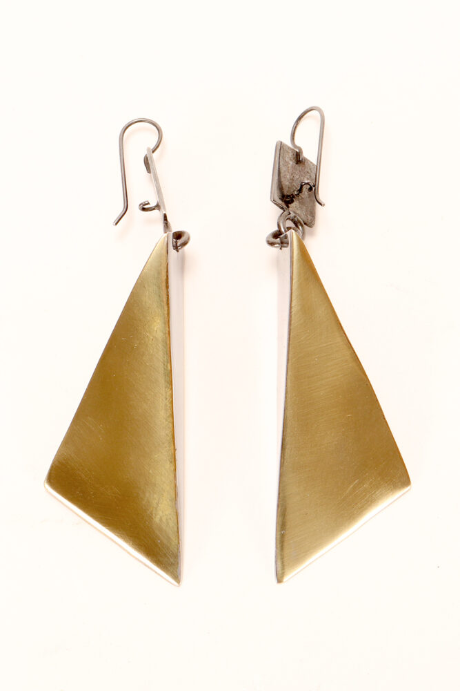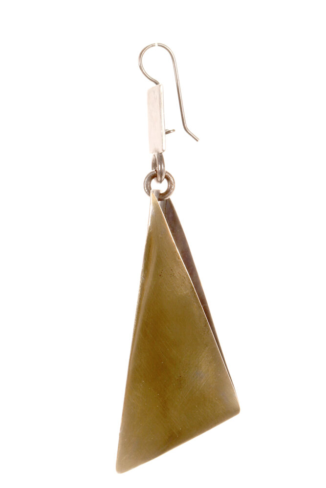 Prototipo di una coppia di orecchini pendenti a forma di tetraedro realizzato in ottone brunito. Un lato del solido, il fronte, è una lastra in ottone a forma di triangolo isoscele, un lato, il retro, è aperto. Designer Stefania Bosio per Ornamenta. Italia anno 2000.