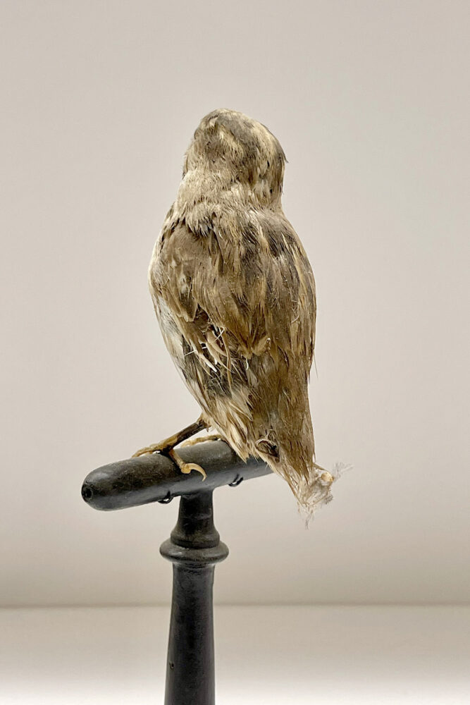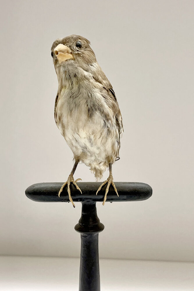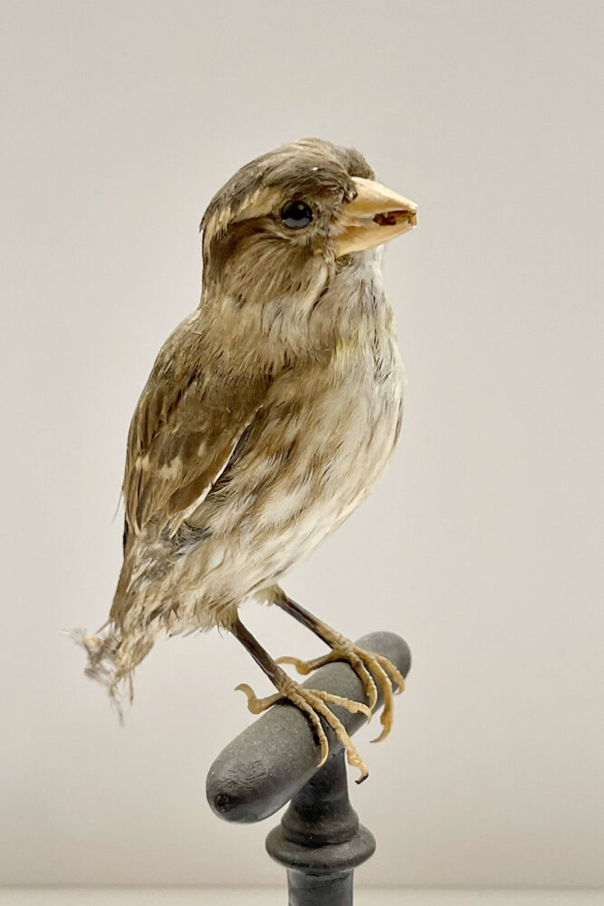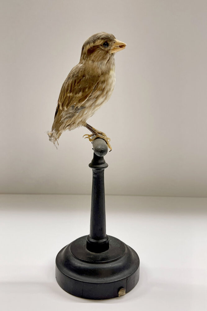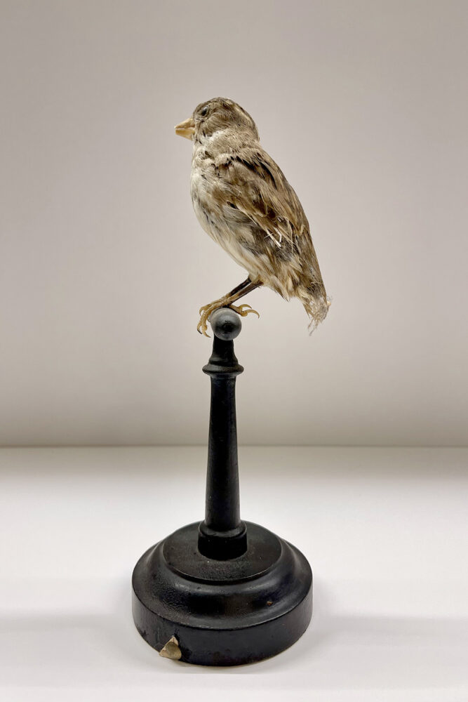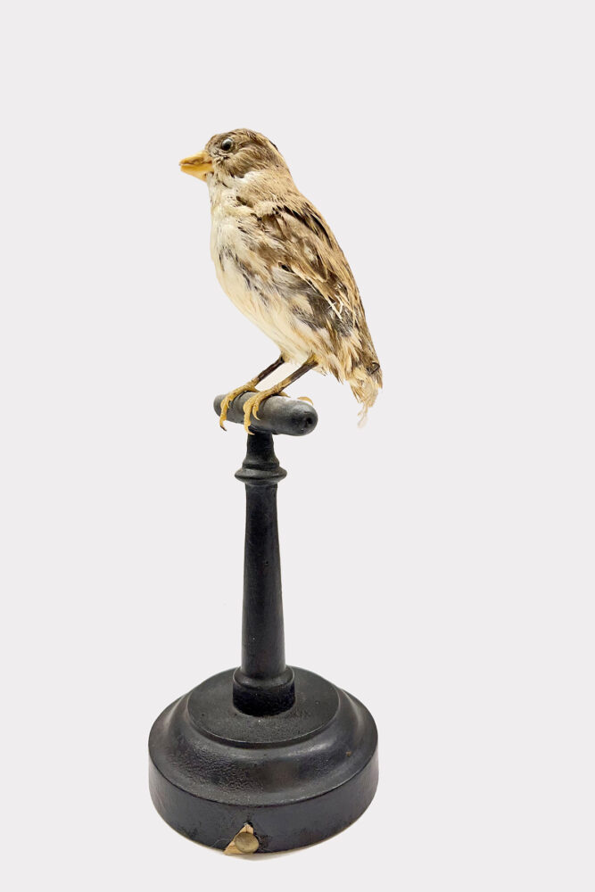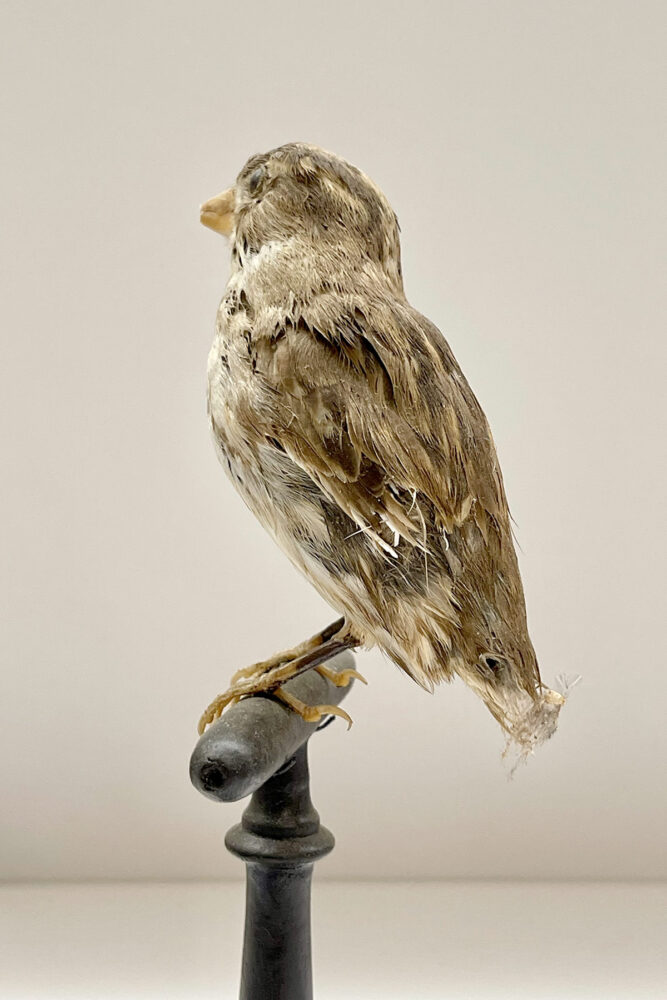 Uccello impagliato da gabinetto di storia naturale, una femmina di Passero domestico, Italia 1880.