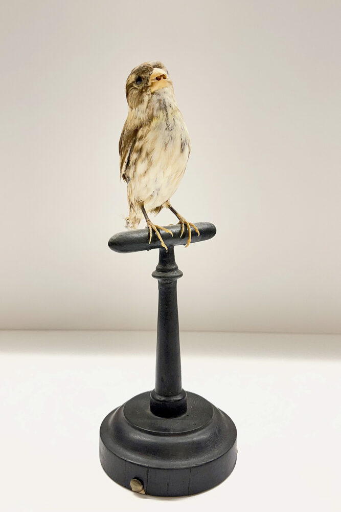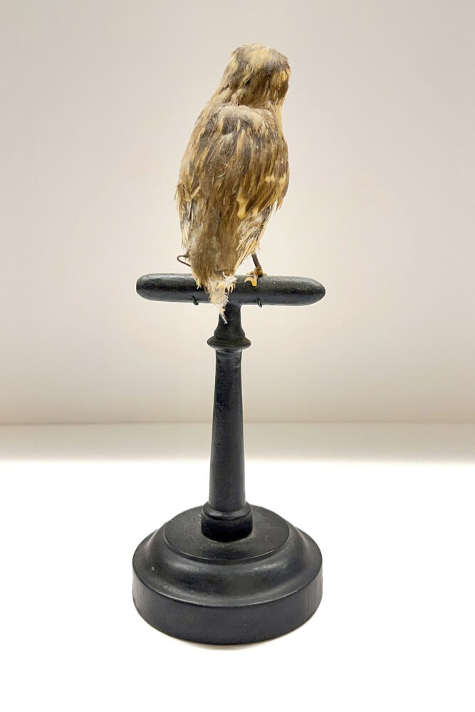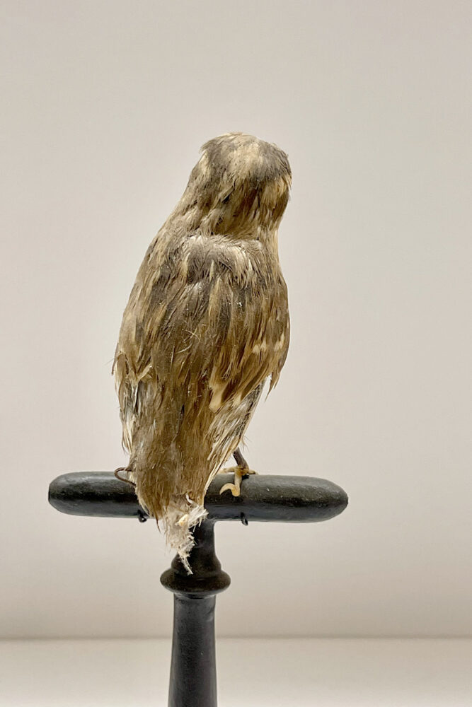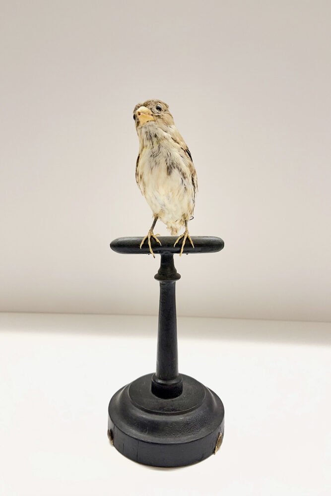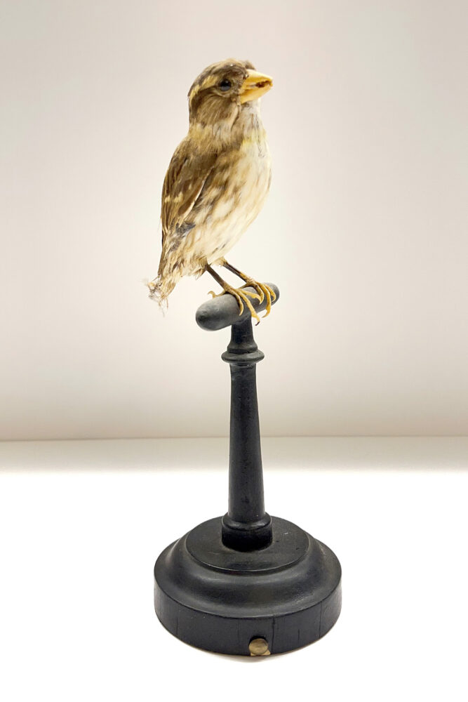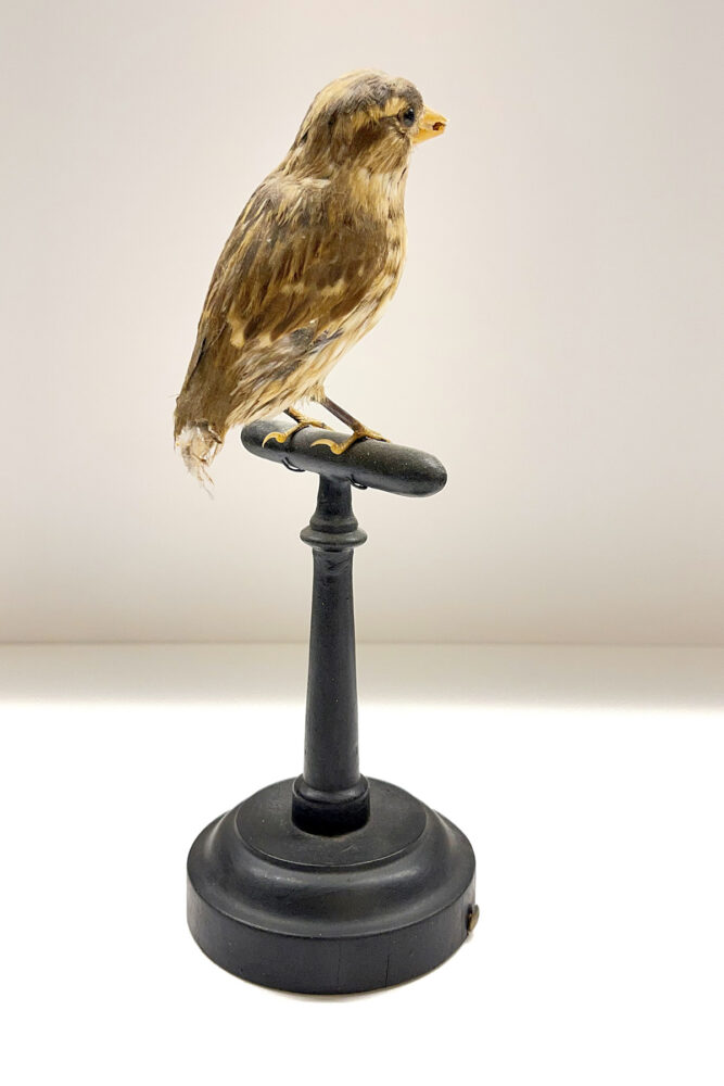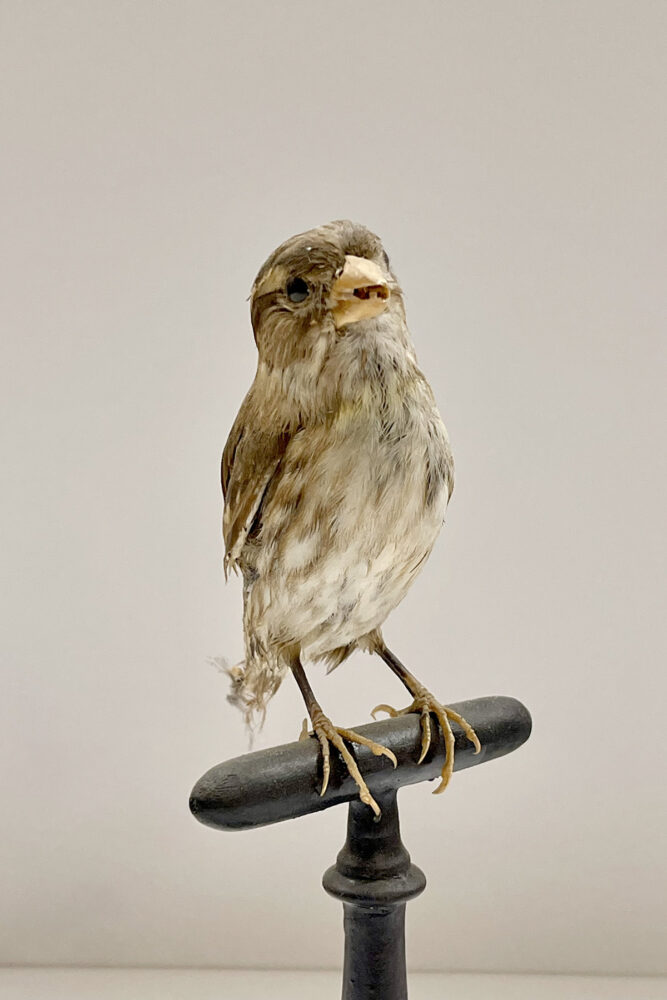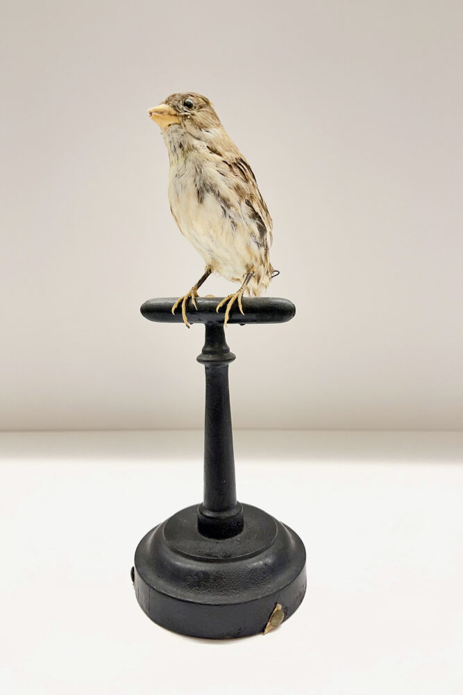 Uccello impagliato da gabinetto di storia naturale, una femmina di Passero domestico, Italia 1880.