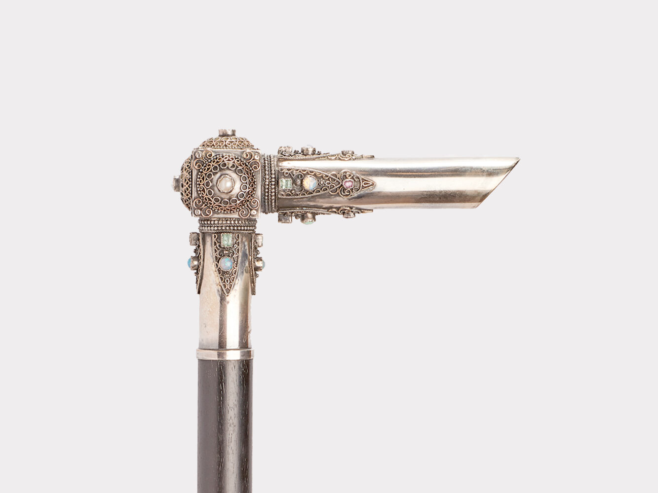 Walking stick: jeweled cane, L-shaped knob with gold filigree and precious stones: pearls, opals, rubies, tourmalines. Ebony wood Diospyros Ebenum (J. Koenig 1781) shaft. Metal ferrule. Signed Sophie Sander-Noske (1884-1958), Austrian goldsmith and designer, worked in Paris and Amsterdam, specializing in gold and silver filigree work. Paris, France 1900-1910.