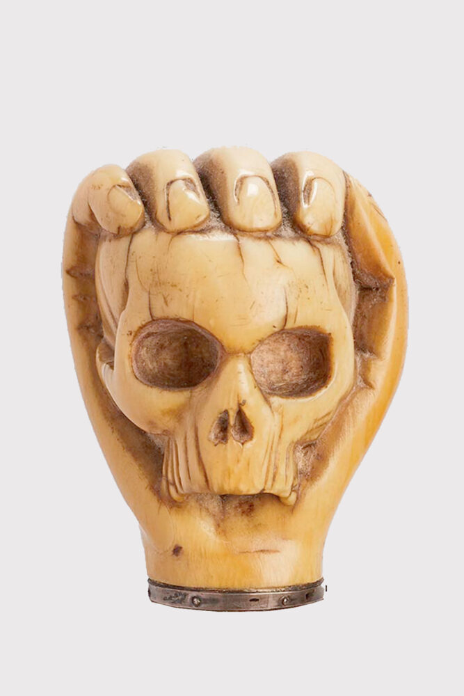 Walking stick: ivory carved handle, depicting a Memento Mori, a hand holding a skull. Malacca wood shaft. Silver ring. Horne ferrule. Germany 1860 ca.