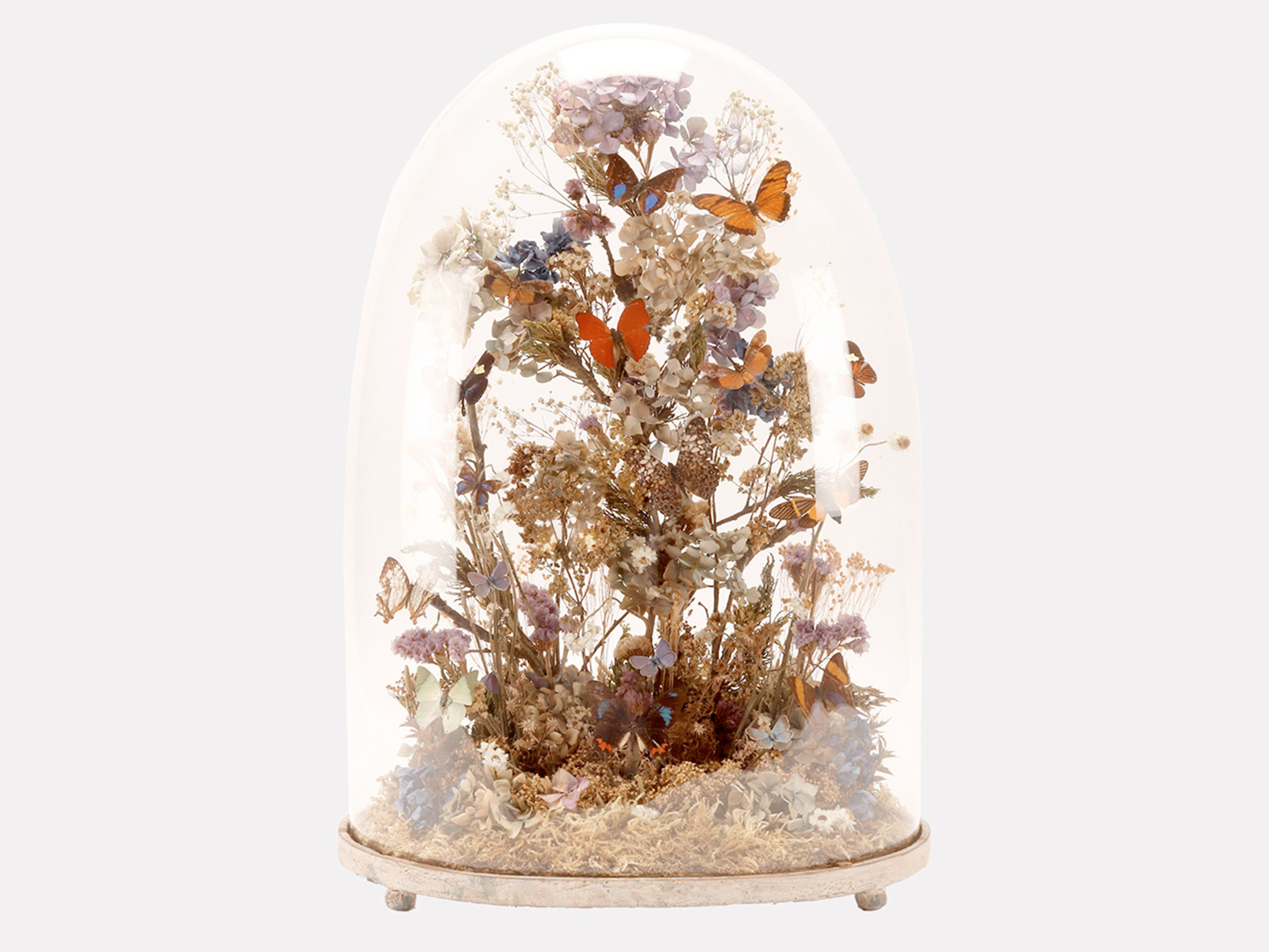 A big diorama with natural Wunderkammer specimens of multicolored 16 butterflies, leaned over flowering tree branches willing over moss. The specimens are mounted inside an oval glass dome, over a white painted wooden base. Italy second half of 19th century.
