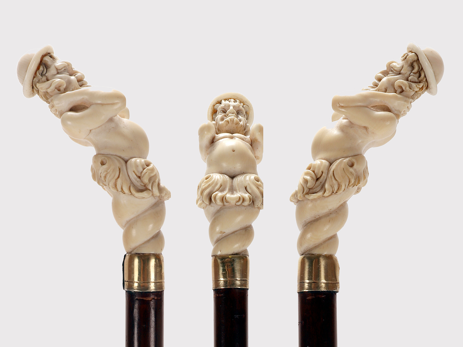 Walking stick: carved ivory handle depicting a satyr with pointed ears and goat hair, wearing a hat, with his hands behind his neck. Ebony cane. Silver band and metal ferrule. Dieppe, France, mid-19th century.