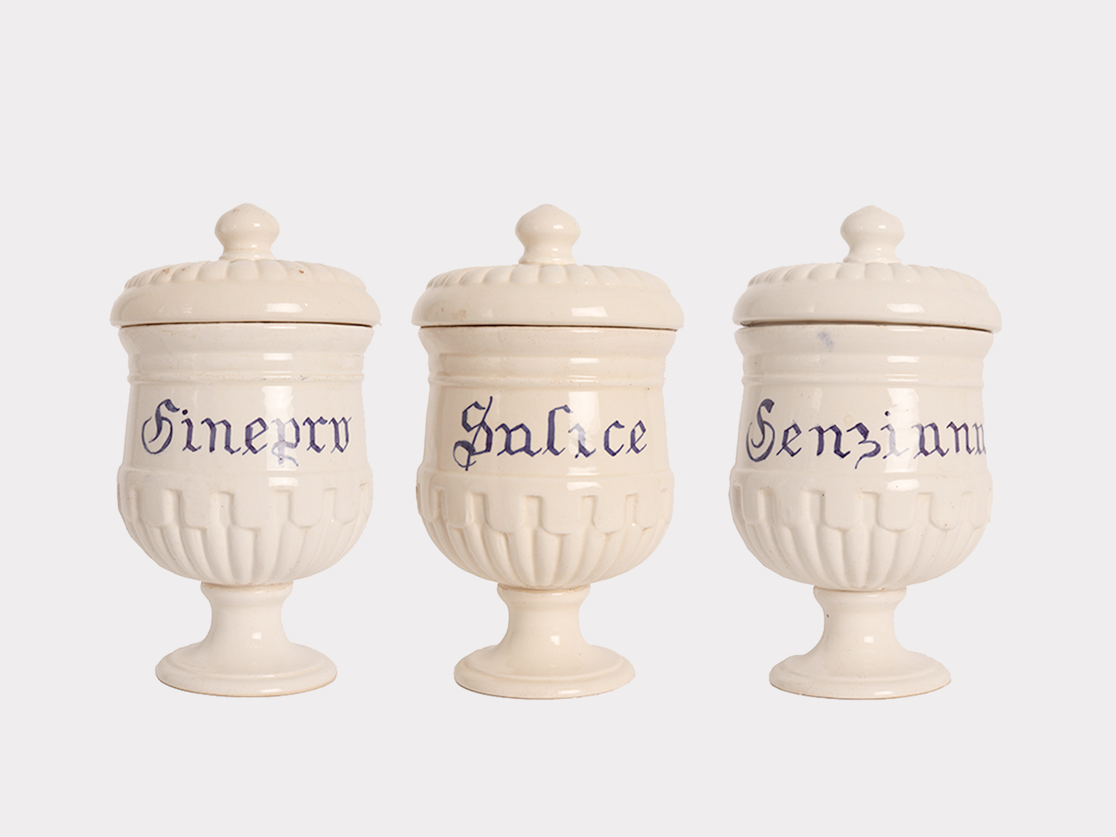 Set of 3 herbalist pharmacy ceramic jars, Italy 1890.