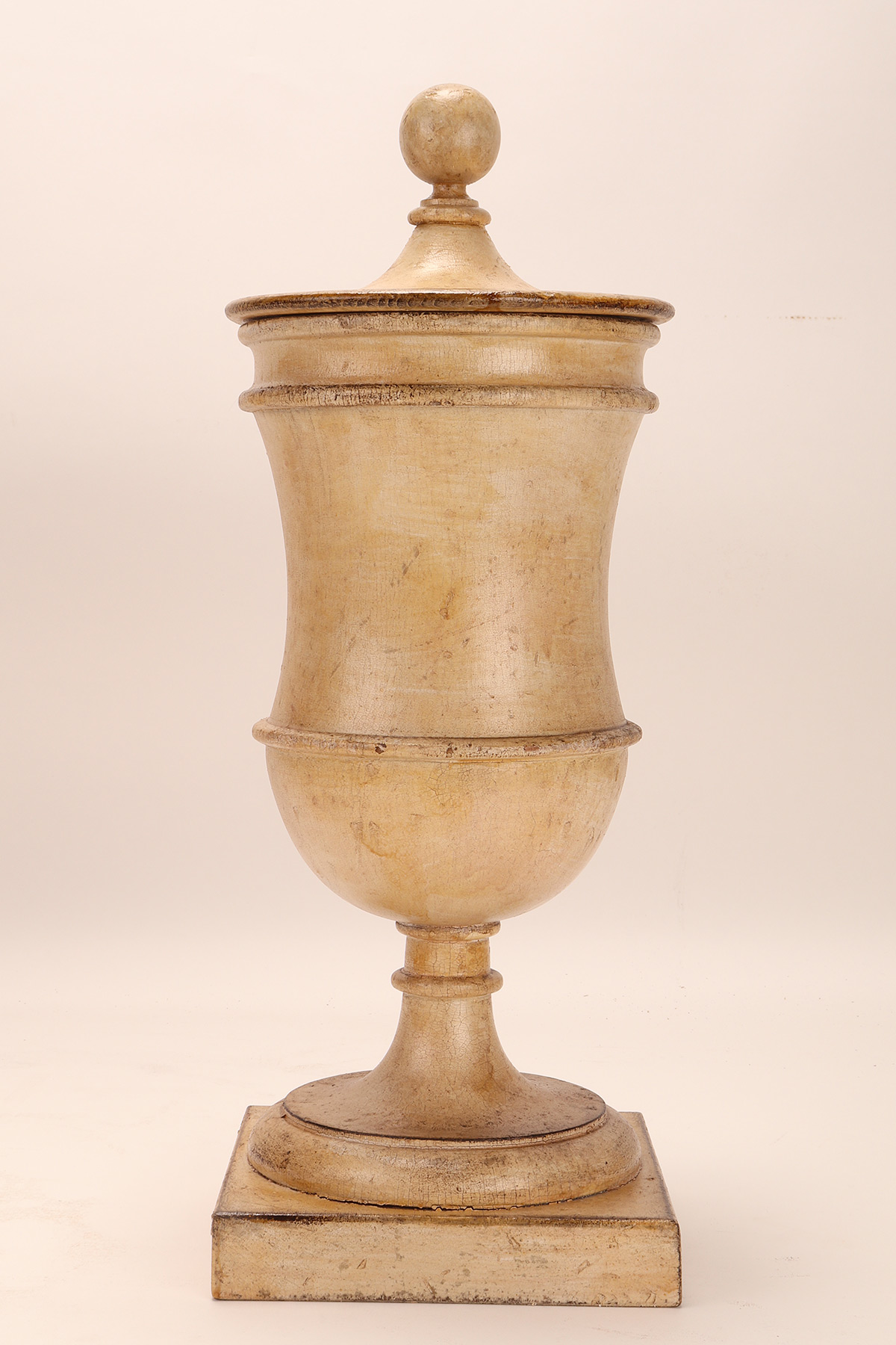 Set of nine big herbalist apothecary wooden jars (Mint leaves, Viola flowers, Verbena flowers, Pine needles, Dill leaves, Thyme leaves, Garlic bulbs, Hope flowers, Ginger roots), in the purest Neoclassical style. The surface is finished with pastiglia white-cream with saffron color cartouche and gold decoration finishing parts, the names of the herbs in black color. Proceeding from the herborist-apothecary of a convent in Sicily. Italy circa 1870. (Sold also separately).