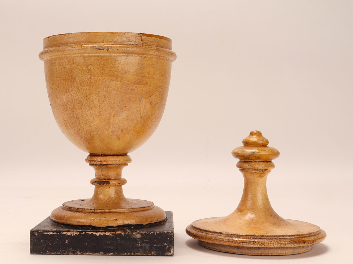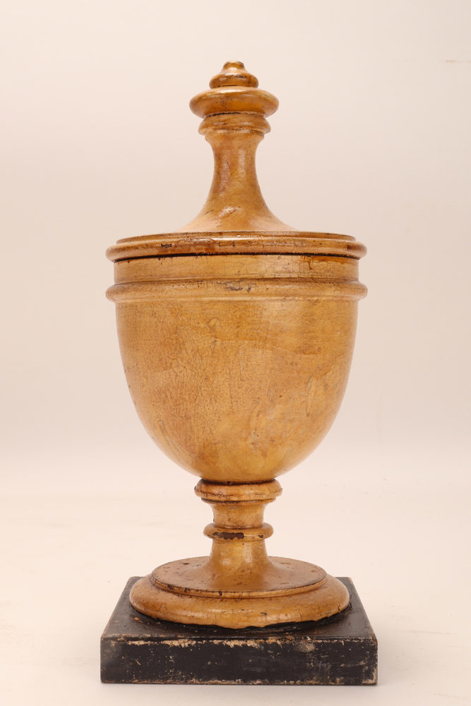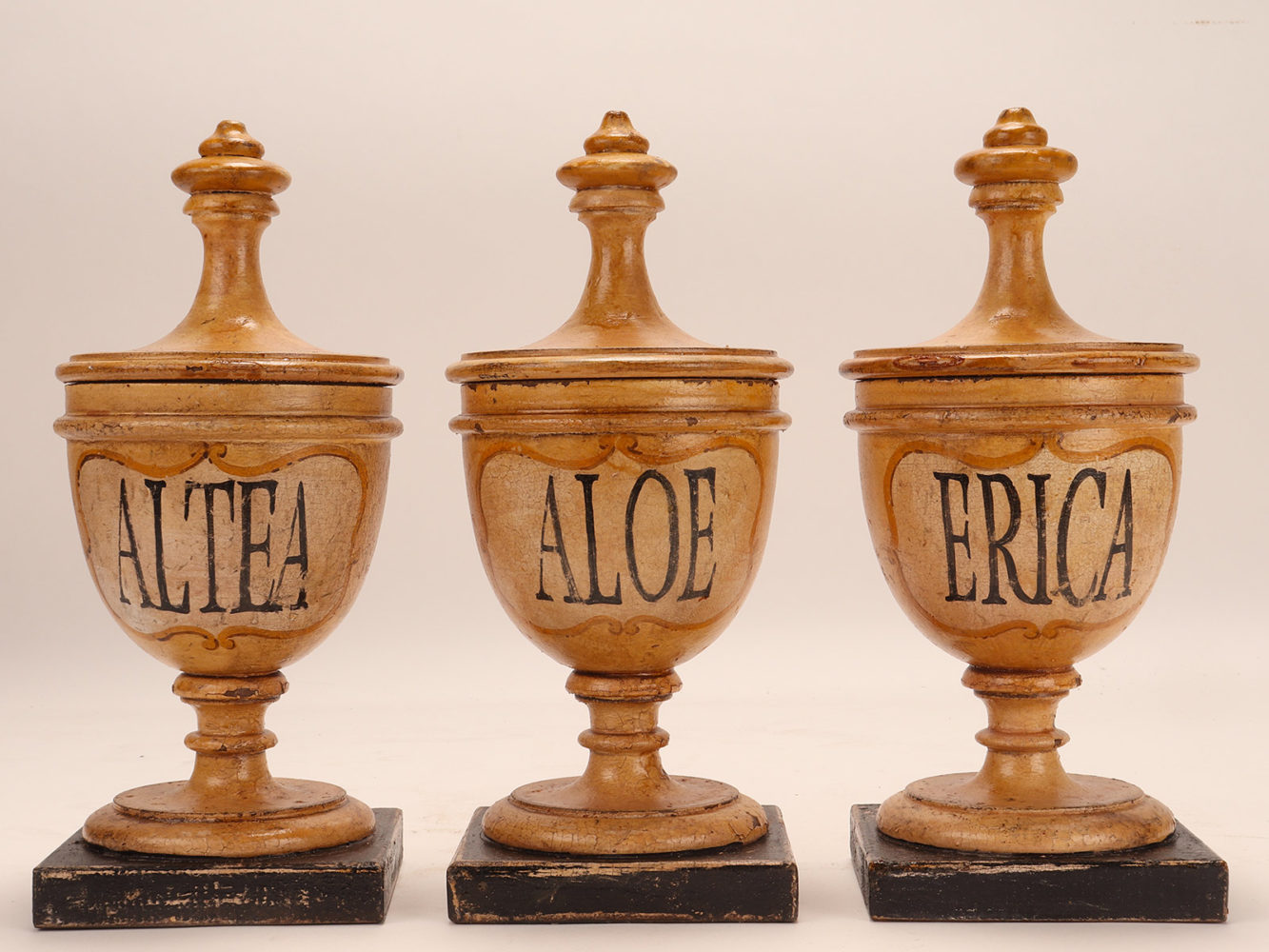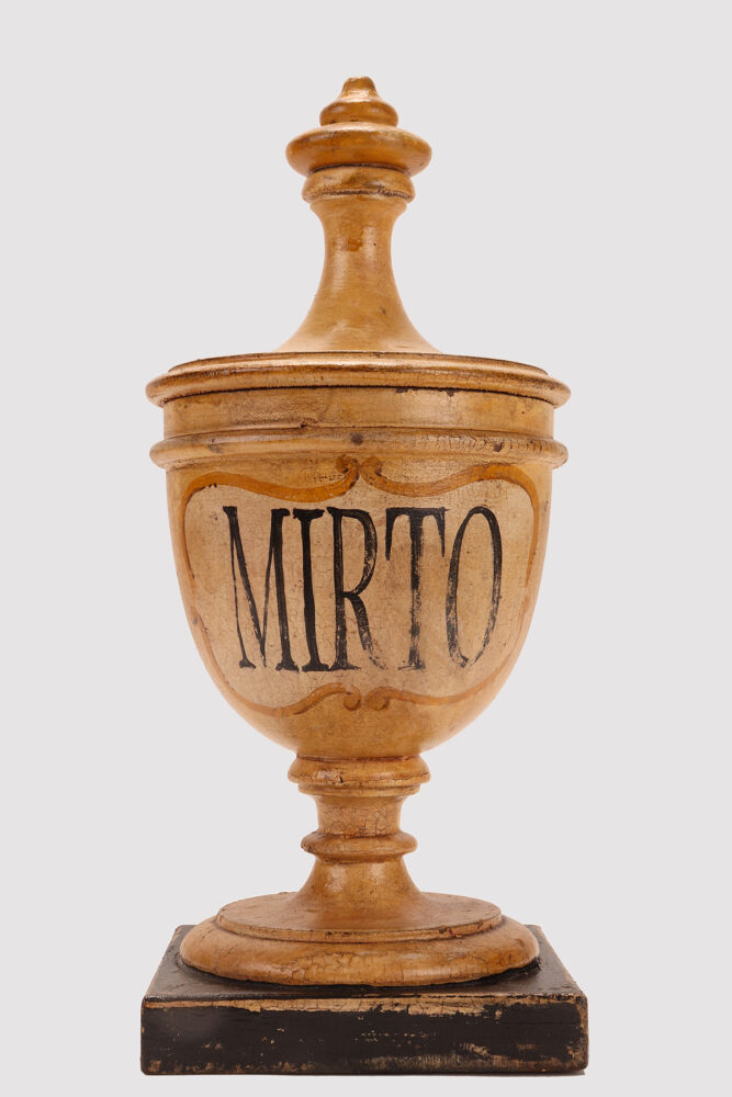 Set of four small wooden herbalist’s apothecary vases (Althaea flowers, Ginko leaves, Thistle flowers, Myrtle berries) in the purest neoclassical style. The surface is finished with cream-white pastiglia with saffron-colored cartouche and gold-decorated trim, the names of the herbs in black. Coming from the herbalist-apothecary of a Sicilian convent. Italy around 1870. (also sold separately).