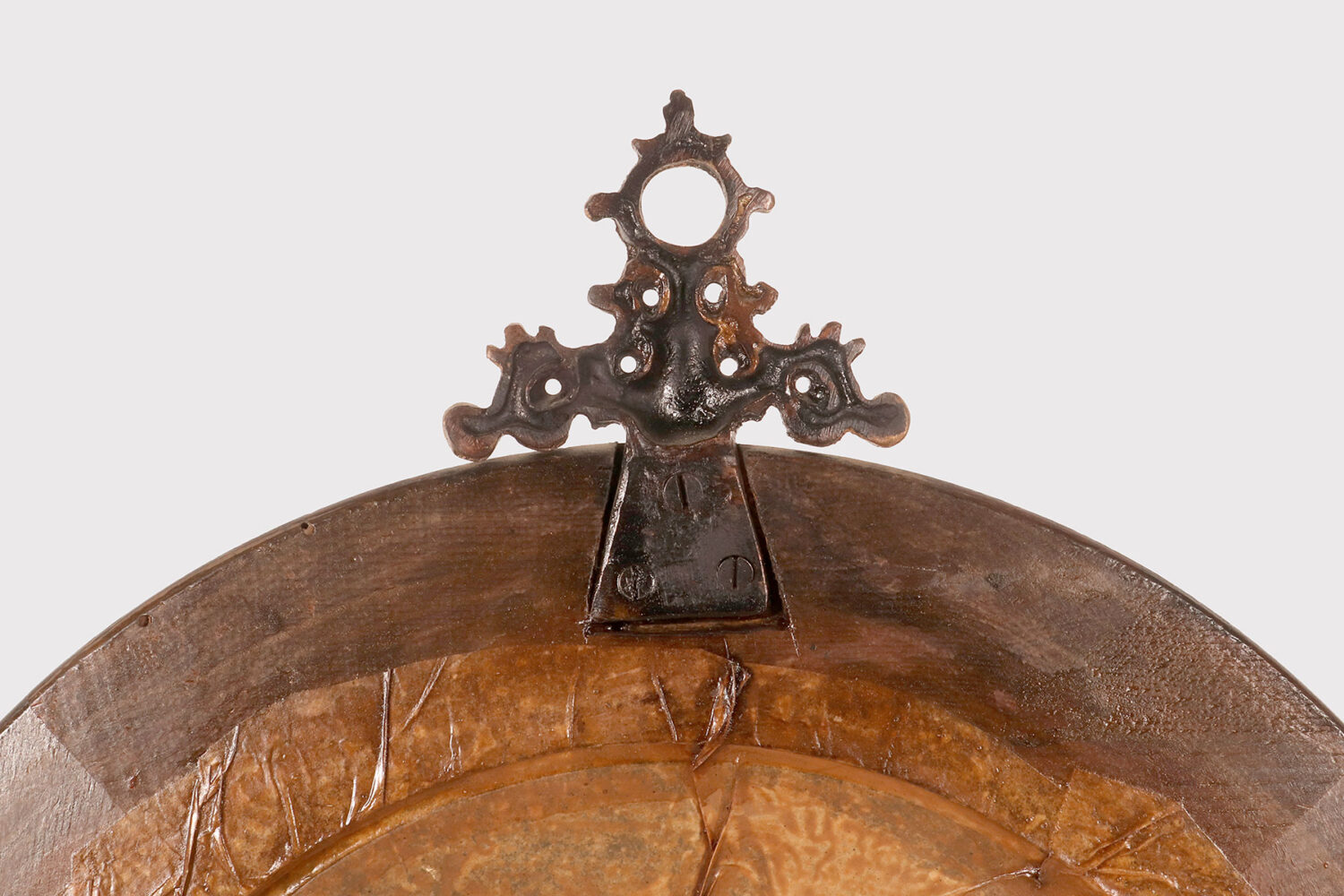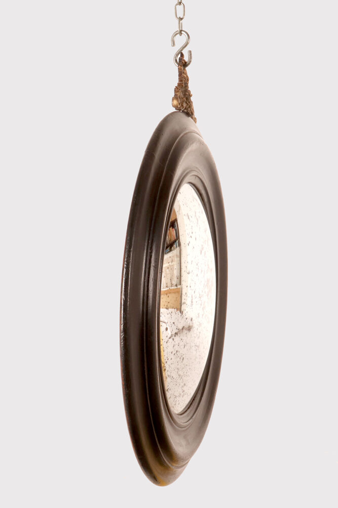 A medium-sized, round convex wall mirror, designed for a cabinet of curiosities, with a turned and ebonized softwood frame. At the top of the mirror is a gilded bronze hook depicting ribbons and an eyelet. Italy, late 19th century.