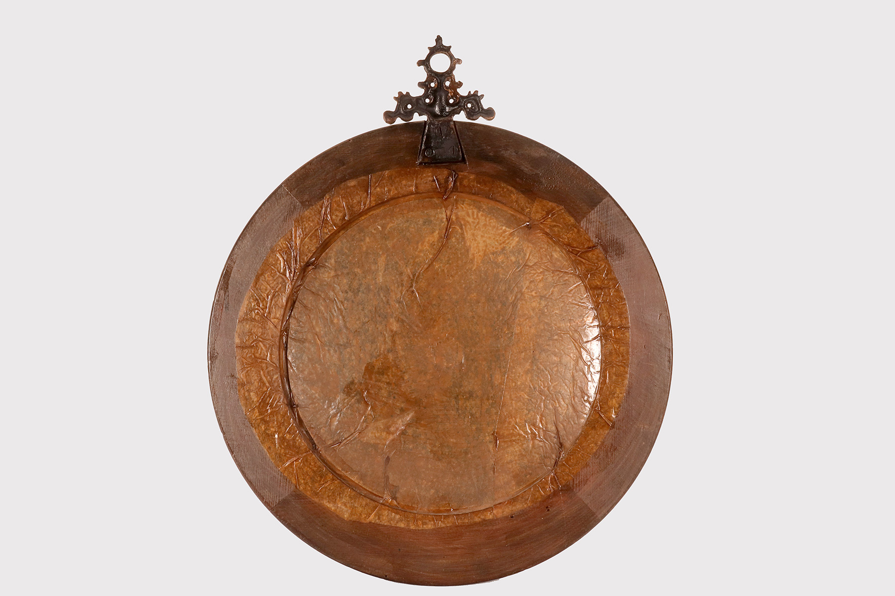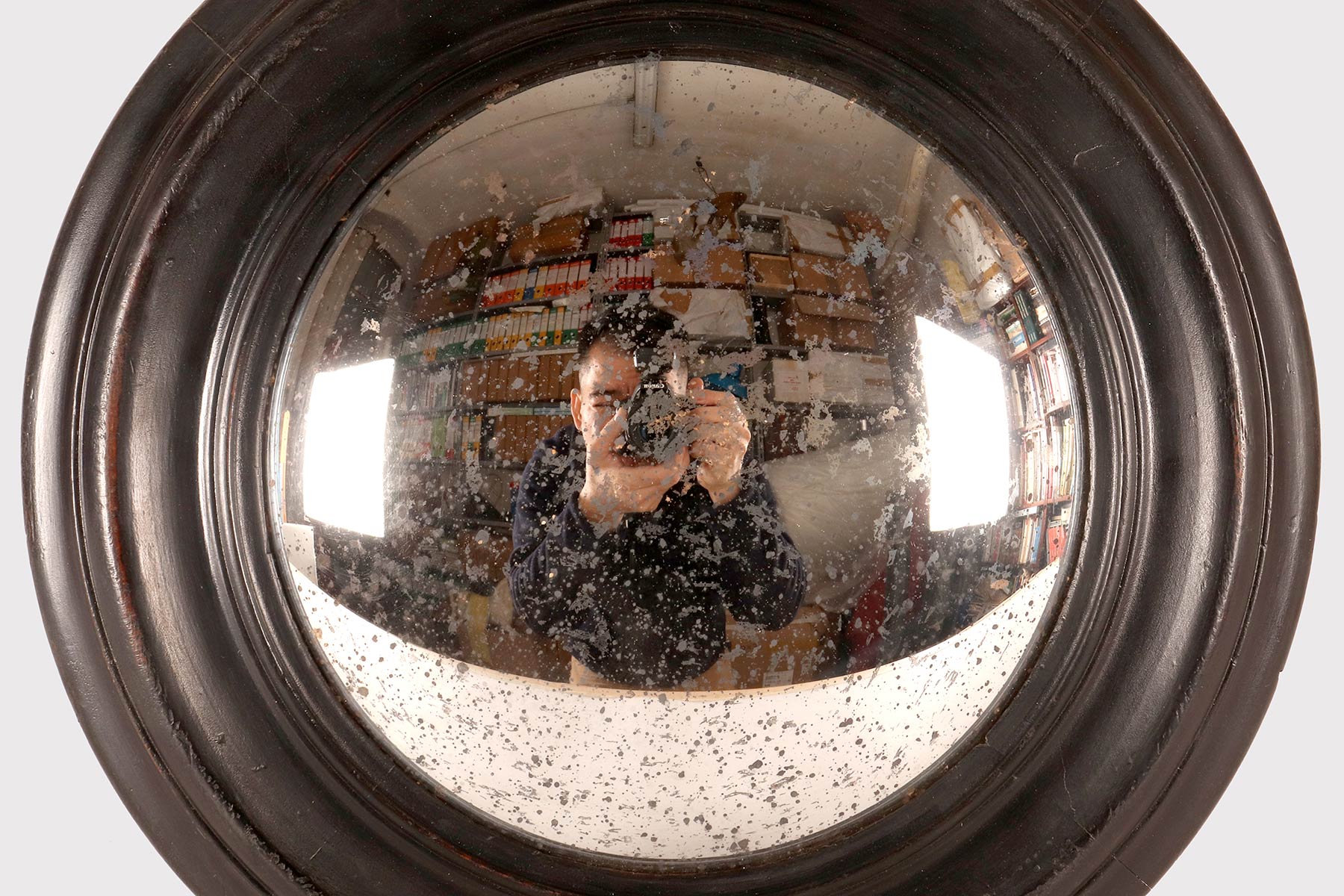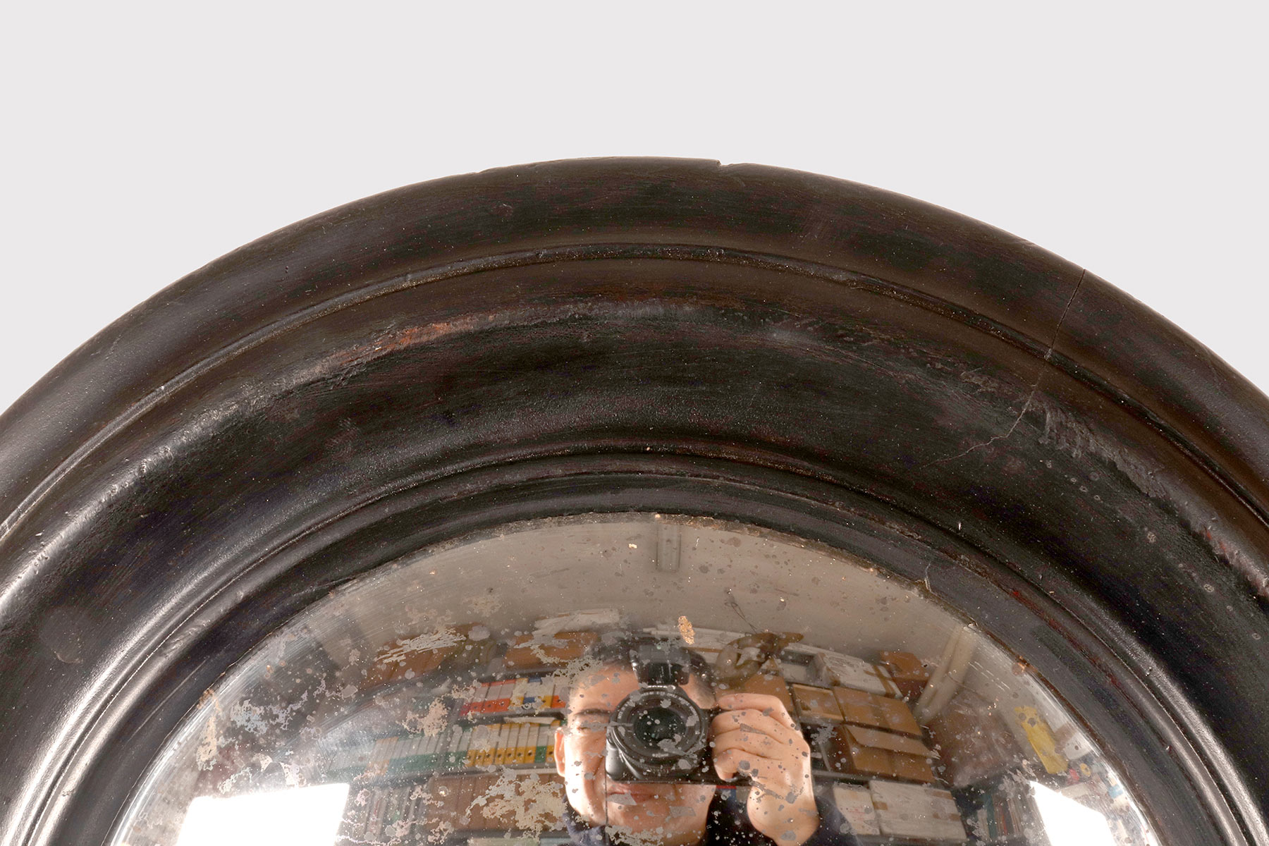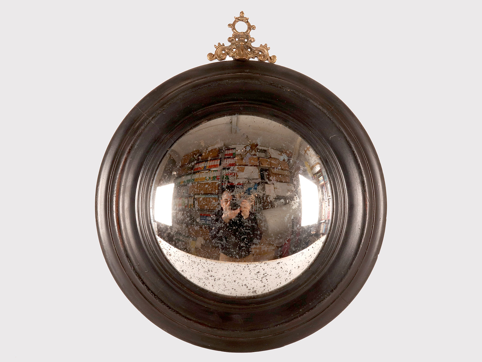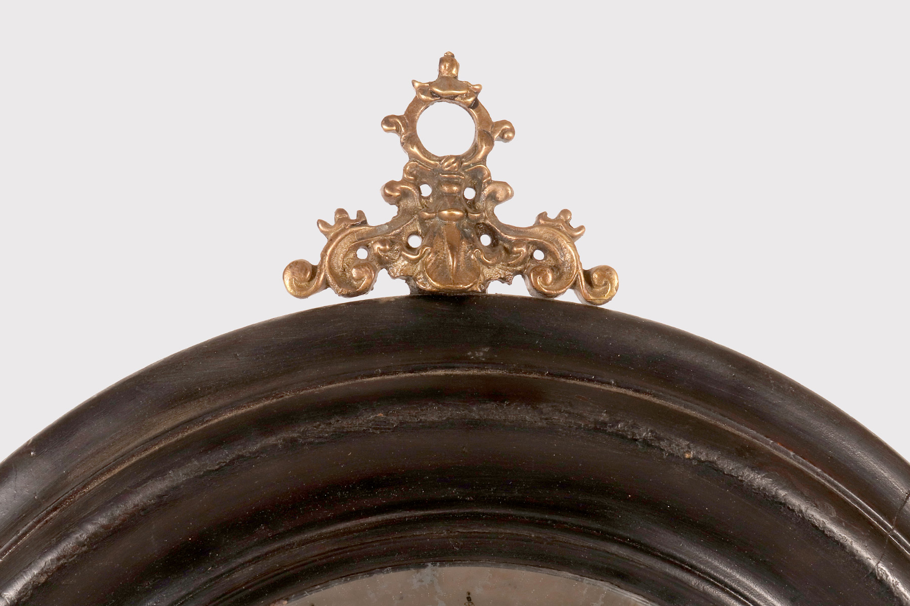 A medium-sized, round convex wall mirror, designed for a cabinet of curiosities, with a turned and ebonized softwood frame. At the top of the mirror is a gilded bronze hook depicting ribbons and an eyelet. Italy, late 19th century.