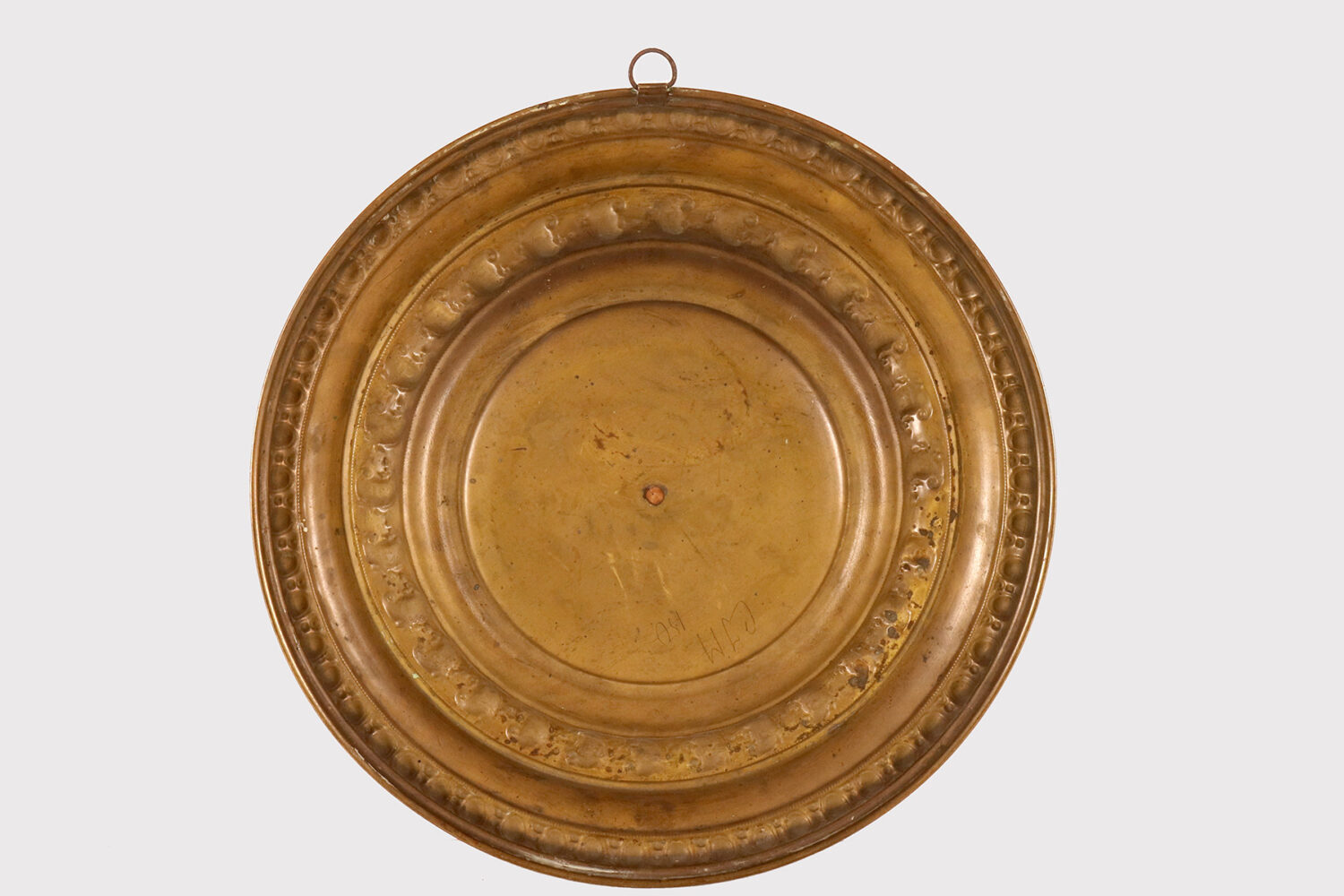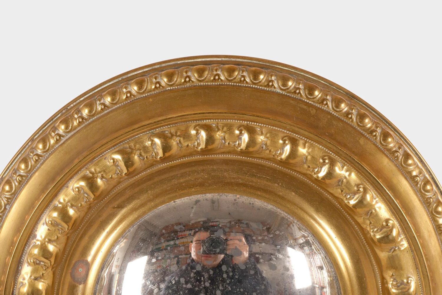 A Pair of round convex wall mirrors, used in a Wunderkammer, with embossed brass frames alternating with smooth sections. Late 19th century.