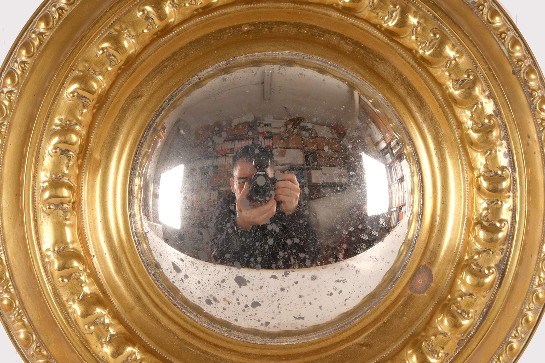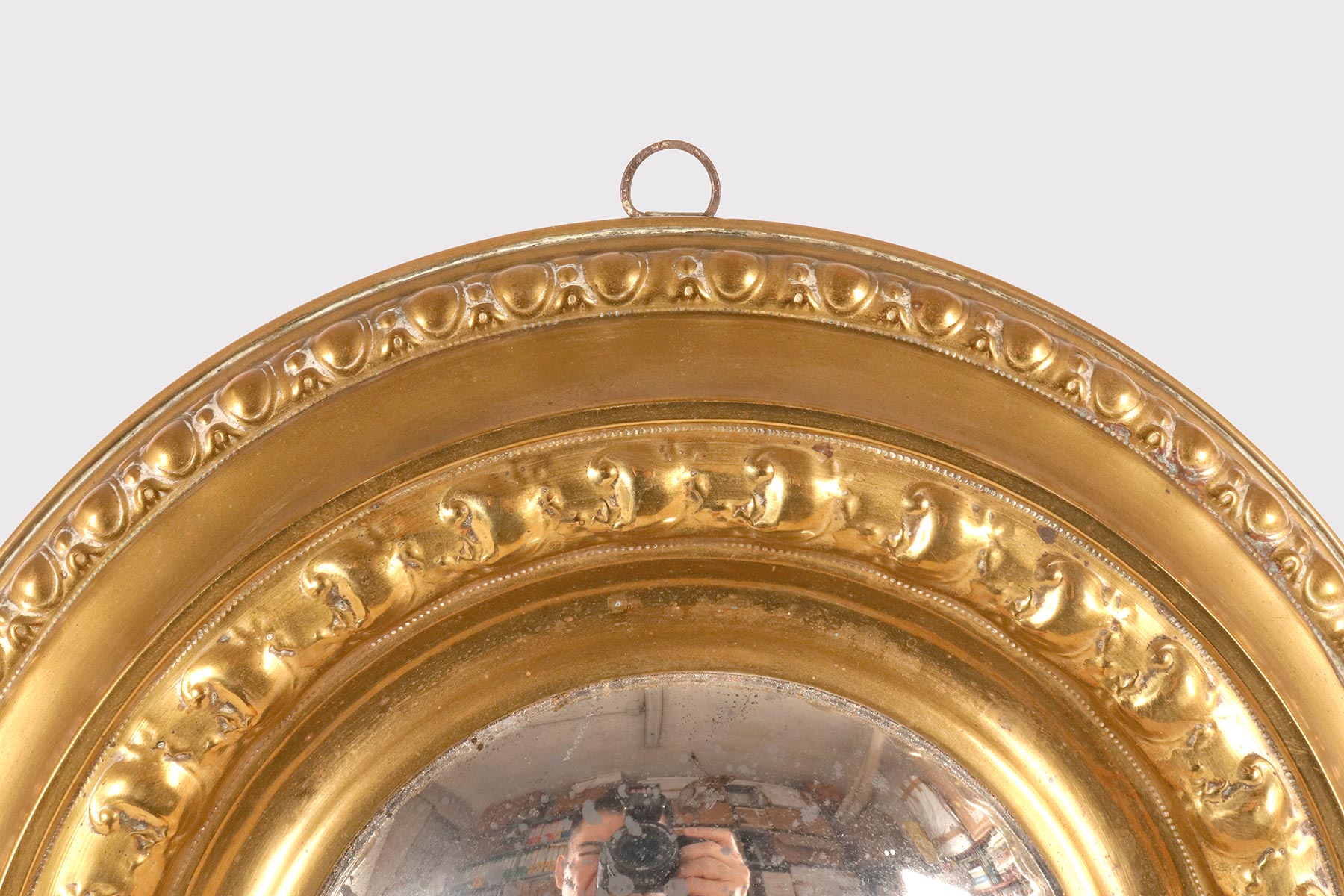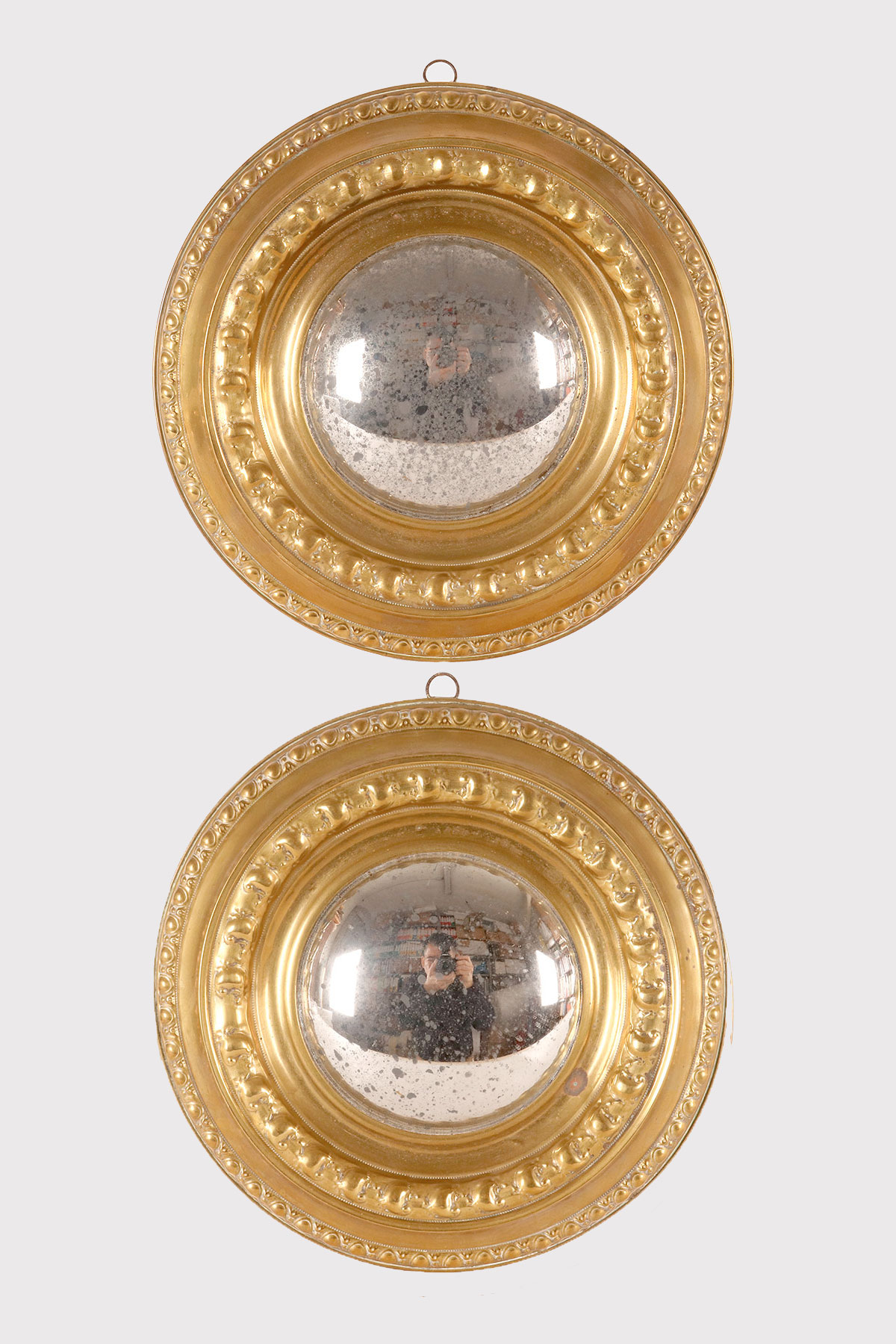 A pair of convex mirrors with smooth, embossed brass frames. Italy, late 19th century.