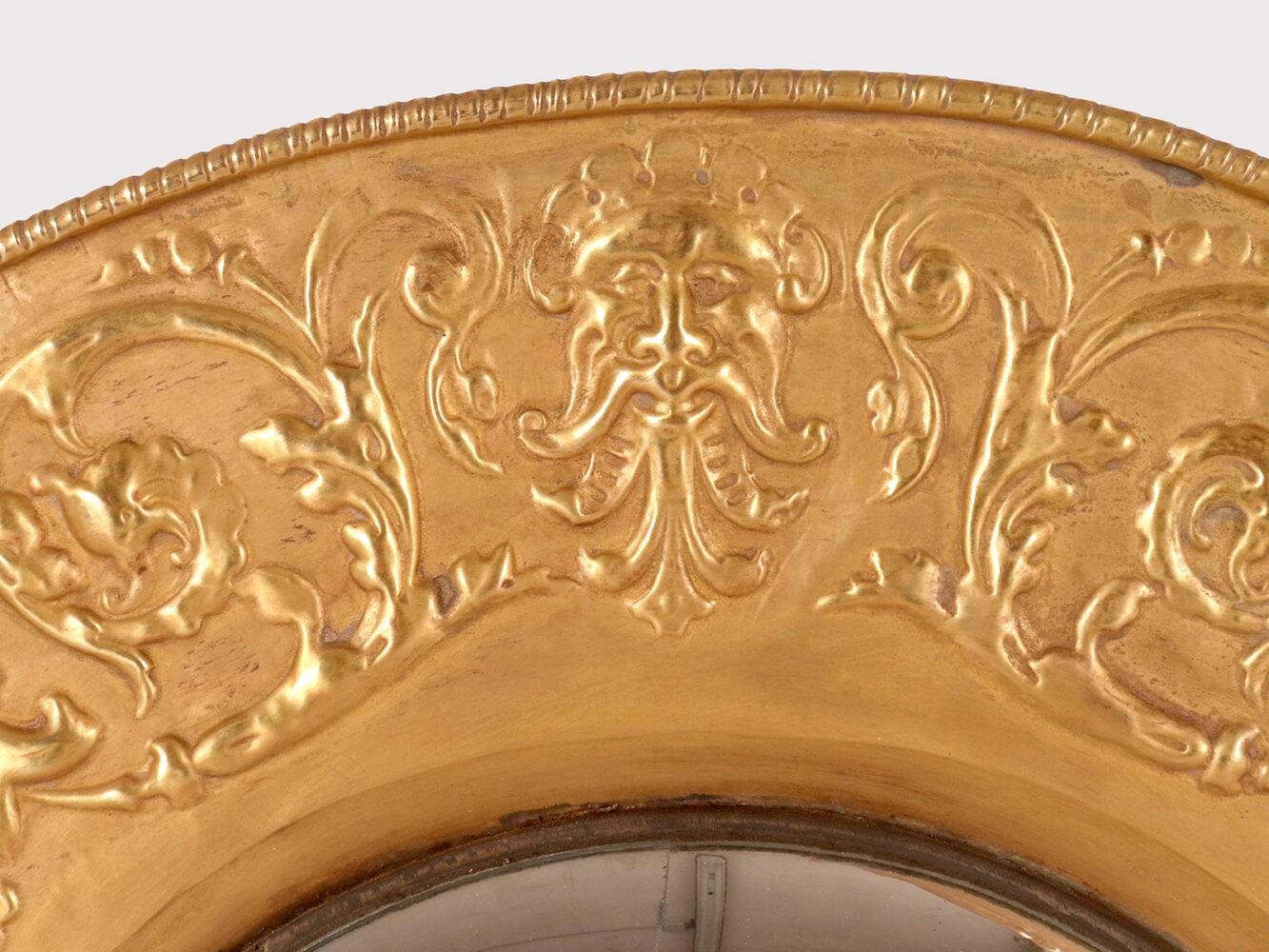 A pair of large convex mirrors, embossed brass frames with masks, griffins, and stylized plant motifs. Italy, late 19th century.