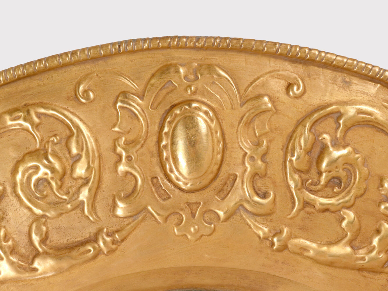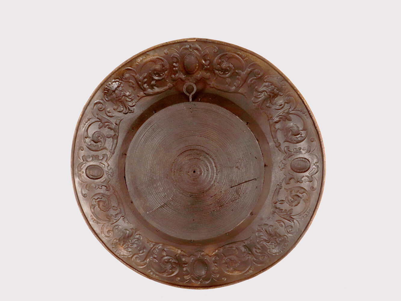 A Pair of round convex wall mirrors, used in a Wunderkammer, with embossed brass frames. The edges of the frame are decorated with masks, stylized griffins, and plant motifs. The mirror is mounted on a turned wooden base with an iron hook for wall mounting. Late 19th century.