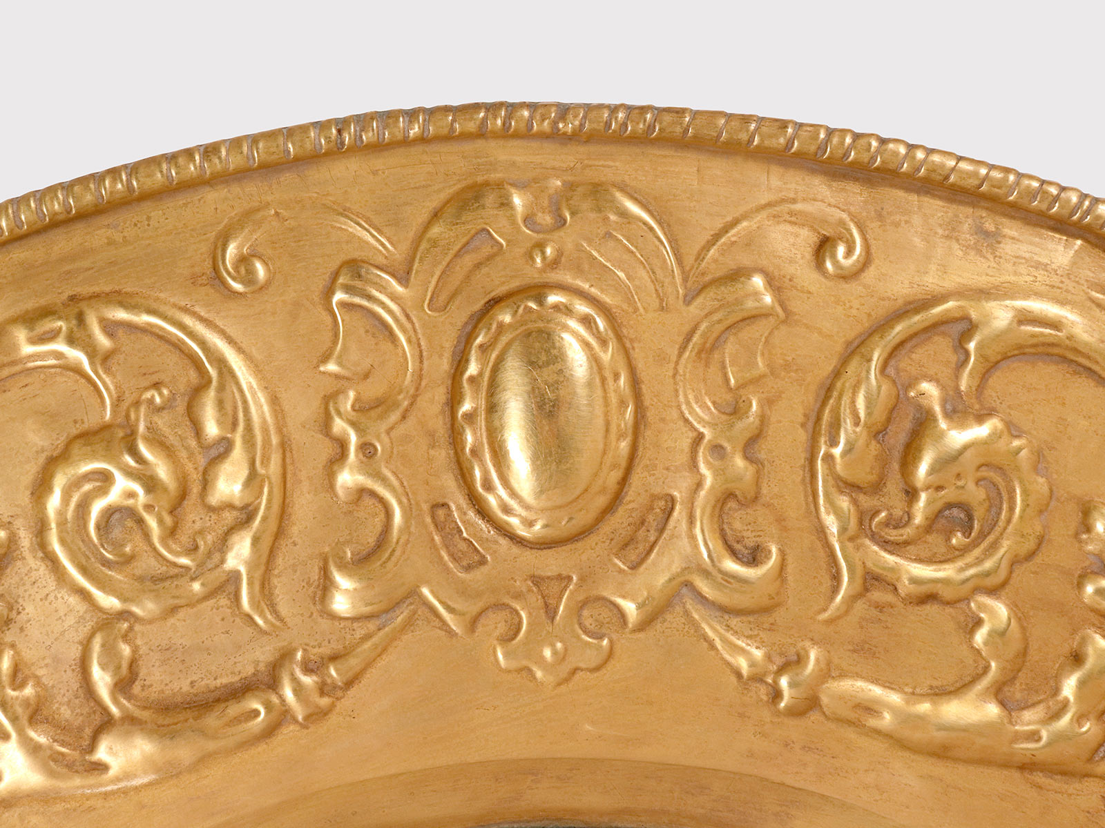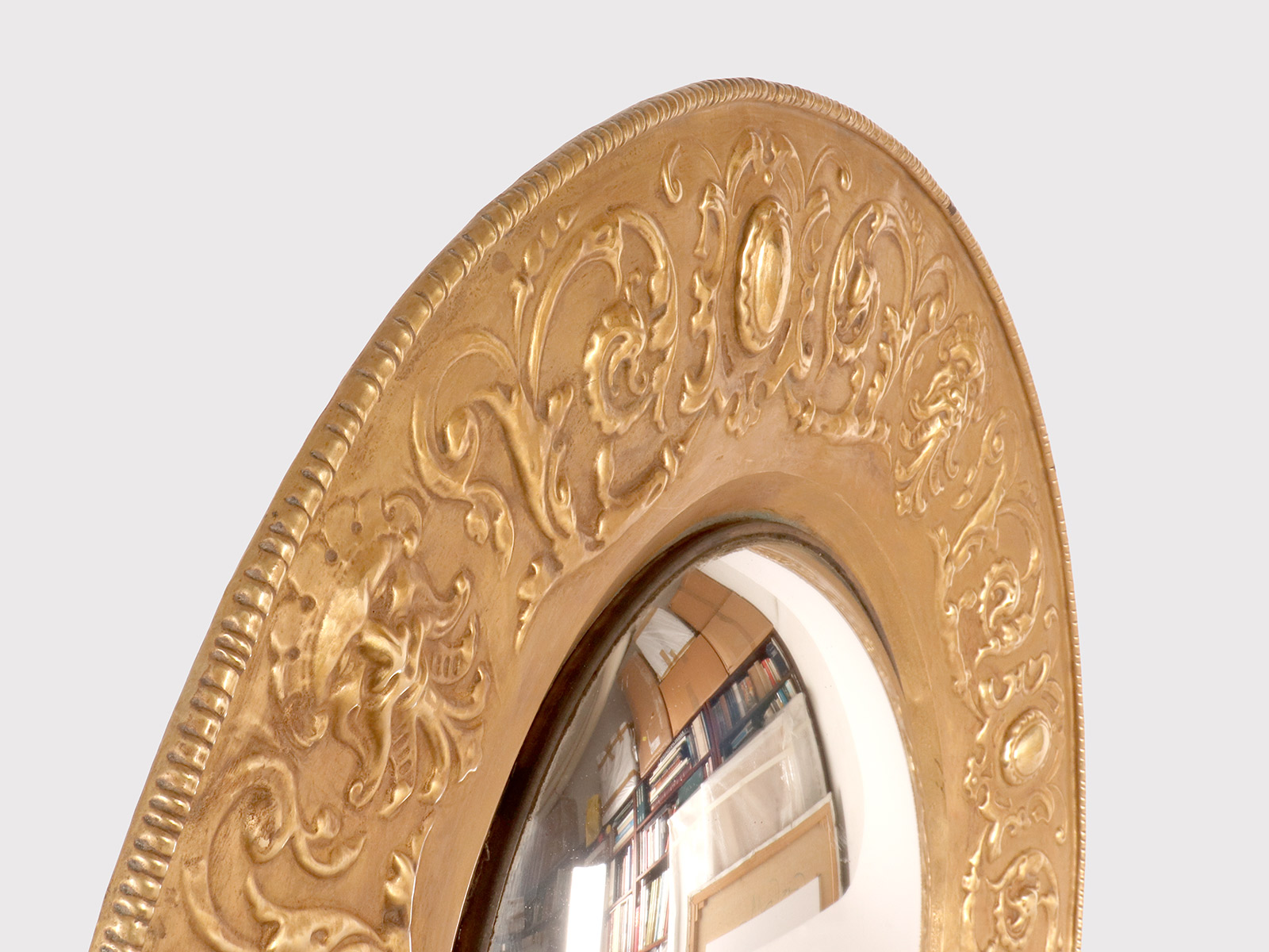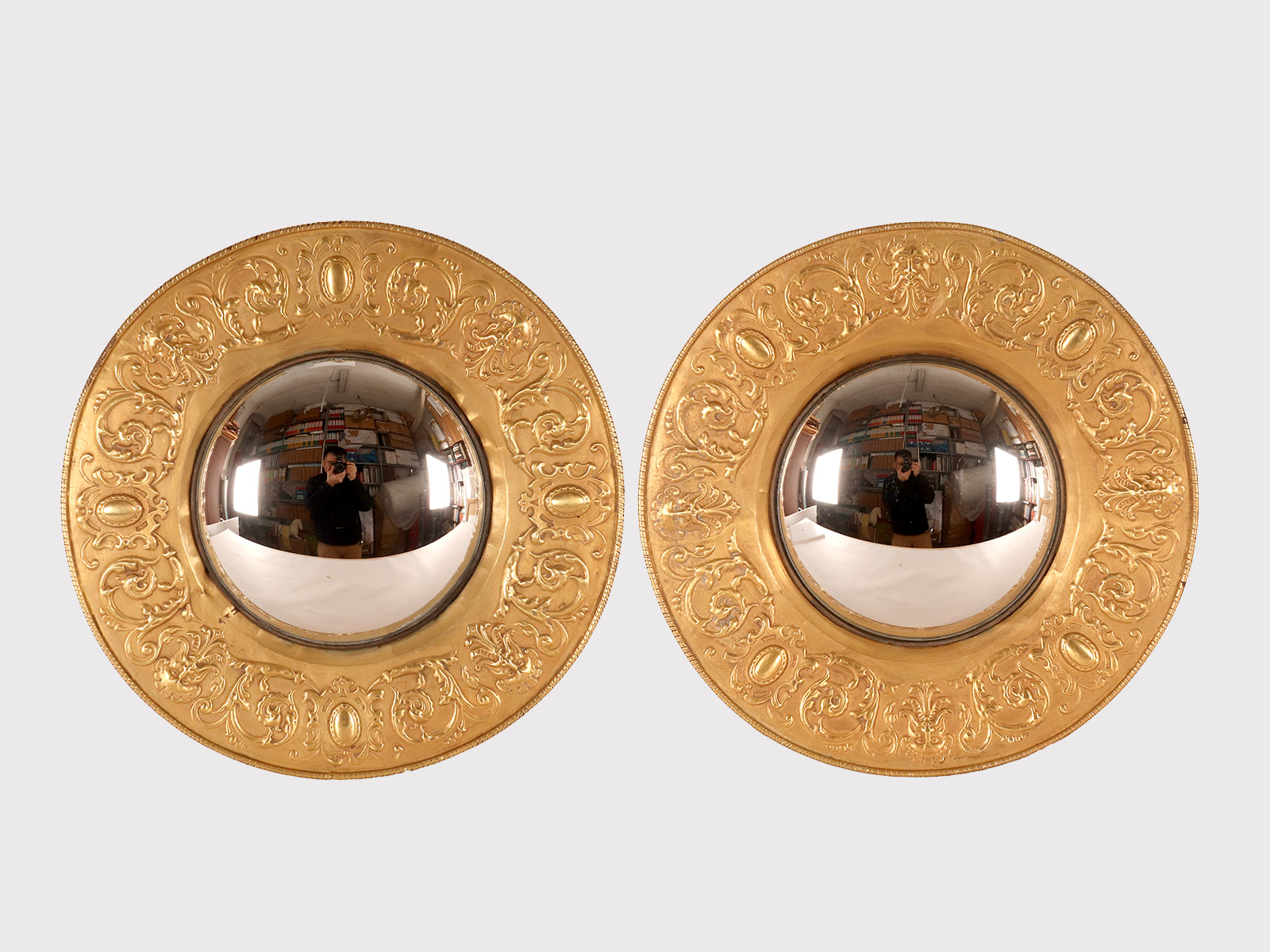 A pair of large convex mirrors, embossed brass frames with masks, griffins, and stylized plant motifs. Italy, late 19th century.