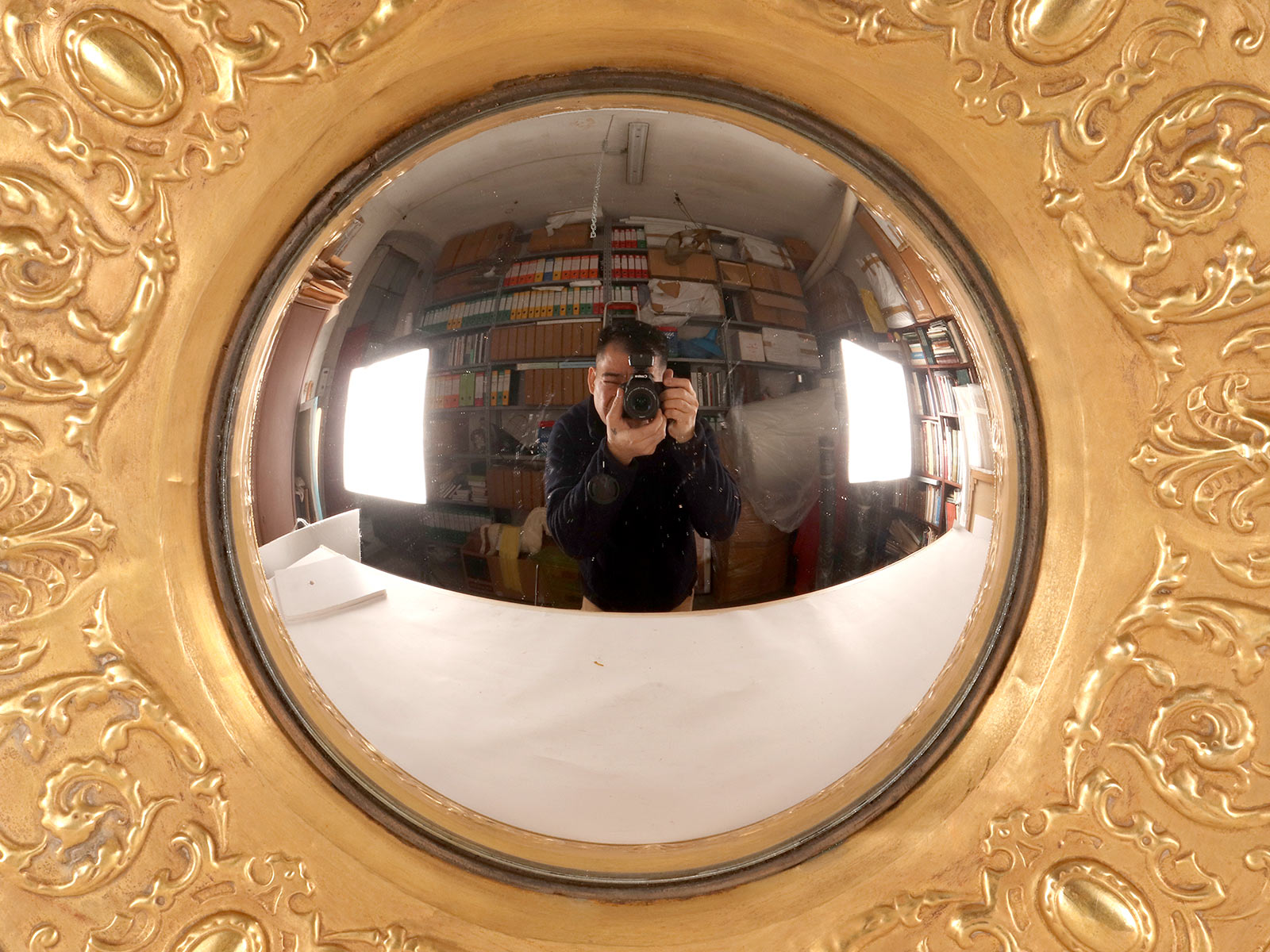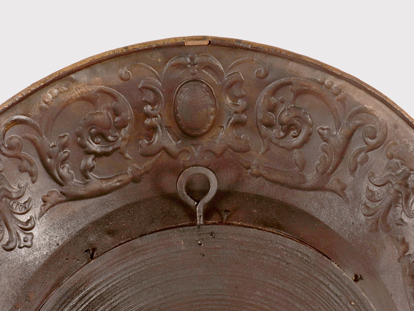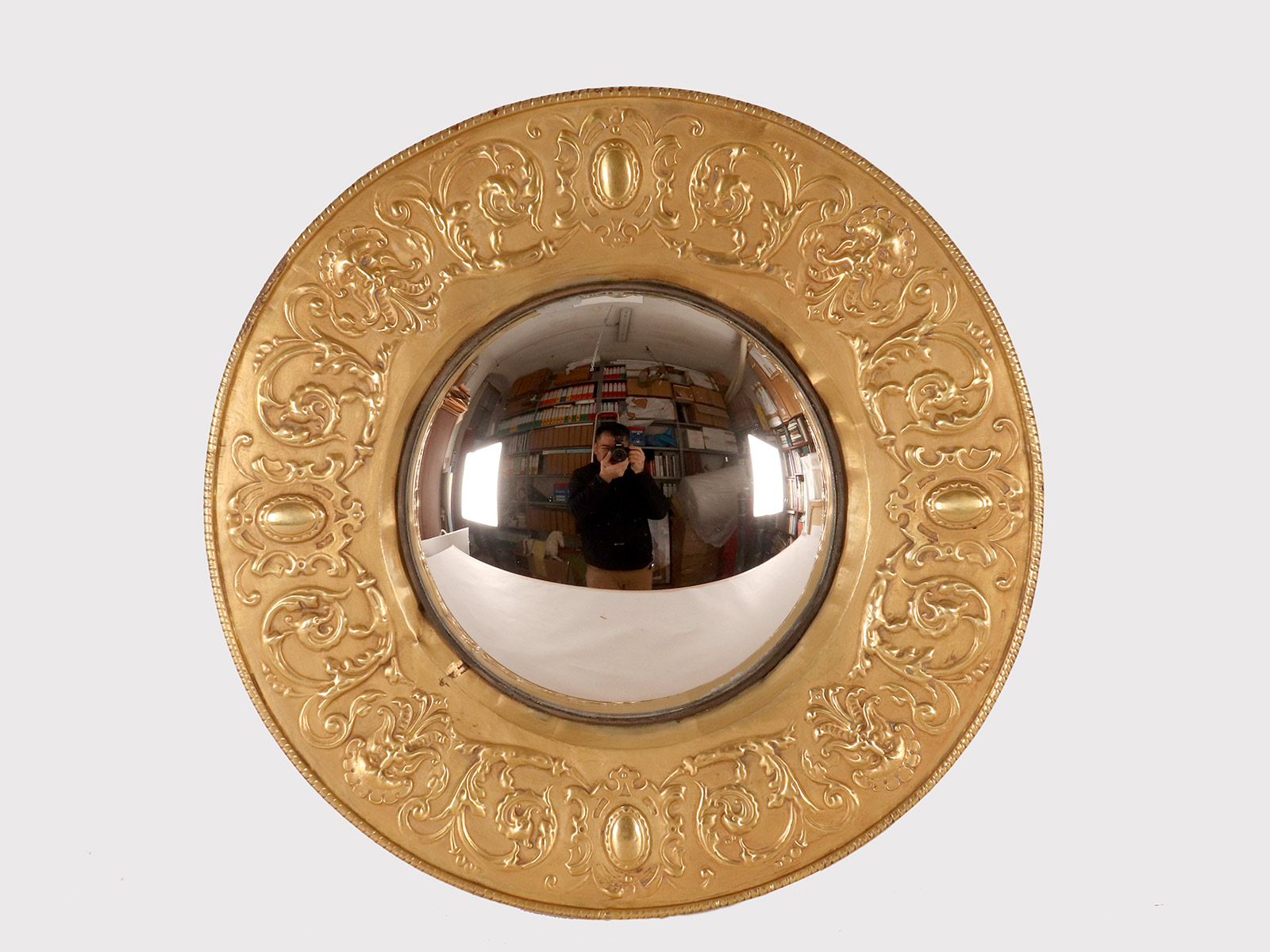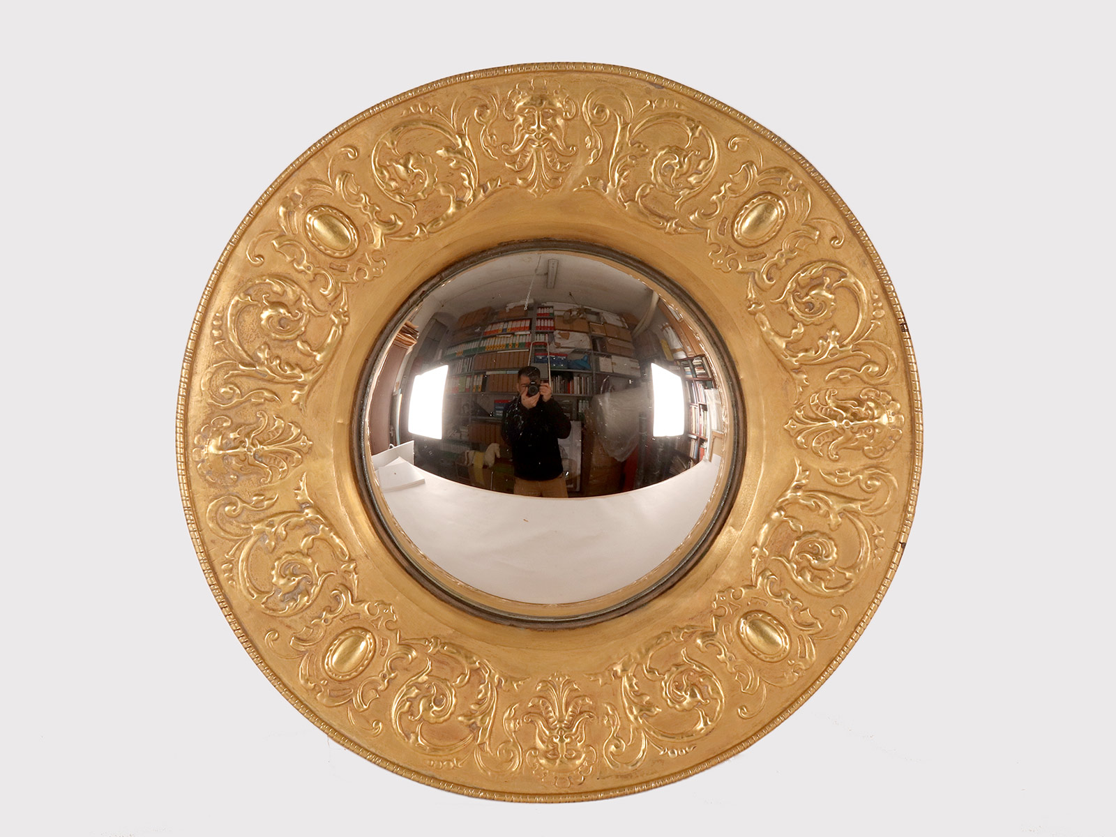 A Pair of round convex wall mirrors, used in a Wunderkammer, with embossed brass frames. The edges of the frame are decorated with masks, stylized griffins, and plant motifs. The mirror is mounted on a turned wooden base with an iron hook for wall mounting. Late 19th century.