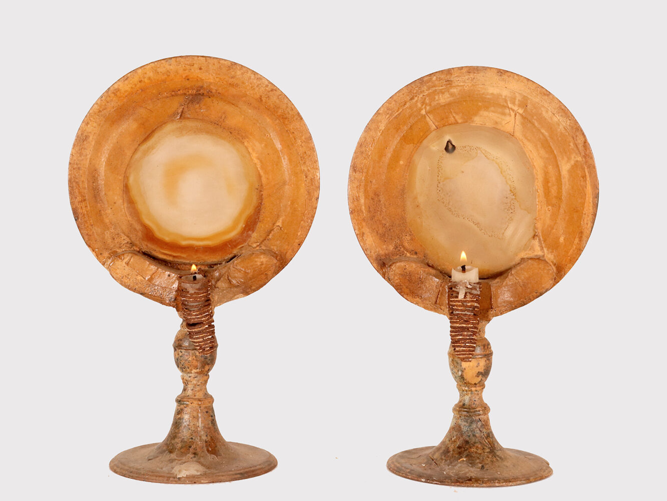 A pair of natural agate specimens with candle holders, Italy 1880.