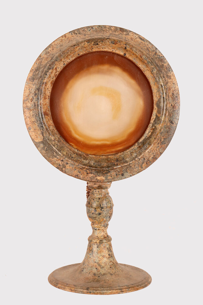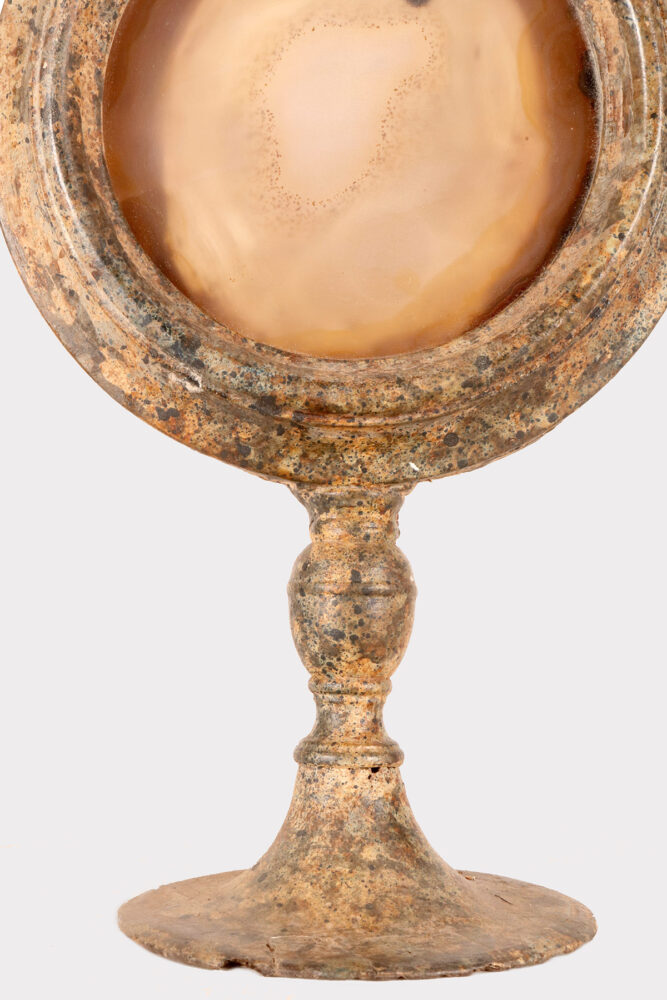 A pair of round natural agates from the Wunderkammer collection, set in a gray lacquered fruitwooden frame with a marbled effect, mounted on a matching fruitwooden base. A spiral iron candle holder is on the back. Italy, circa 1880.