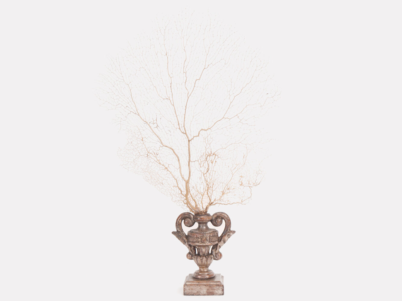 A sand-white gorgonian branch from the Wunderkammer in the shape of a fan. The base is in carved and silvered wood in the shape of a vase with volutes. Italy, circa 1870.