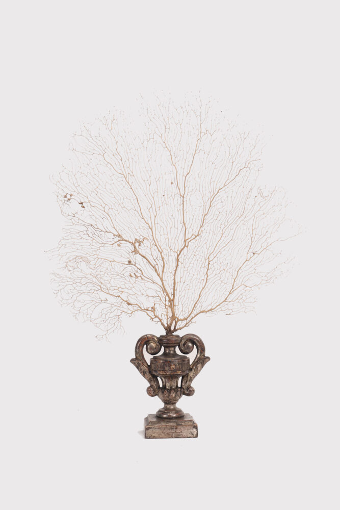 A pair of sand-white gorgonian branches from the Wunderkammer in the shape of a fan. The bases are in carved and silvered wood in the shape of a vase with volutes. Italy, circa 1870.
