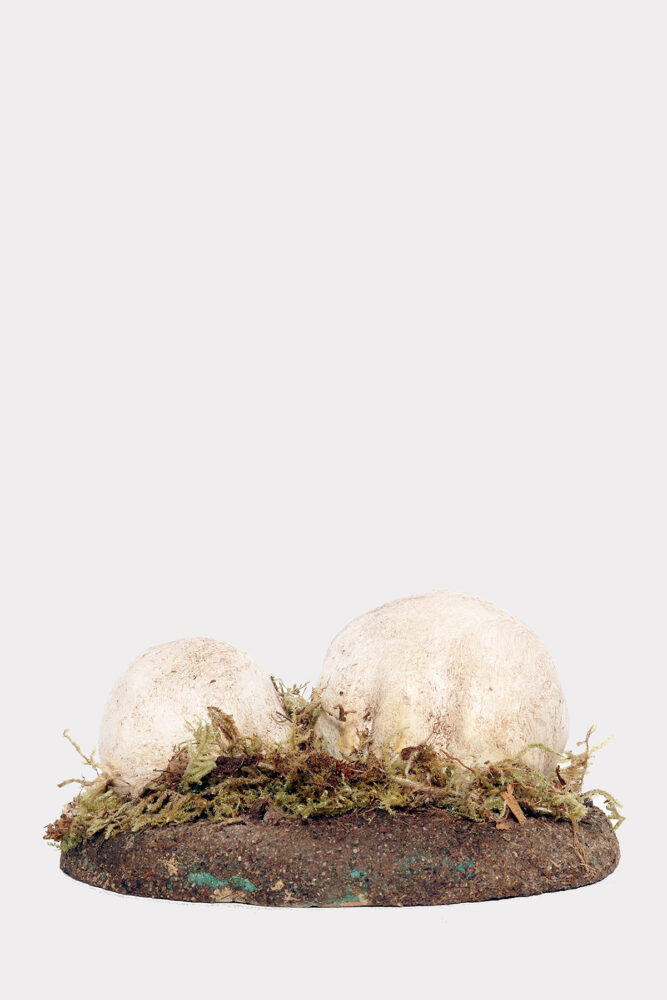 A pharmacy model of a specimen of Agaricus Bisporus Imbach mushroom, made in painted plaster, on a green oval-shaped plaster base with moss and hay. Italy circa 1950.