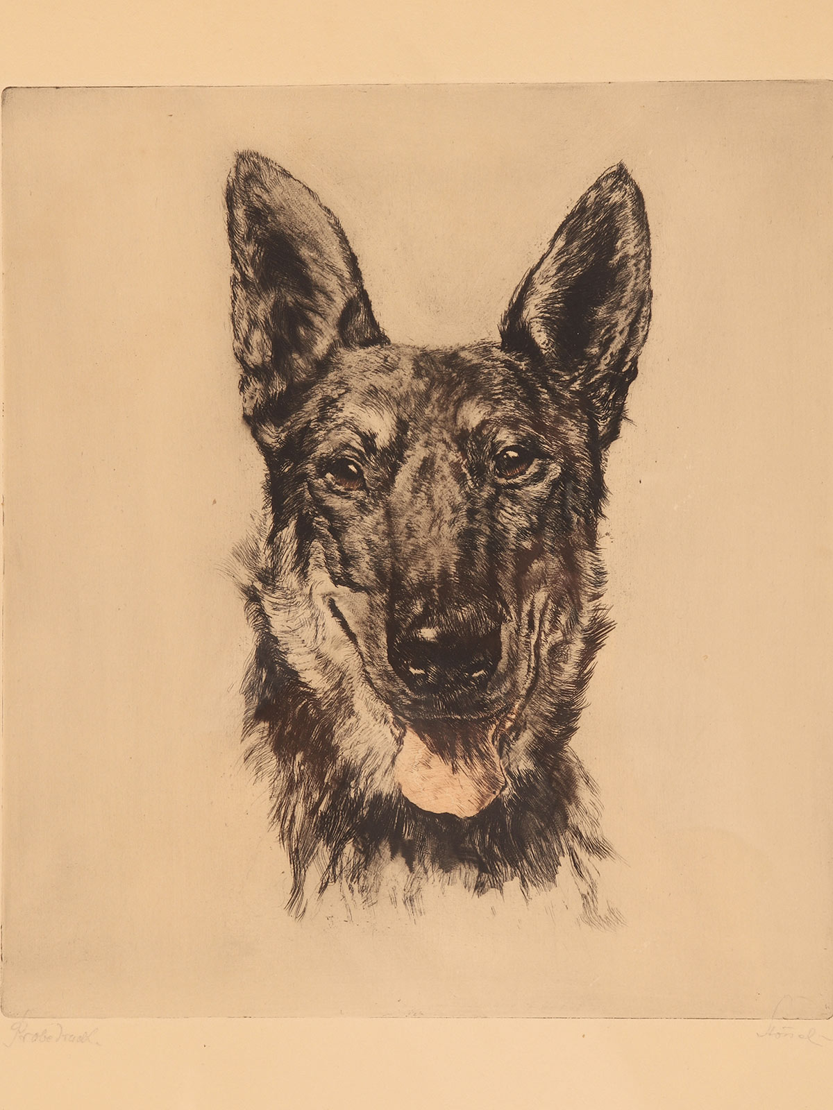 A print mixed technique: the portrait of a German shepherd dog’s head. Signed. Solid wood frame in briar veneer wood. Germany circa 1930.