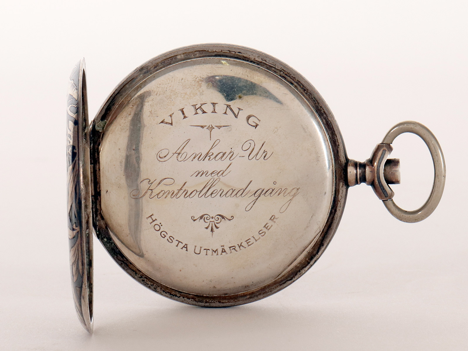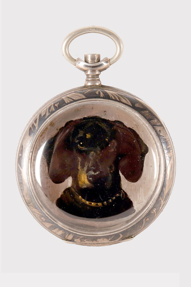 The pocket watch case is made of 800/100 silver. The entire back of the case is decorated with the niello technique, a refined inlay of a black metal alloy in the grooves or spaces left by the engraving of a silver surface. The scene depicts two hunters, one of whom is gilded, in action in a thicket. The leaf decoration also continues on the edge of the front cover. Opening the back of the case, we find an engraving in Swedish: “VIKING ANKAR UR MED KONTROLLERAD GÅNG / HÖGSTA UTMÄRKELSER” (VIKING ANCHOR WATCH WITH CONTROLLED MOVEMENT HIGHEST EXCELLENCE). The case, made in Switzerland, was prepared for the Swedish company Viking. Fritz & Albert Huguenin (Huguenin Freres), Le Locle, Switzerland, the makers of the case, are identified by the mark ‘NIEL HF’ surrounded by a clover, clearly visible on the inside of the case. The case, which never became a watch (the Swedish import marks are missing), was used to create a striking enamel portrait of a black dachshund’s head on the back of the case. Switzerland, circa 1890.