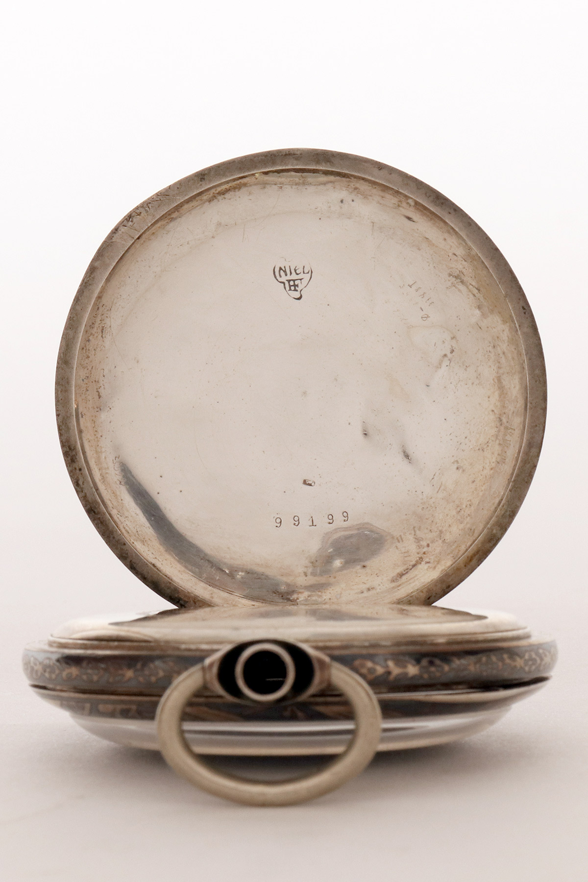 A rare niello and silver watchcase with a hunting scene, containing a miniature dachshund. Huguenin Fréres, Le Locle, Switzerland, late 19th century.