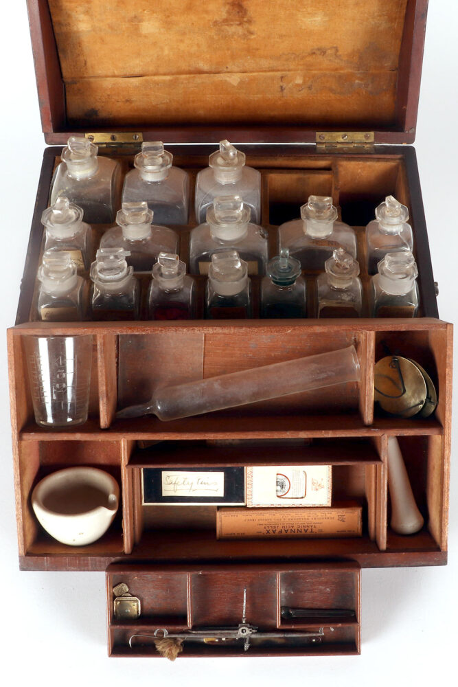 English travelling apothecary made of mahogany Sipo mahogany (Entandrophragma utile) and brass with a rectangular base, a front drawer, an opening top and U-shaped metal handles. The top is protected by the lid and is divided into compartments with nine smaller bottles, six larger bottles (one chipped) and some scientific glasses to be assembled with their brass support. Inside the lid is an opening pocket for documents. The lower part of the chest is a drawer, secured during travel by a long brass needle that acts as a stopper. This is also divided into compartments containing a removable scale with weights, a mortar and pestle, a graduated glass apothecary jug, a glass measuring cup. Great Britain, late 18th century.