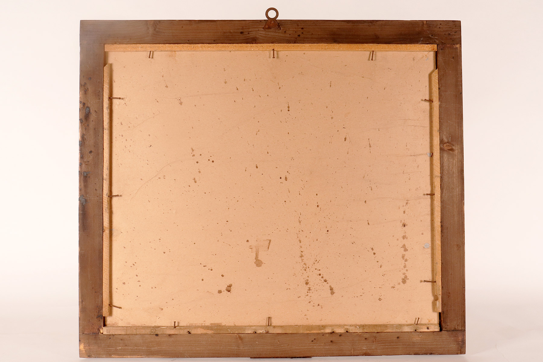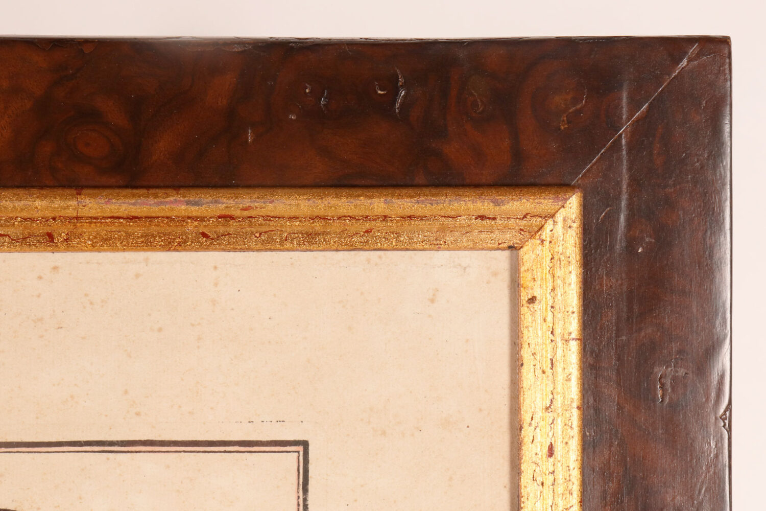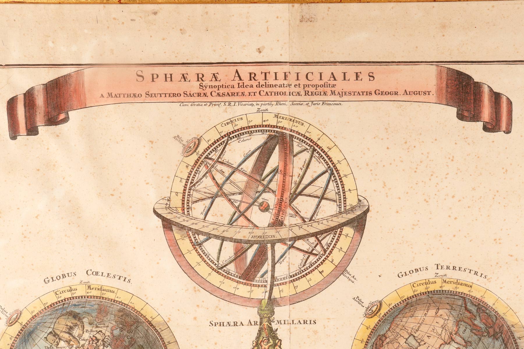 A watercolor engraving on paper, depicting a terrestrial globe, an armillary sphere and a celestial globe. Fir wood frame, walnut briar veneer, with gilded ramin wood edge. Mattäus Seutter, Augsburg, Germany circa 1740.