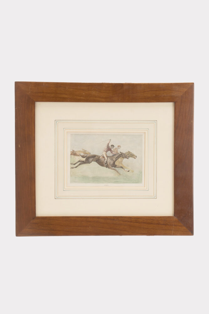 A watercolor finished print, depicting a galloping horses with jokeys. Frederic Remington. Solid cherry wood frame, polished and beeswaxed. United States circa 1900.