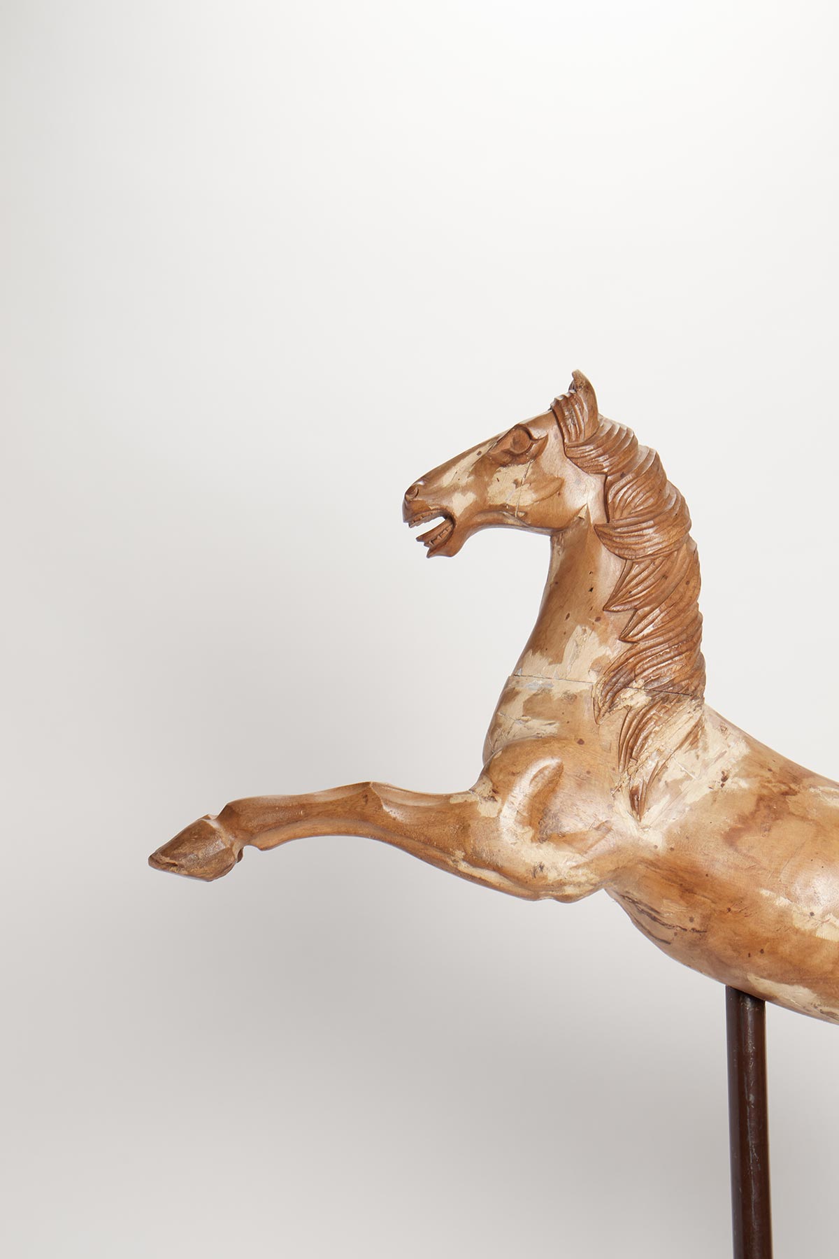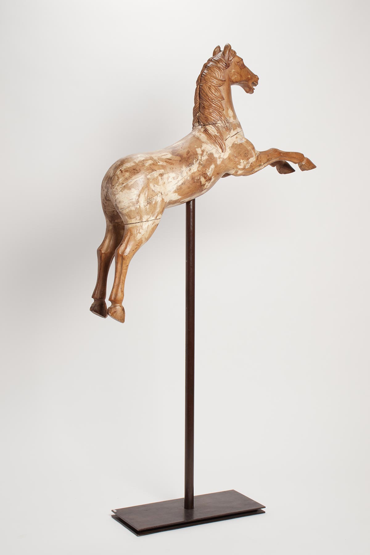 Italian wooden sculpture depicting a carousel horse launched in the act of ramping. Pale fruitwood. Modern metal base. The measurement refers to the horse only. Italy mid-18th century.