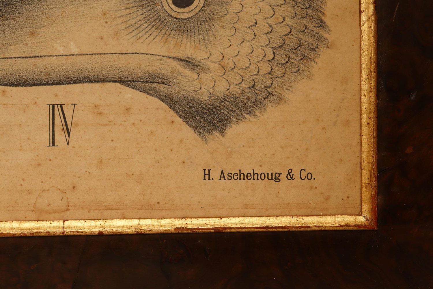 A chromolithographic print on paper by P. Dybdahls, depicting an anatomical table (Pl. 33) of birds. Fir wood frame, walnut briar veneer, with gilded ramin wood edge. H. Aschehoug & co, P.M. Bye & co. Oslo, Norway, late 19th century