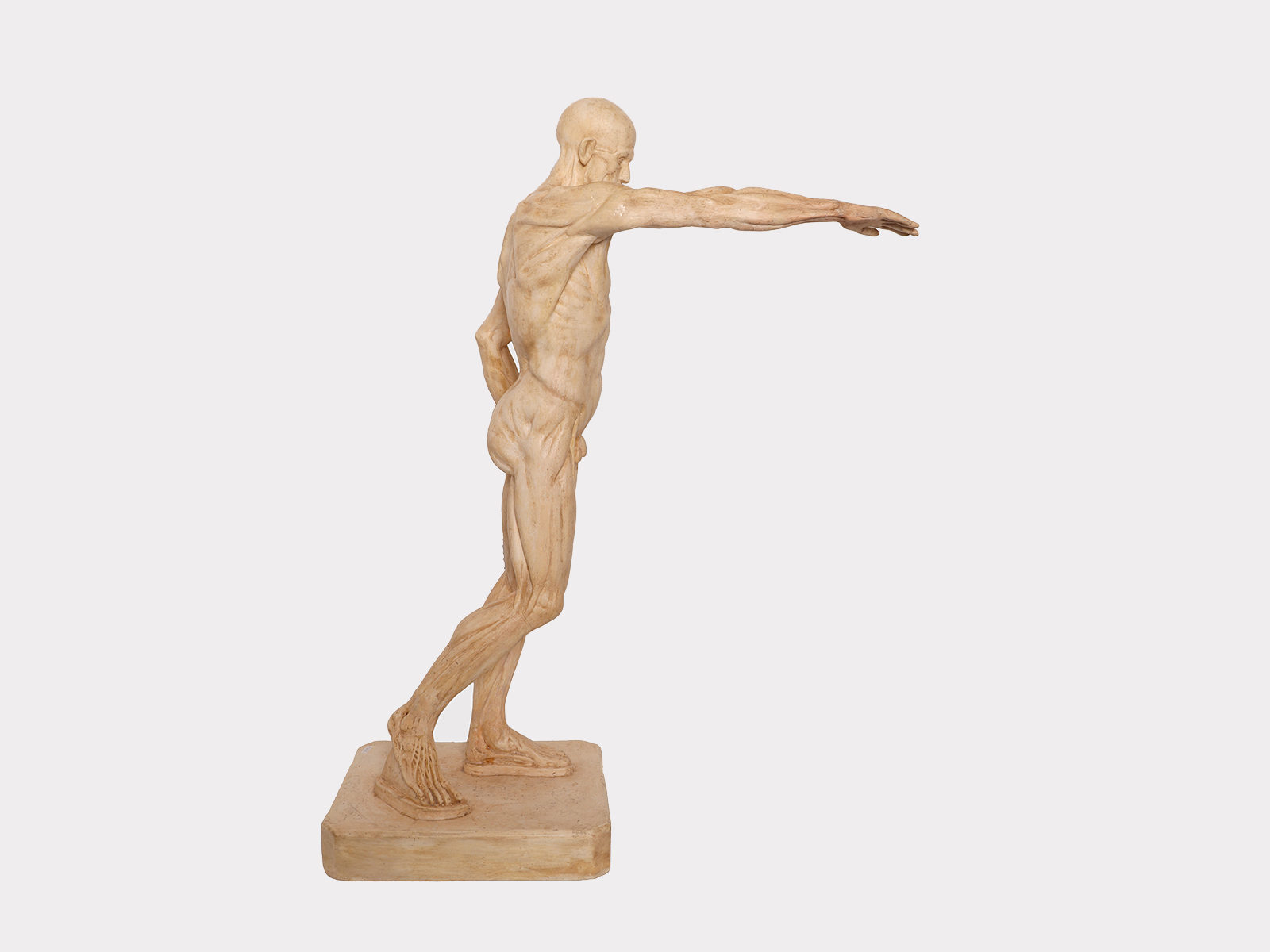 The anatomical sculpture, cast out of plaster, depicts a flayed man standing over a rectangular base in a classical pose with lifted arm. Anatomical study purpose. Italy circa 1880.