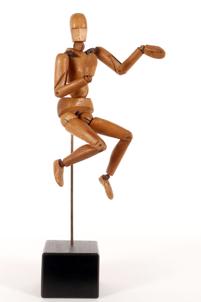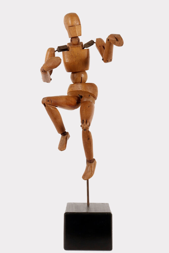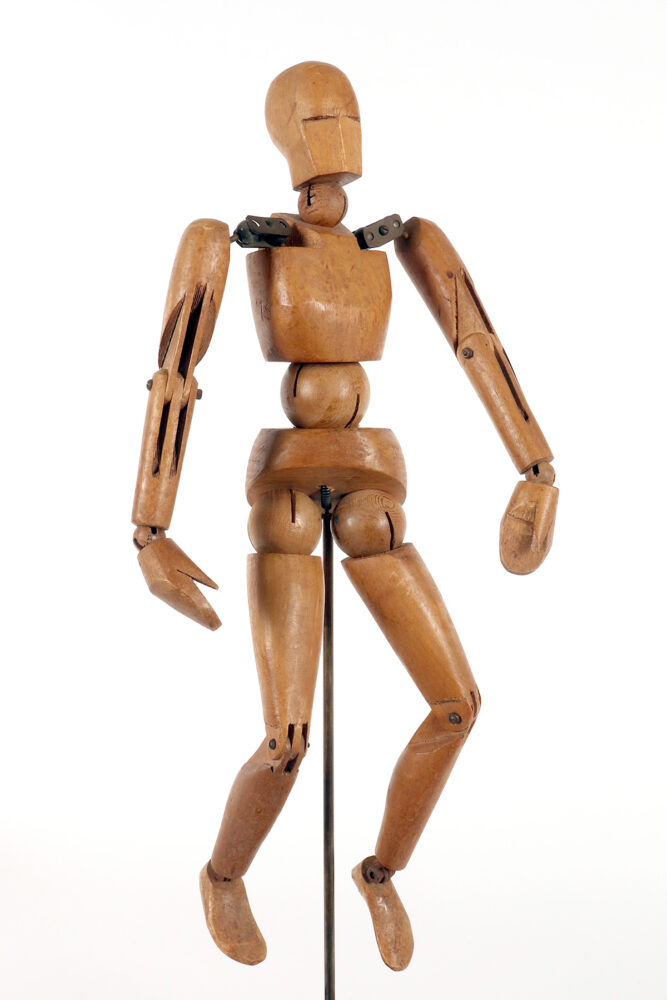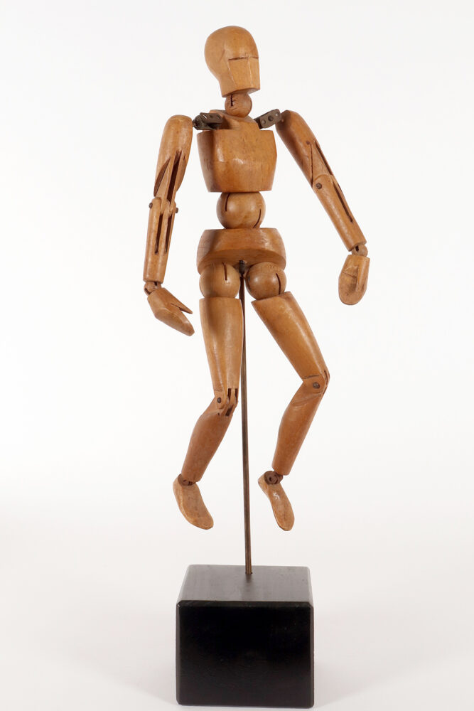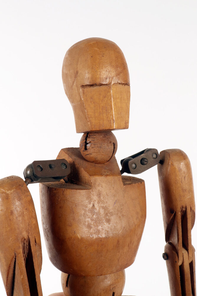 An articulated artist’s mannequin in alder wood with a metaphysical face, France 1920.
