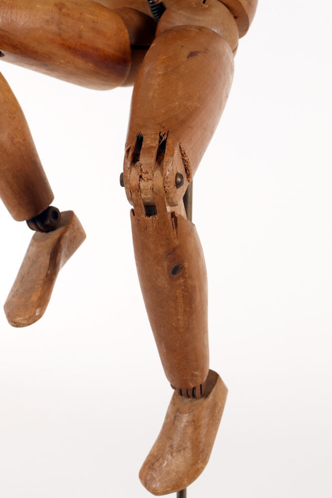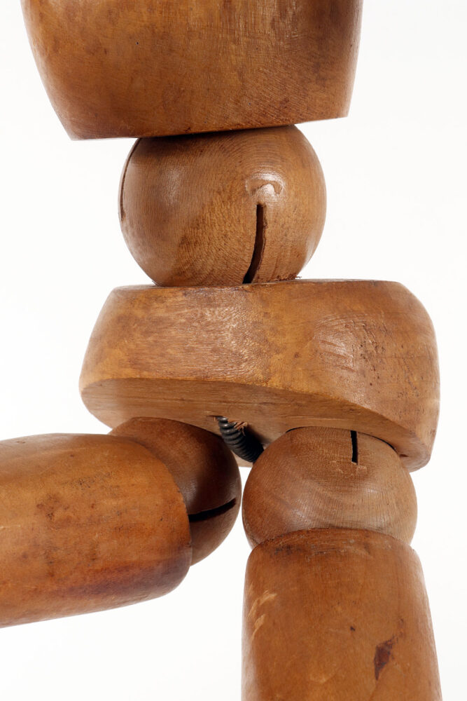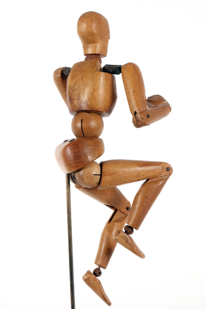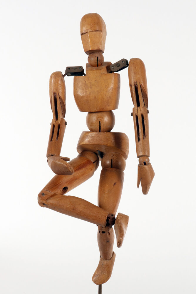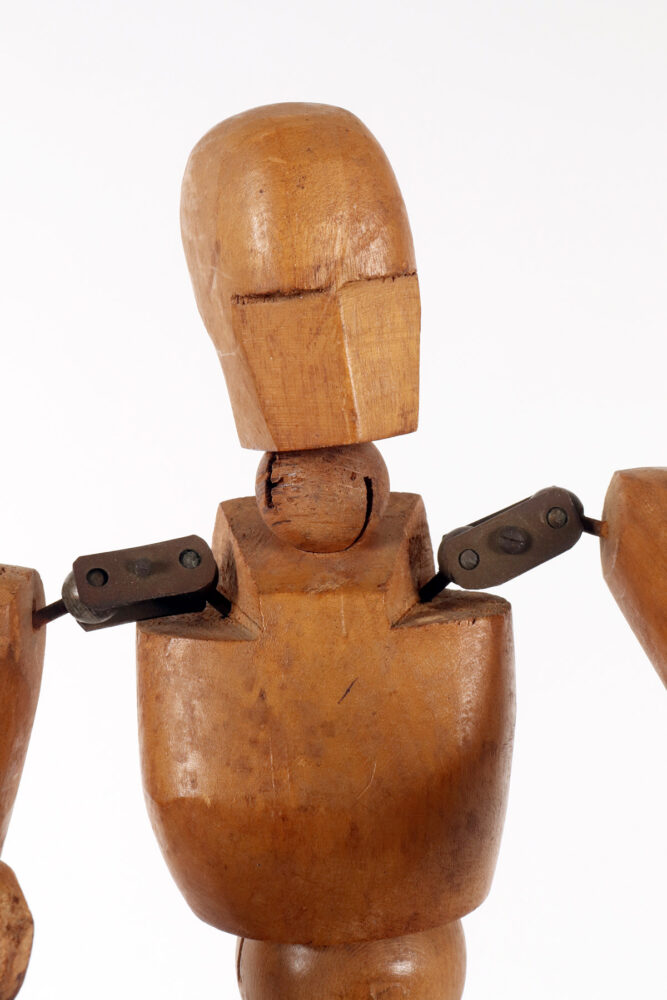 An articulated artist’s mannequin in alder wood with a metaphysical face, France 1920.