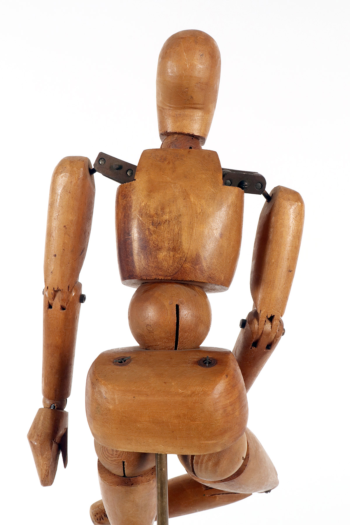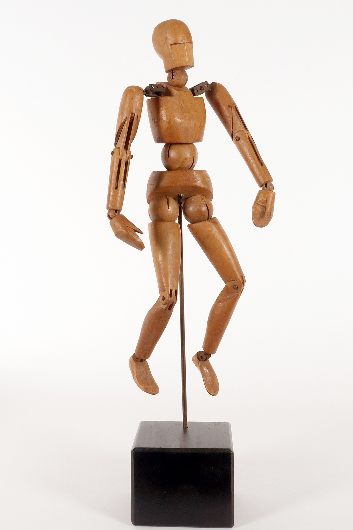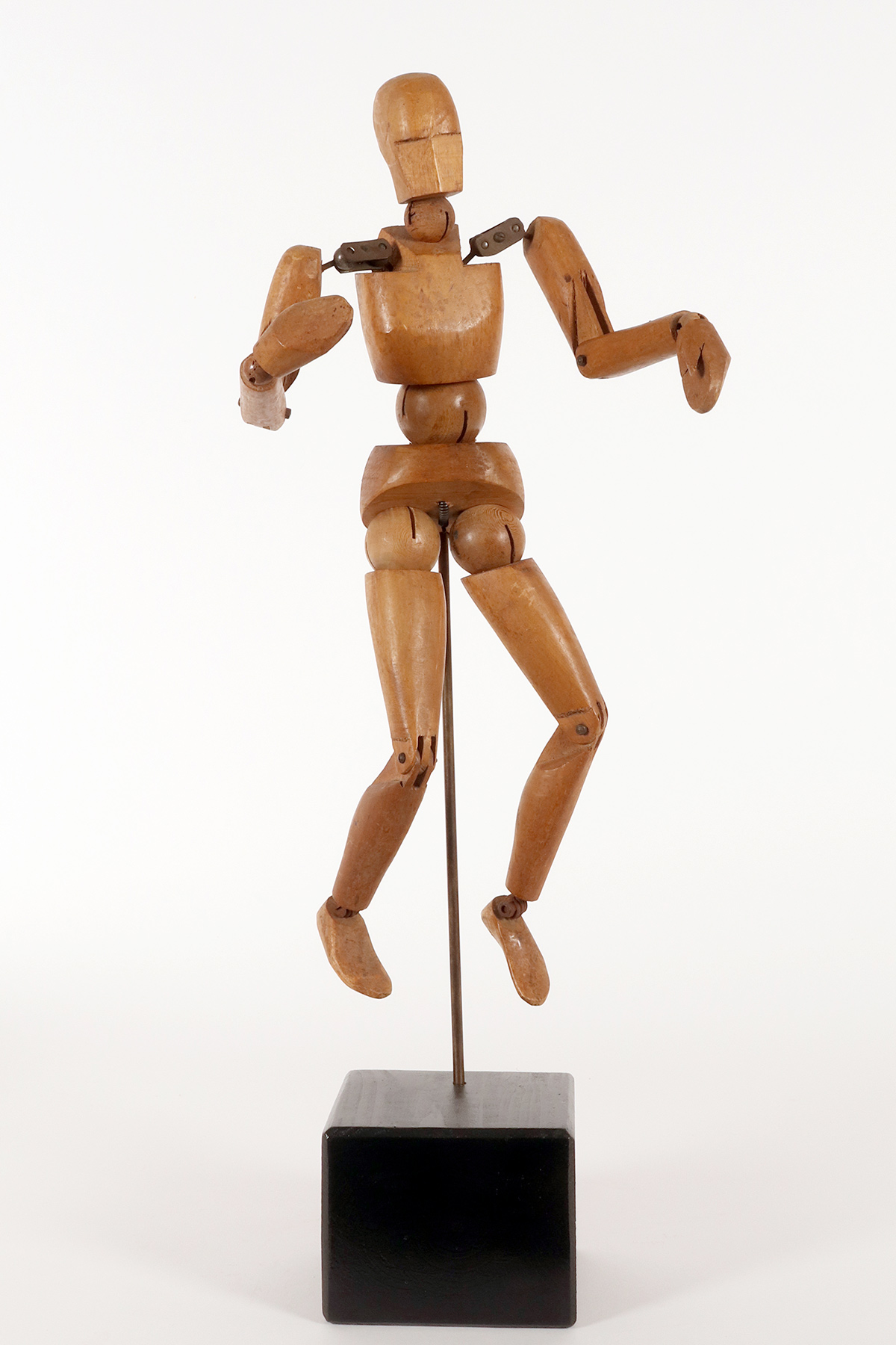 A small-sized, articulated painter’s mannequin with a metaphysical face. The mannequin is crafted from carved alder wood. It features a combination of various types of joints, ranging from spheres to pinned hinge joints at the knees and elbows, and more complex shoulder articulations consisting of pairs of metal plates and spheres. It is mounted on a brass support with a cubic base, also made of fir wood, with a black lacquered finish. France, circa 1920.