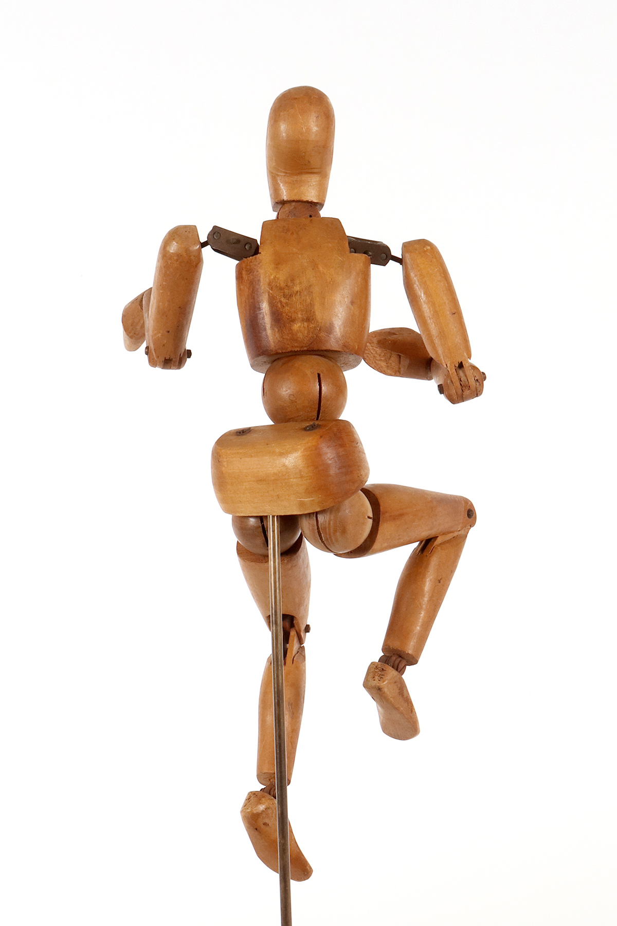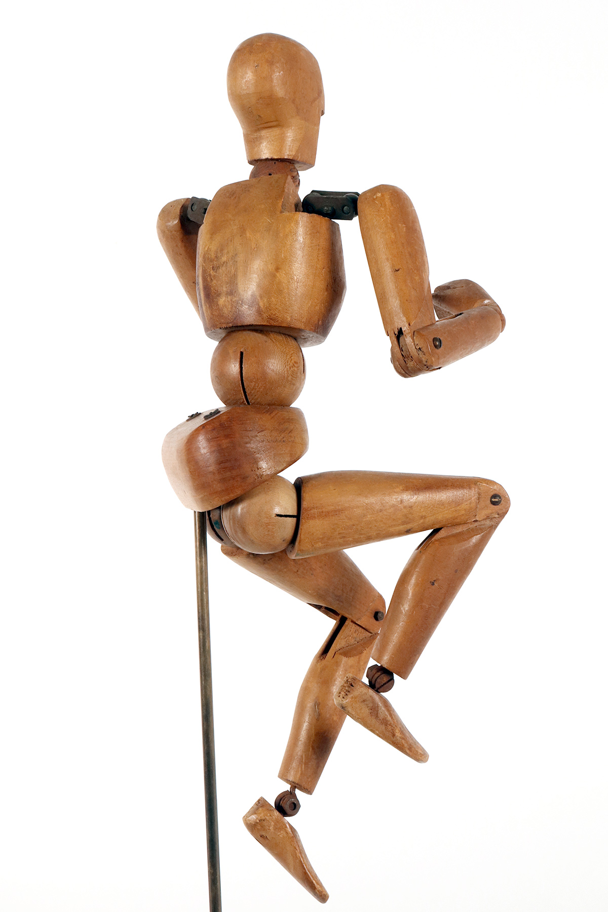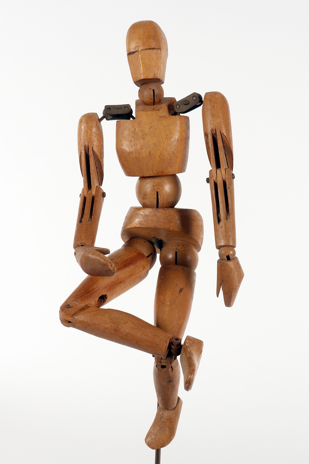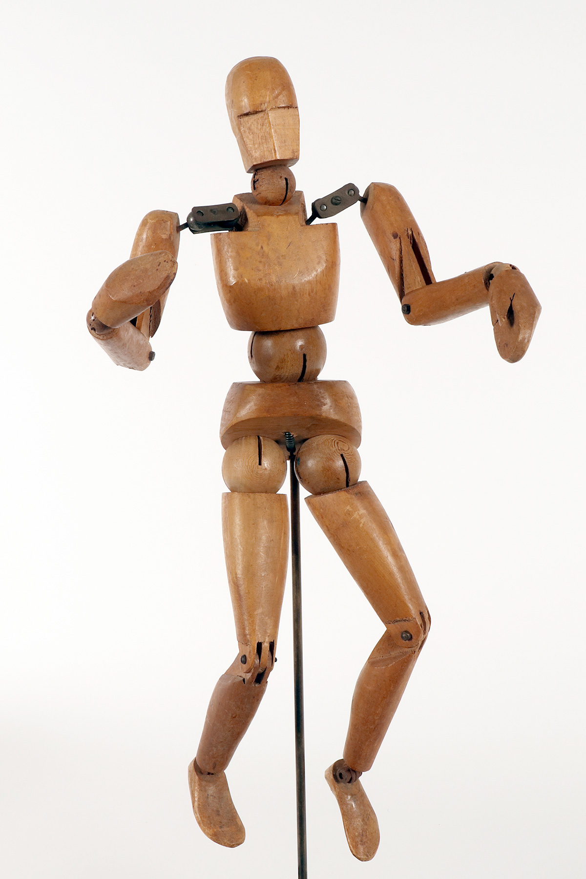 A small-sized, articulated painter’s mannequin with a metaphysical face. The mannequin is crafted from carved alder wood. It features a combination of various types of joints, ranging from spheres to pinned hinge joints at the knees and elbows, and more complex shoulder articulations consisting of pairs of metal plates and spheres. It is mounted on a brass support with a cubic base, also made of fir wood, with a black lacquered finish. France, circa 1920.