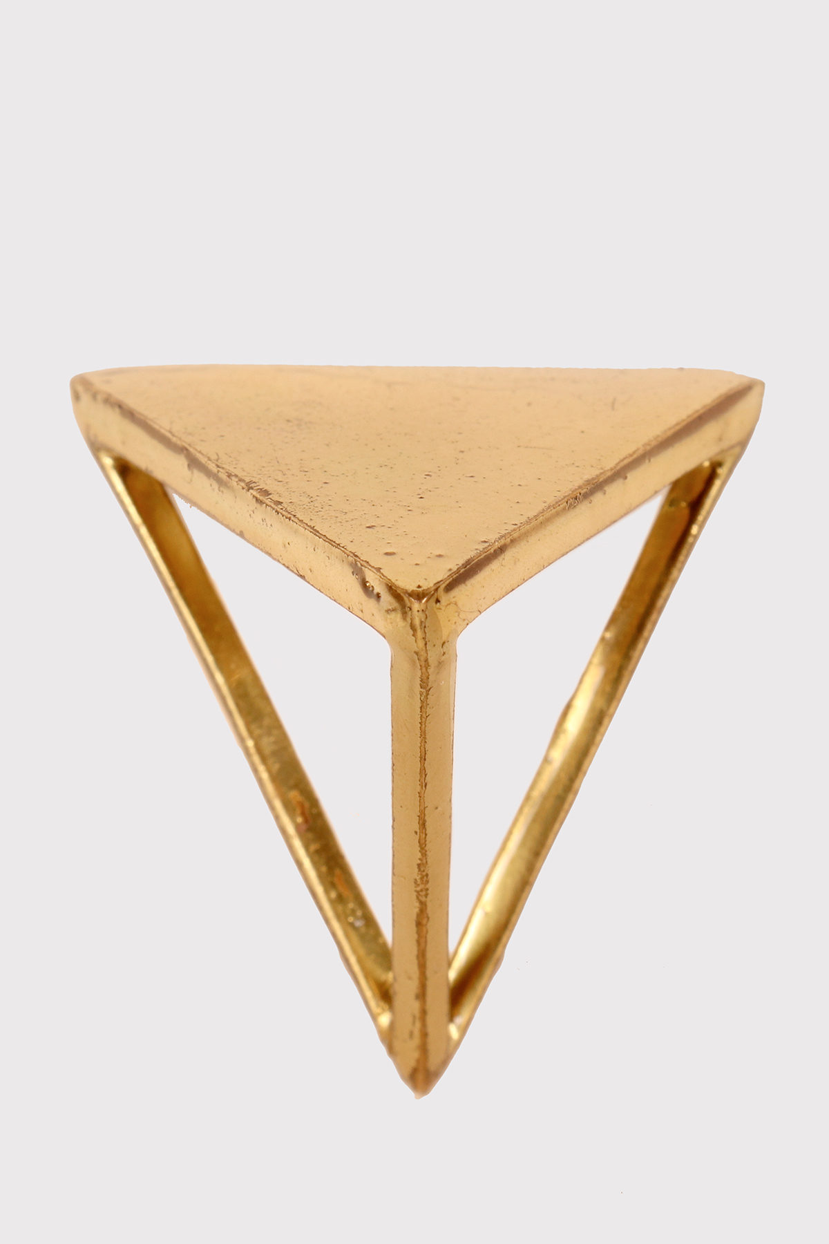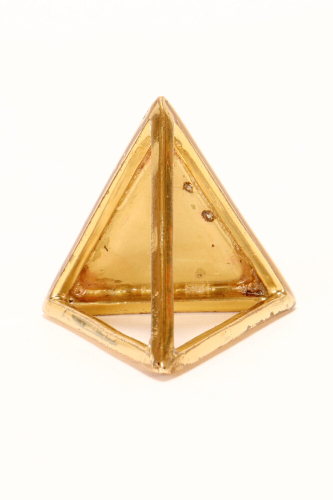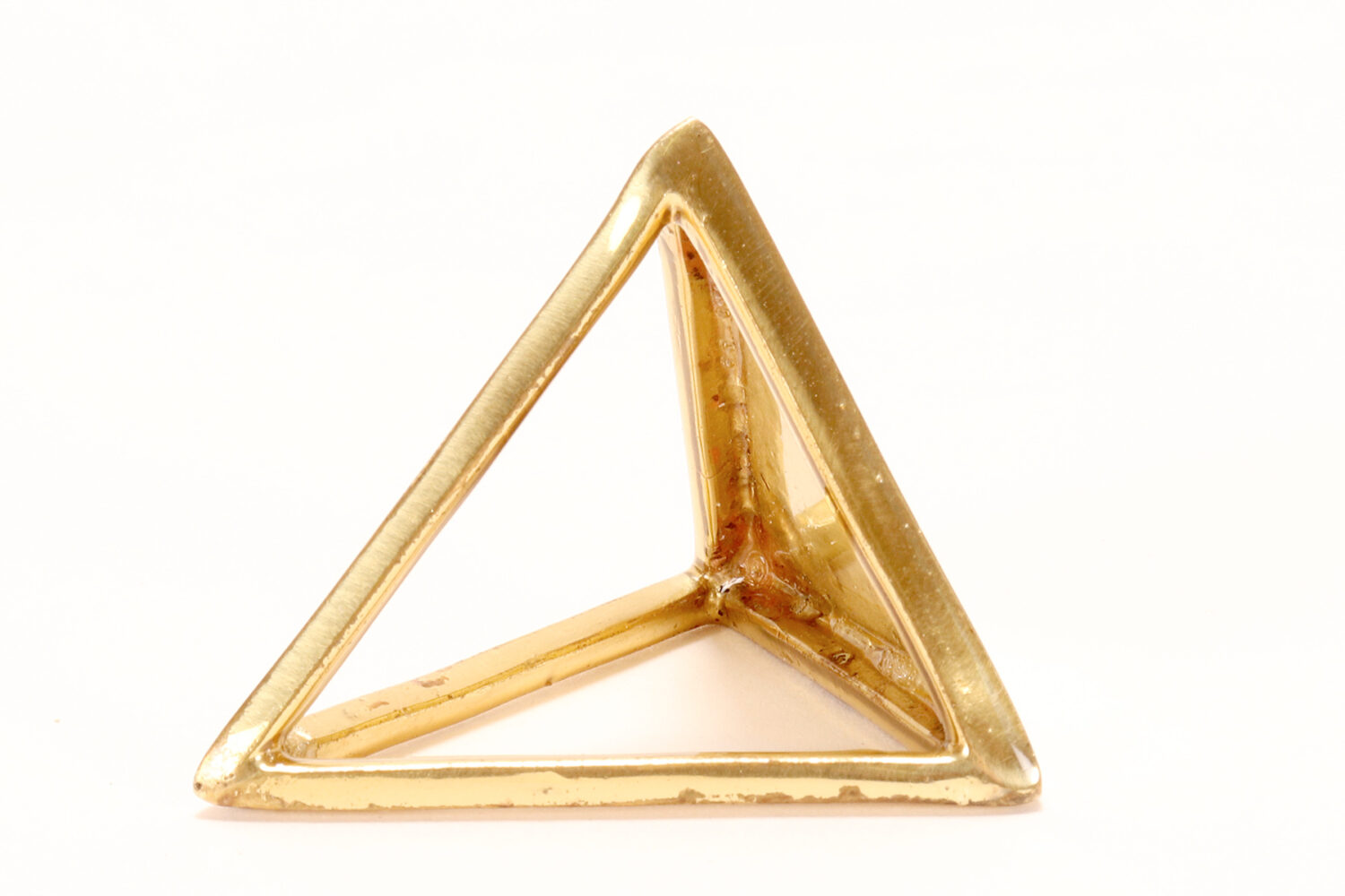 Prototipo di anello a forma di tetraedro realizzato in ottone. Un lato del solido è una lastra in ottone a forma di triangolo equilatero, gli altri tre lati sono vuoti. Designer Stefania Bosio per Ornamenta. Italia anno 2000.