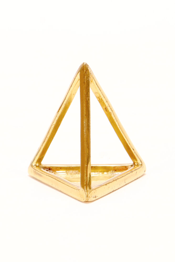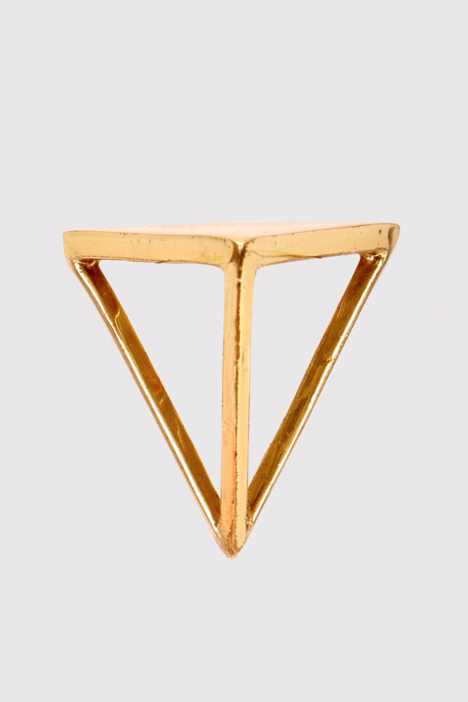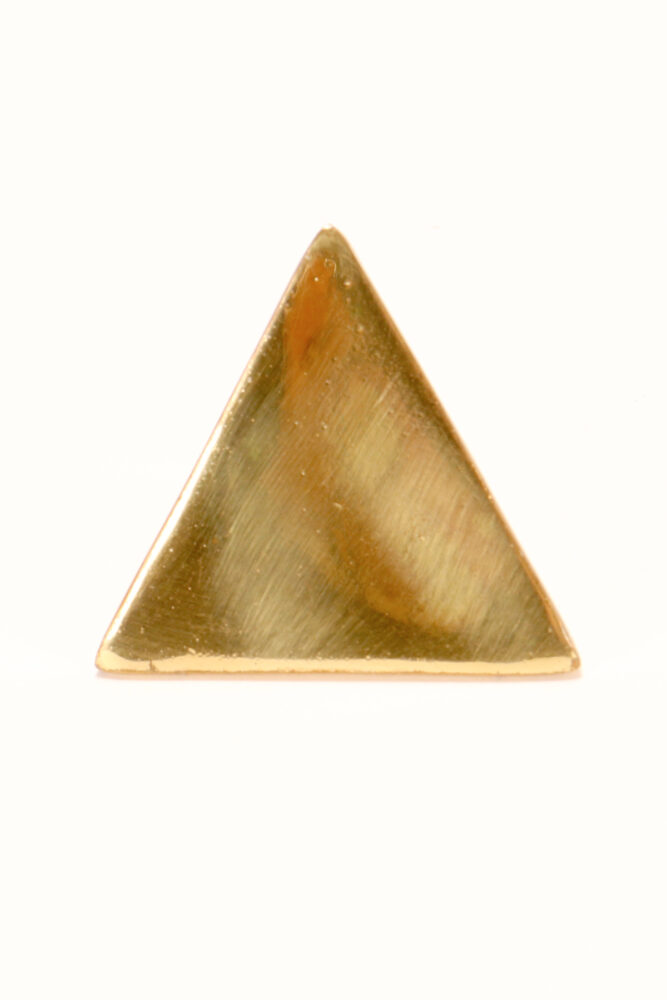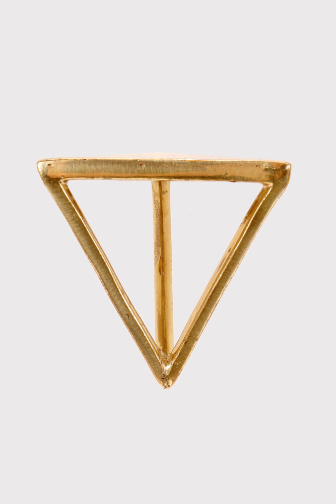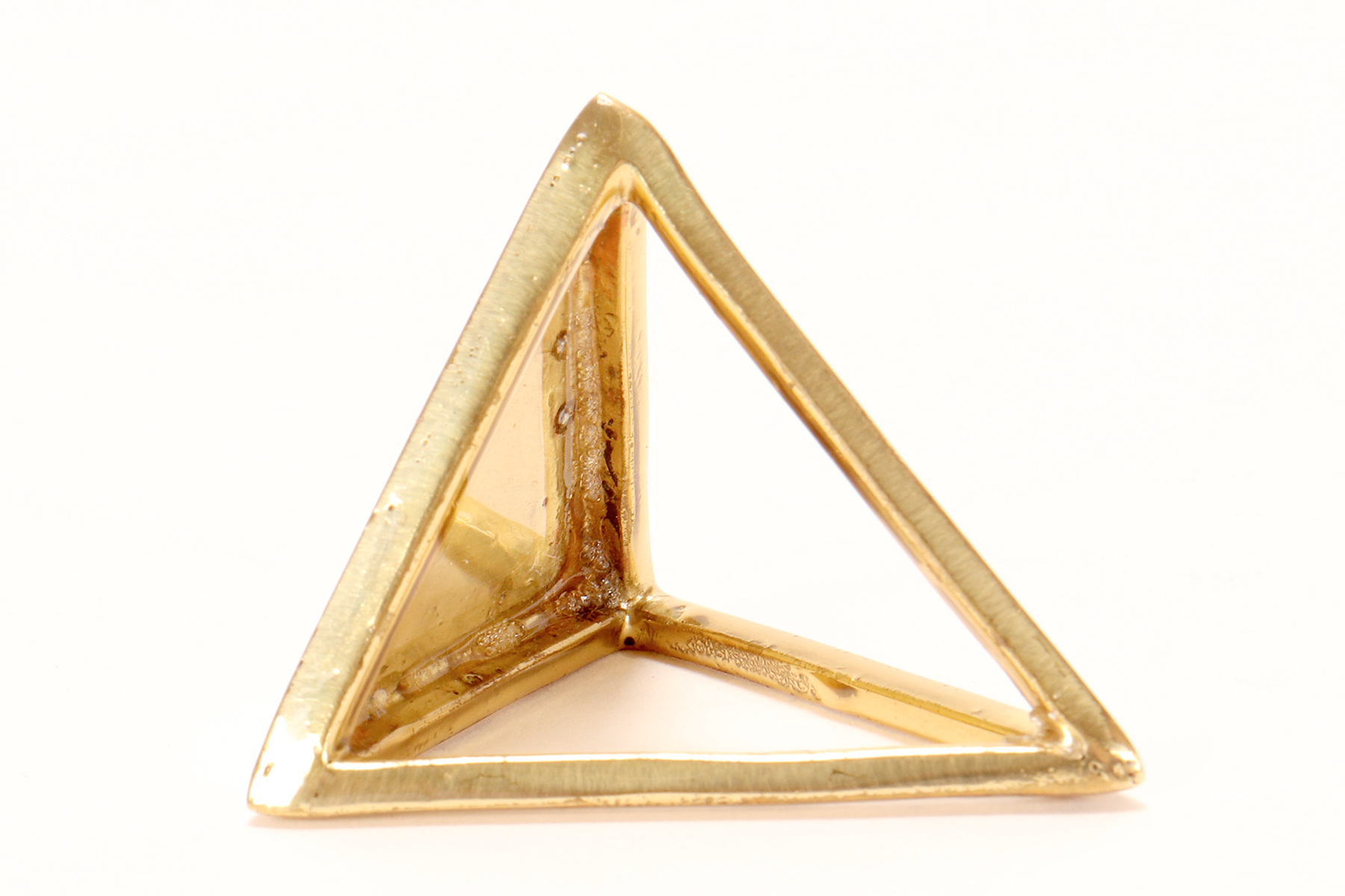 Prototipo di anello a forma di tetraedro realizzato in ottone. Un lato del solido è una lastra in ottone a forma di triangolo equilatero, gli altri tre lati sono vuoti. Designer Stefania Bosio per Ornamenta. Italia anno 2000.