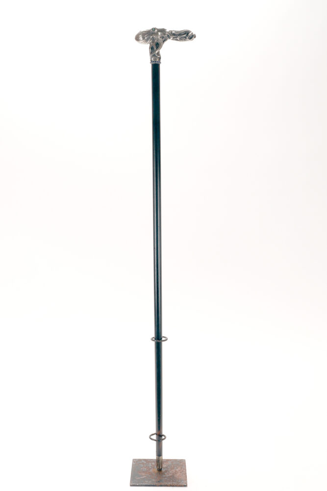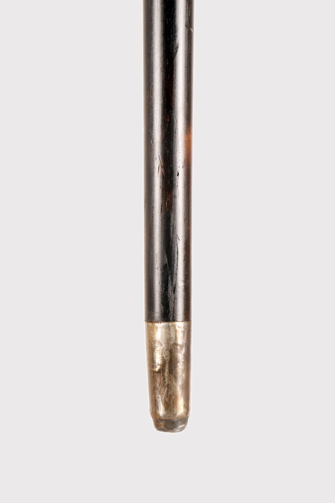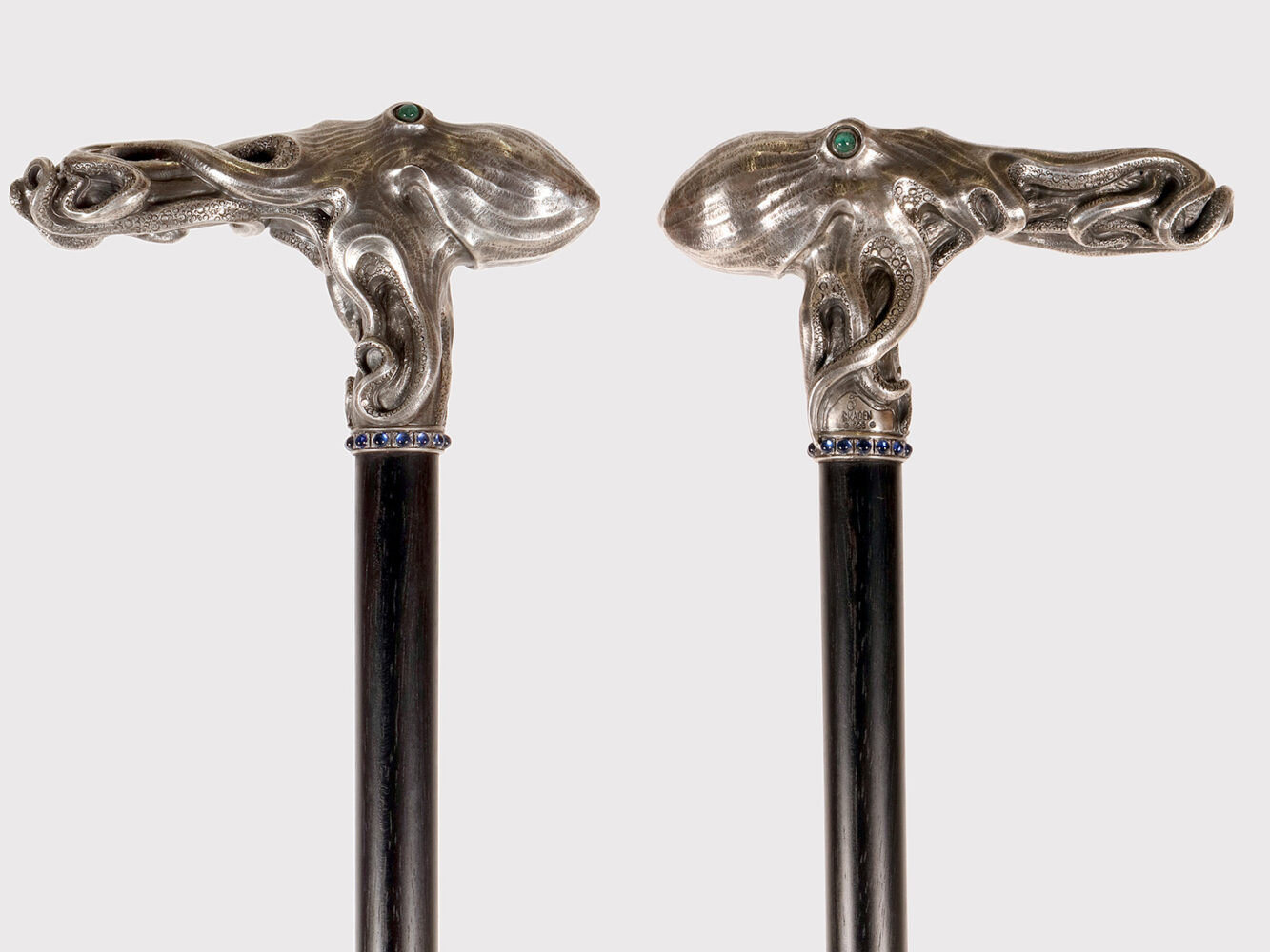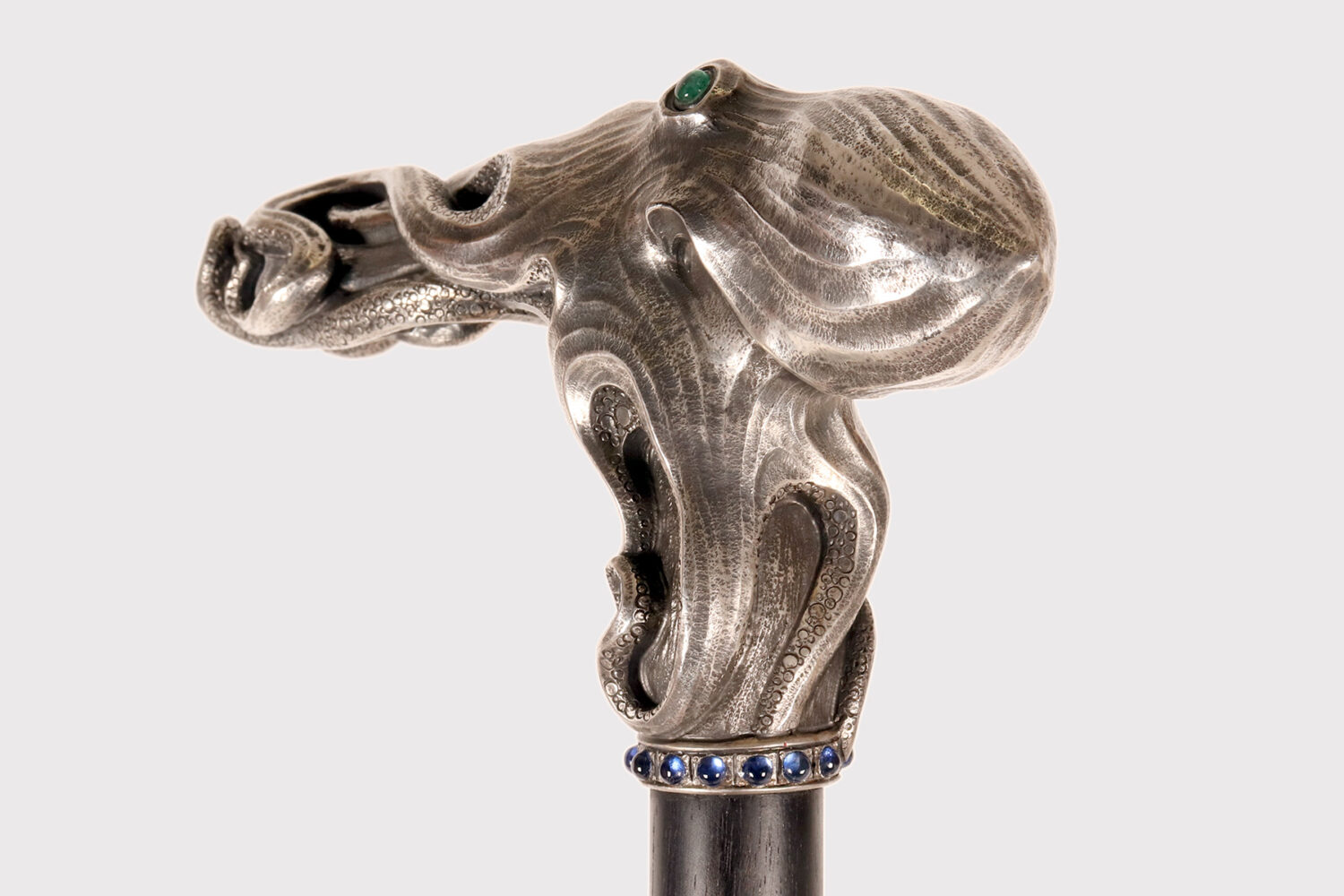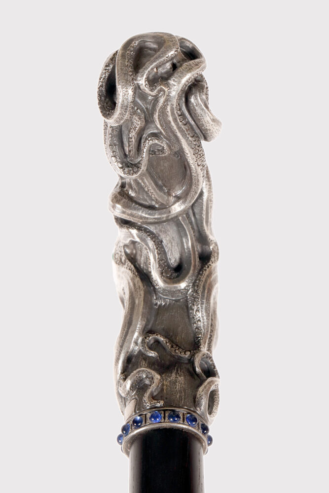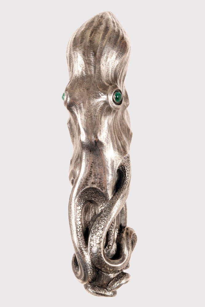 Art Nouveau jewel walking stick. A silver handle, designed and crafted by the young Dane Christian Fjerdingstad in the first decade of the 20th century. A spectacular depiction of an octopus, notable for its exquisite carving and numerous meticulous details: two cabochon-set emerald eyes; hammered skin, with the cavities blackened for dramatic contrast; eight limbs dragging, anchoring, and sliding along the ebony shaft with those countless beautifully crafted suckers. A ring of hemispheres with cabochon sapphires completes the band’s collar. It was the work of the young Christian Fjerdingstad, the designer who would soon become a leading exponent of streamlined Scandinavian modernity. Denmark, circa 1912–1914.