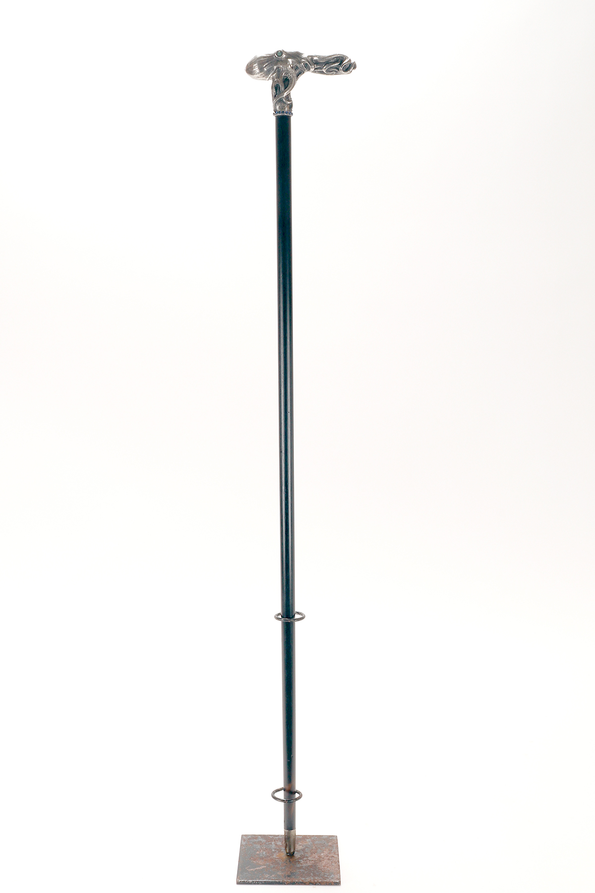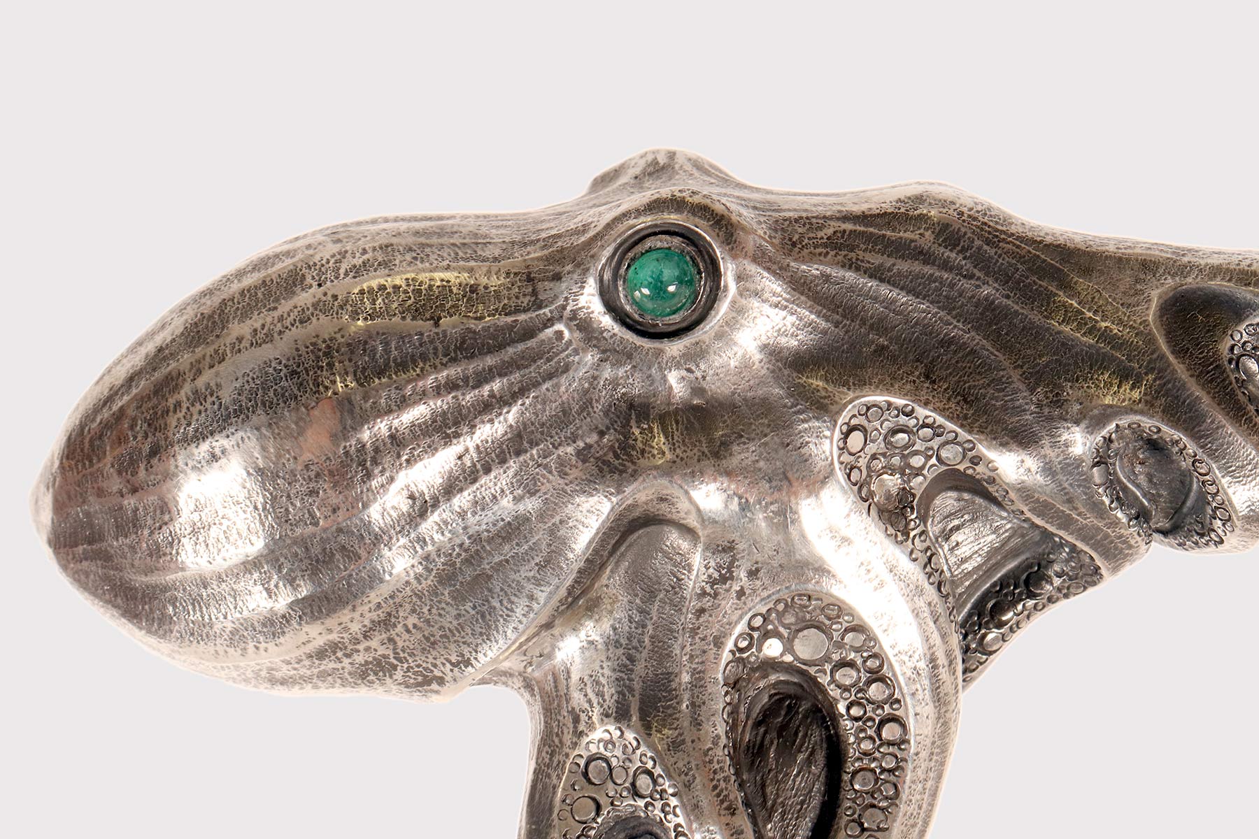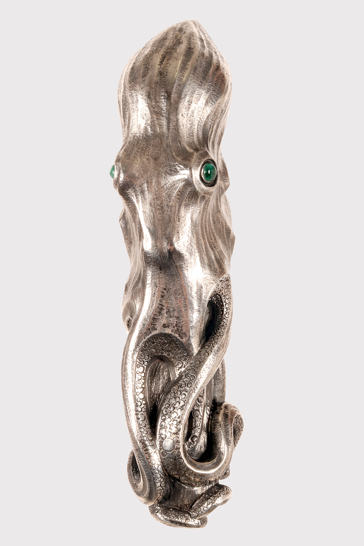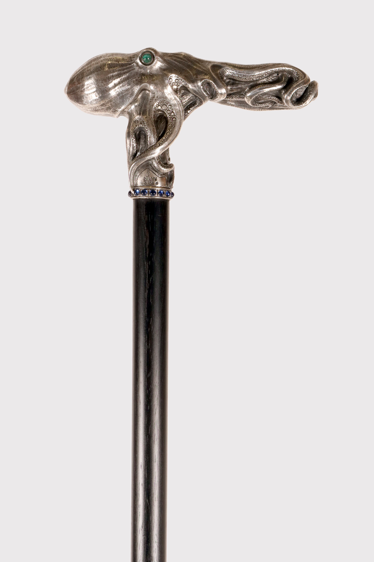 Art Nouveau jewel walking stick. A silver handle, designed and crafted by the young Dane Christian Fjerdingstad in the first decade of the 20th century. A spectacular depiction of an octopus, notable for its exquisite carving and numerous meticulous details: two cabochon-set emerald eyes; hammered skin, with the cavities blackened for dramatic contrast; eight limbs dragging, anchoring, and sliding along the ebony shaft with those countless beautifully crafted suckers. A ring of hemispheres with cabochon sapphires completes the band’s collar. It was the work of the young Christian Fjerdingstad, the designer who would soon become a leading exponent of streamlined Scandinavian modernity. Denmark, circa 1912–1914.
