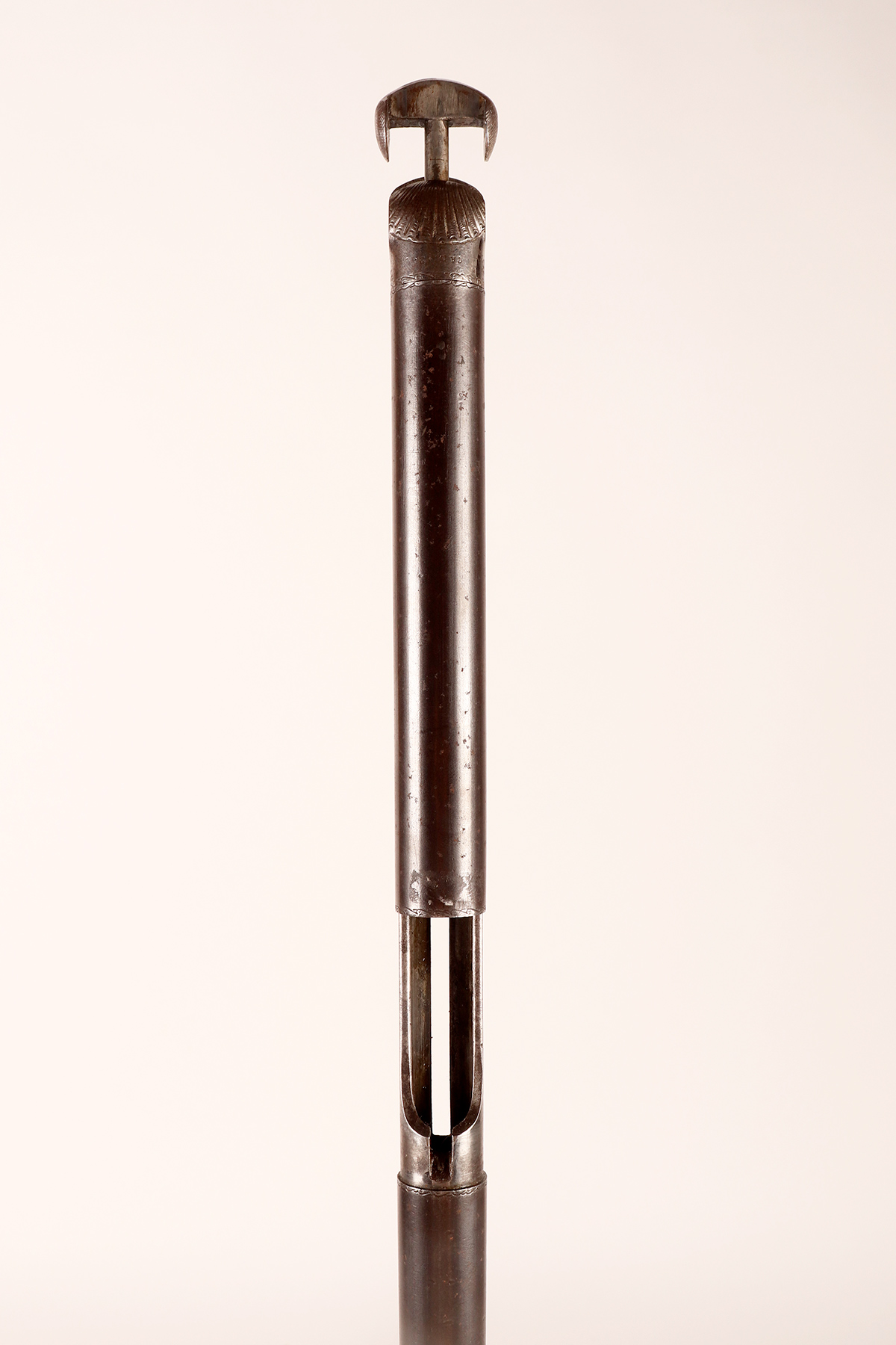 Bastone a sistema con funzione da difesa. La fabbrica Víctor Sarasqueta, Cortaberría y Cía., principale azienda produttrice di queste armi fu attiva a Eibar, Spagna, tra il 1899 e il 1906, ed è probabile che la causa della sua chiusura sia stato il Regio Decreto di settembre 28, 1907. Detto decreto, emanato dall’allora Ministro dell’Interno, Sig. La Cierva, stabiliva il divieto dell’uso e della fabbricazione di bastoni da passeggio da caccia in quanto arma che poteva essere utilizzata negli attentati. Un fucile camuffato: l’impugnatura fu cromata (dove sono ospitati tutti i meccanismi di sparo), a imitazione dell’argento, e la canna fu dipinta di nero o color legno, rendendo così molto difficile differenziarla da un bastone normale. La canna integra un fucile a colpo singolo calibro 12. La sua manovrabilità era molto semplice: la canna veniva ruotata di circa 90º e il pugno tirato indietro, lasciando la camera aperta e pronta per inserire la cartuccia. Quindi veniva chiuso e girato per ruotare la canna nella sua posizione iniziale. Veniva tirata una molla incorporata nel pugno, che faceva uscire il grilletto dal suo nascondiglio, lasciando la canna pronta all’uso. Naturalmente, prima di farlo, si doveva togliere il puntale dall’estremità della canna per evitare che venisse sparato con i palini. Sono pochi i bastoni che conservano ancora i puntali originali, come nel nostro caso. Una forcella unita al puntale serviva per l’estrazione del bossolo. Potrebbe essere utilizzato per la difesa personale, portandolo come un altro bastone, oppure per l’uso venatorio. Il calcio, realizzato in legno, è telescopico e presenta una vite nella parte inferiore che ne adattava