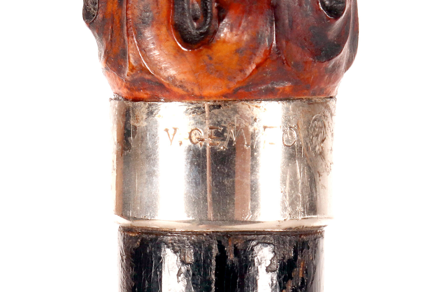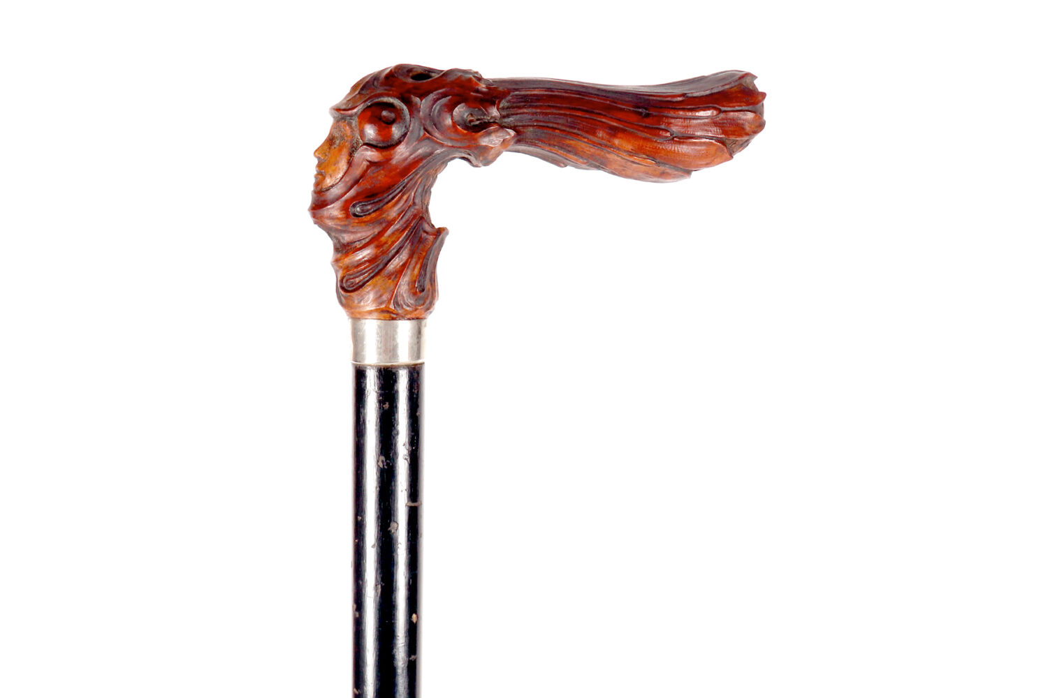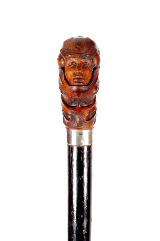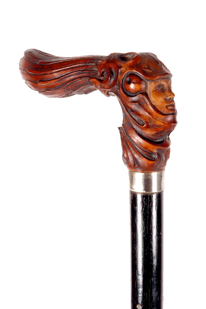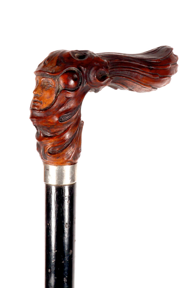 Bastone da passeggio in stile Art Nouveau. Il pomolo è realizzato in legno di bosso finemente intagliato, raffigurante una rappresentazione di Cerere (Demetra per i greci), la Dea romana dei cereali, dei raccolti e della fecondità della natura,.Il suo volto è racchiuso inun’armatura. Cerere era anche la protettrice delle leggi e dei tribunali. Canna in legno di frutto ebanizzato, puntale in corno bovino. Fascia in argento, firmato Gemito. Vincenzo Gemito (1852-1929), vinctore di una medaglia d’oro all’Esposizione di Napoli del 1877. La maggior parte del suo lavoro risiede nelle Gallerie d’Arte Moderna di Roma e Torino, nel museo del Bargello a Firenze e in musei internazionali: d’Orsay, Getty, Prado e Metropolitan. Italia circa 1900.