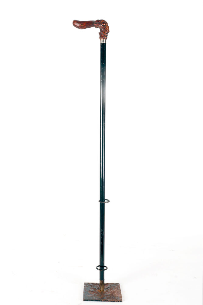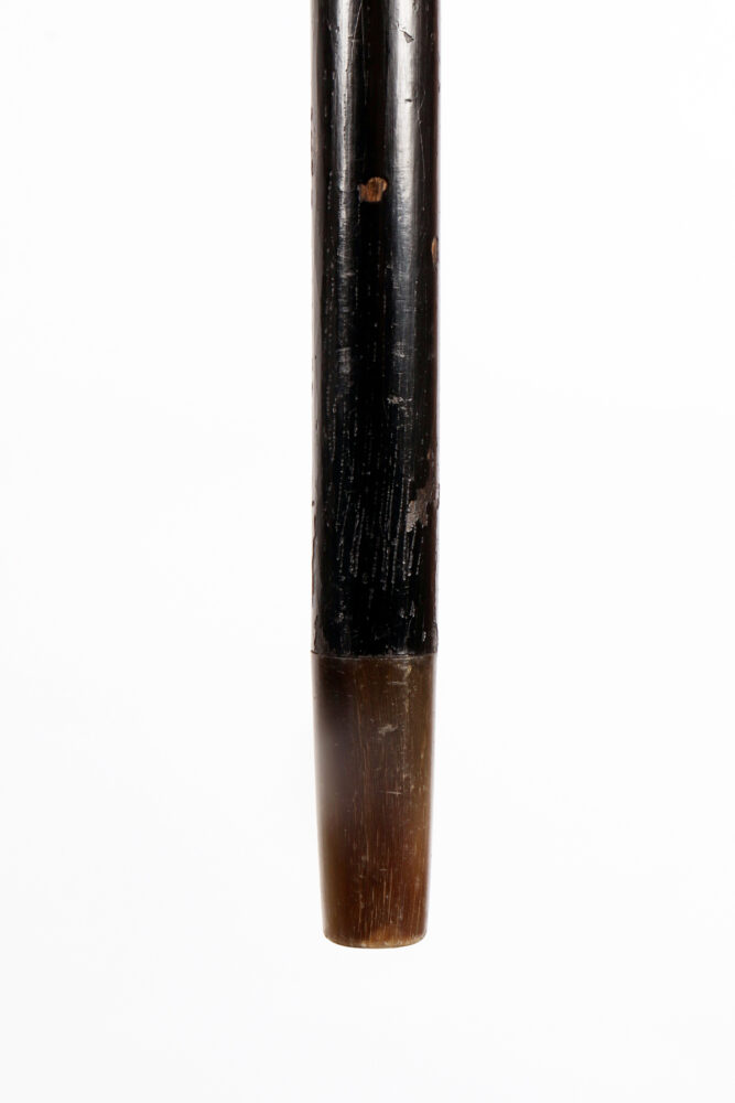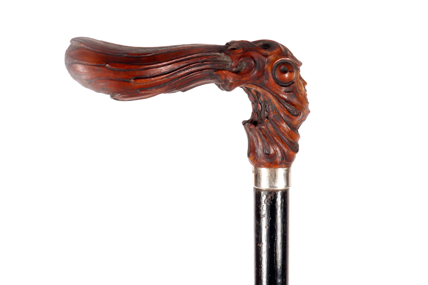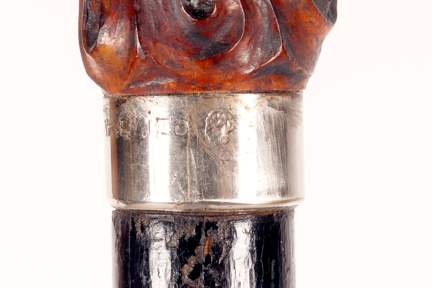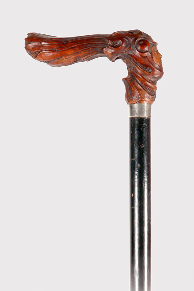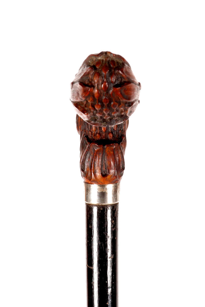 Bastone da passeggio in stile Art Nouveau. Il pomolo è realizzato in legno di bosso finemente intagliato, raffigurante una rappresentazione di Cerere (Demetra per i greci), la Dea romana dei cereali, dei raccolti e della fecondità della natura,.Il suo volto è racchiuso inun’armatura. Cerere era anche la protettrice delle leggi e dei tribunali. Canna in legno di frutto ebanizzato, puntale in corno bovino. Fascia in argento, firmato Gemito. Vincenzo Gemito (1852-1929), vinctore di una medaglia d’oro all’Esposizione di Napoli del 1877. La maggior parte del suo lavoro risiede nelle Gallerie d’Arte Moderna di Roma e Torino, nel museo del Bargello a Firenze e in musei internazionali: d’Orsay, Getty, Prado e Metropolitan. Italia circa 1900.