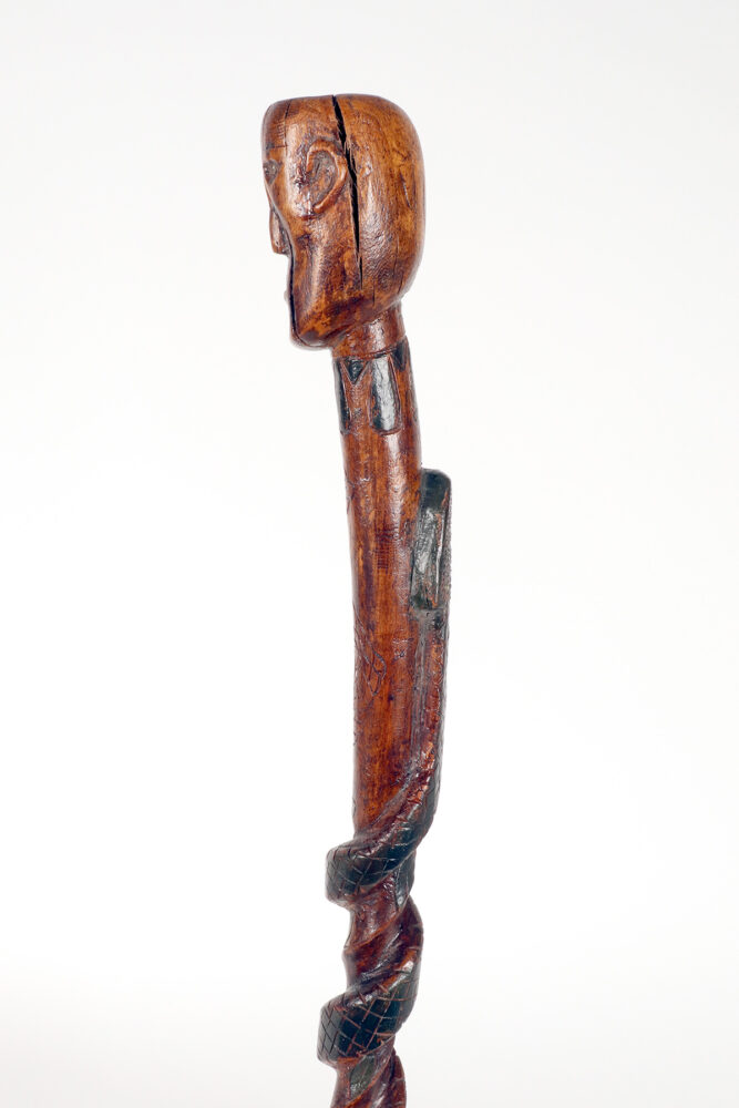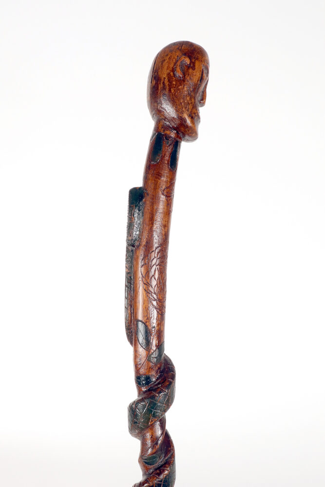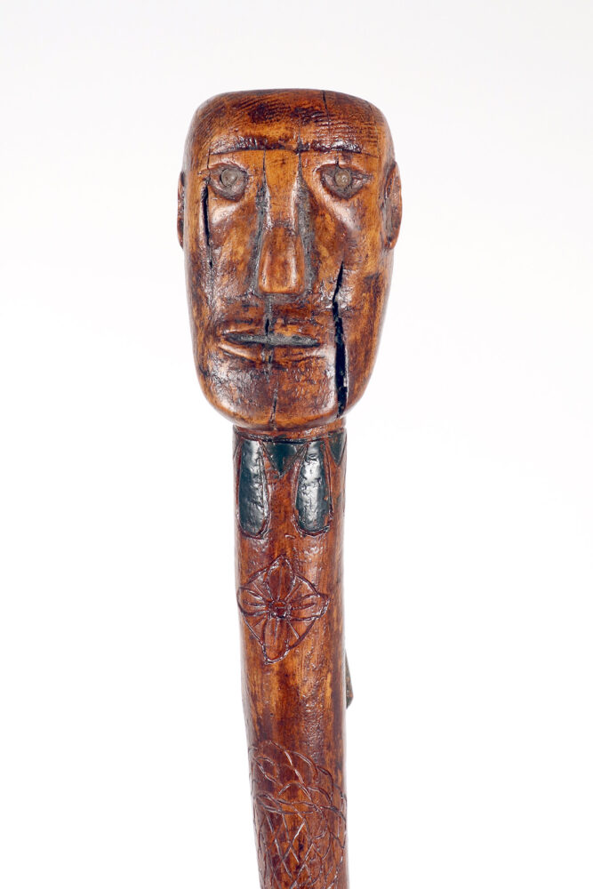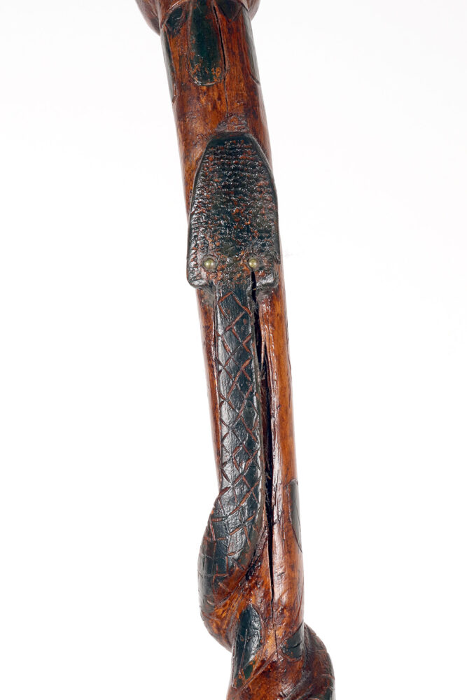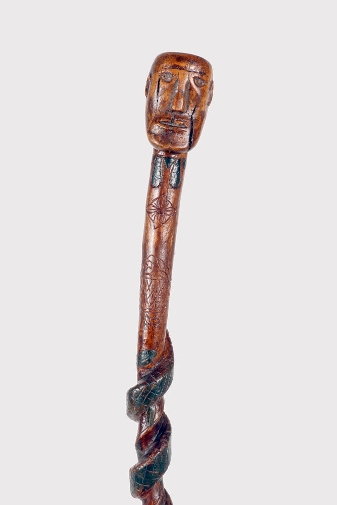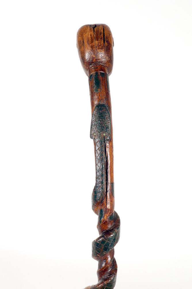 Bastone da passeggio di arte popolare: un pezzo di legno da frutto raffigurante il busto di un nativo americano con un serpente intagliato lungo la canna curva e dipinto si colore verde. Gli occhi del Nativo Americano e del serpente sono fatti di chiodini dipinti. Origini native americane. Stati Uniti d’America, seconda metà del XIX secolo.