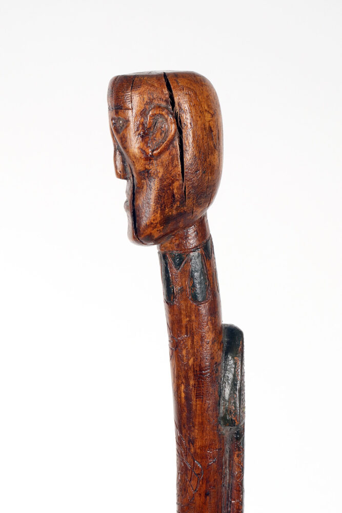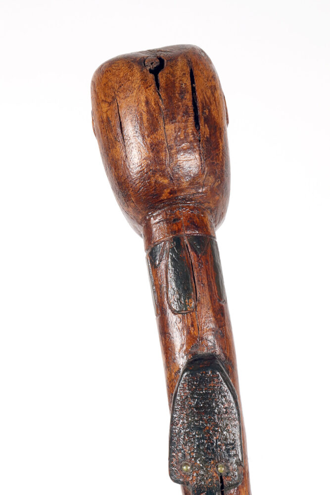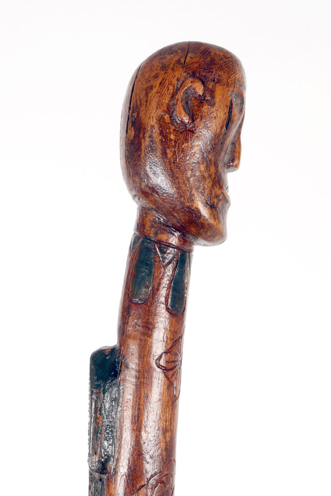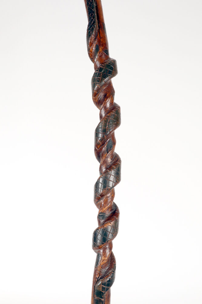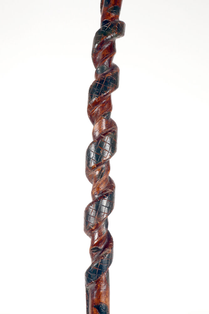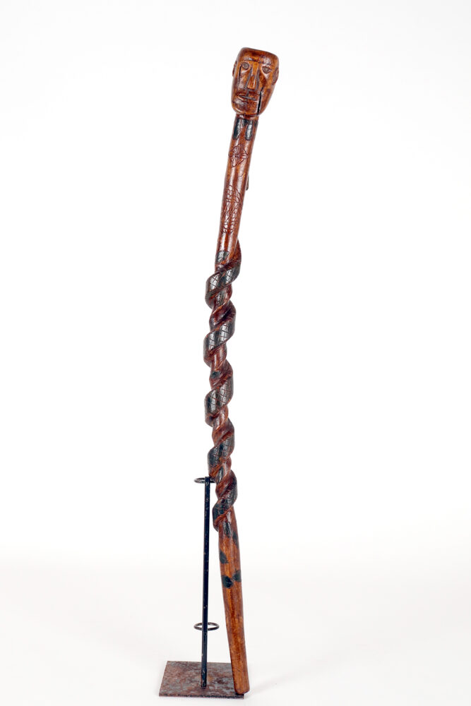 Bastone da passeggio di arte popolare: un pezzo di legno da frutto raffigurante il busto di un nativo americano con un serpente intagliato lungo la canna curva e dipinto si colore verde. Gli occhi del Nativo Americano e del serpente sono fatti di chiodini dipinti. Origini native americane. Stati Uniti d’America, seconda metà del XIX secolo.