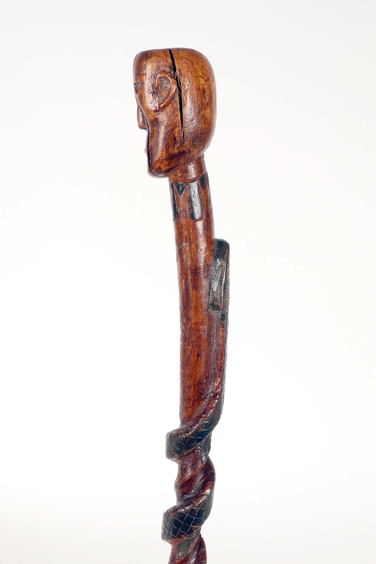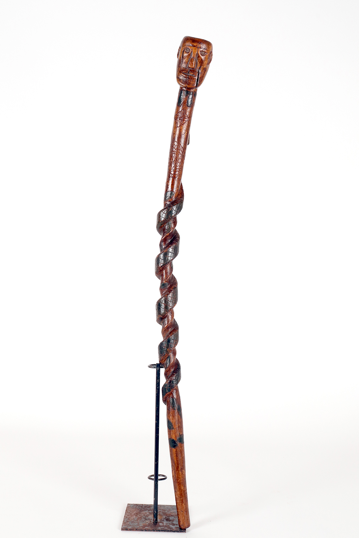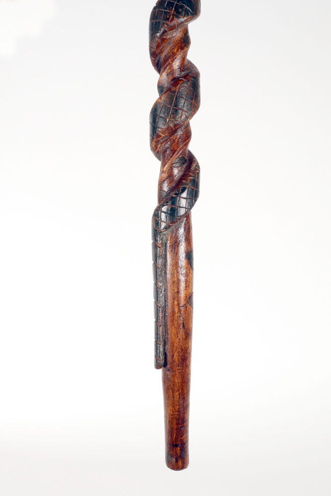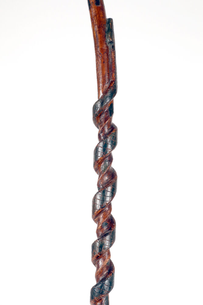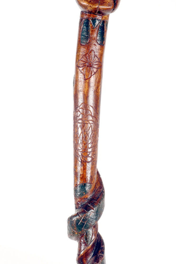 Bastone da passeggio dipinto, arte popolare raffigurante un uomo con un serpente, origini dei Nativi Americani, seconda metà del XIX secolo.
