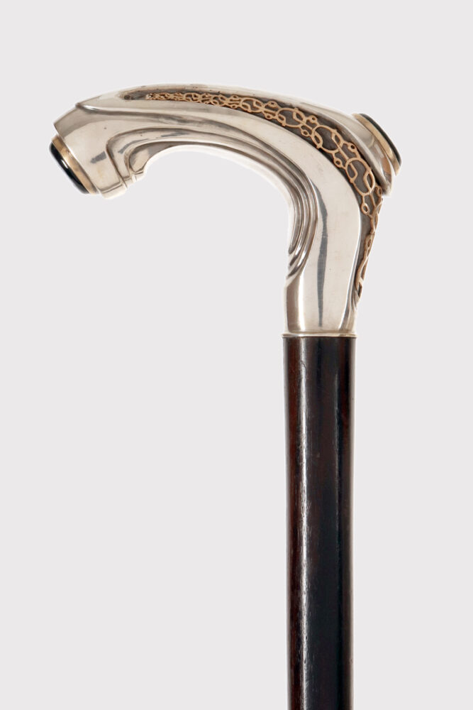 Bastone da passeggio: bastone gioiello con una impugnatura tattile a forma di L, giocata sui contrasti dell’argento 800/1000 e del vermeil. Ampi archi in argento a gradini, circondano nicchie in vermeil traforato raffiguranti forme geometriche. Le curve lisce e finemente patinate dell’argento, sono al tempo stesso completate e contastate dal colore lucente della griglia traforata in vermeil. Alle due estremità del pomolo, sono incassate due agate striate nere, intagliate raffigurante due aquile, una con la testa e becco aperto, l’altra appollaiata vista da dietro. Canna in legno di ebano di macassar con puntale in corno bovino. Firmato Lazarus Pozen Witwe. La bottega di Lazarus Pozen Witwe era una attività rara: fu fondata, posseduta e gestita da una donna ebrea Brendina Wetzlar Posen(1833-1901), vedova del rabbino e argentiere Lazarus Jacob Pozen(1803-1865). Quattro anni dopo la sua morte, Brenfina aprì la sua prospera azienda a Francoforte sul Meno e nel 1880, il figlio maggiore Jacob, entrò a far parte dell’azienda. Verso la fine del XIX secolo, l’azienda era diventata il più grande fornitore europeo di oggetti di ebraismo e nel 1900, il suo nutrito personale produceva alcuni dei migliori argenti tedeschi. Alla morte di Brendina, 1901, la direzione passò ai suoi nipoti, Jakob Hermann e Moritz. Nel 1903, l’azienda ottenne un mandato reale e aprì una seconda sede a Berlino. L’azienda fu distrutta durante la Kristallnacht, il violento saccheggio di attività commerciali ebraiche in Germania e Austria, tra il 9 e 10 novembre 1938. La famiglia imigrò in Gran Bretagna e poi negli Stati Uniti. Francoforte Germania fine XIX secolo.
