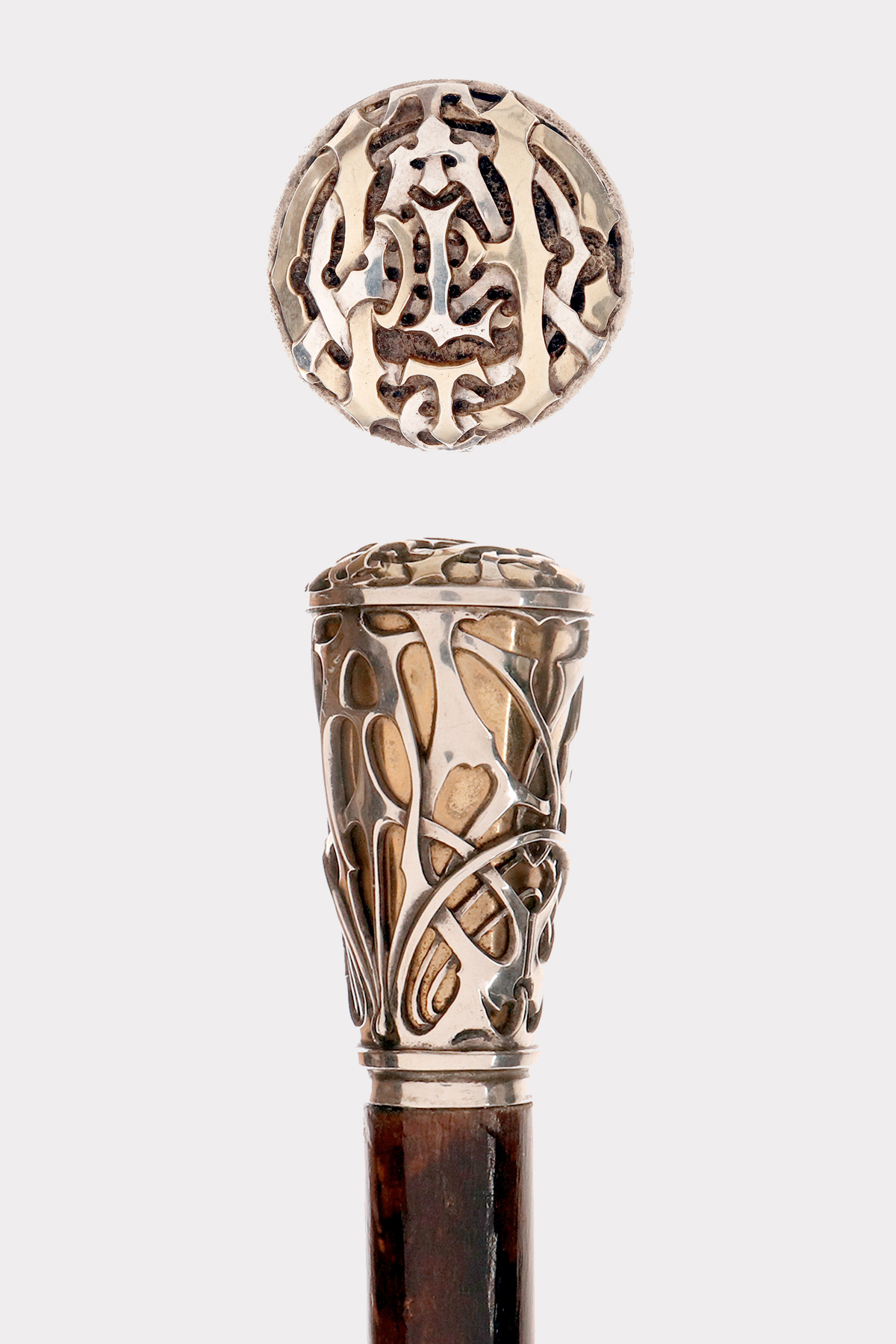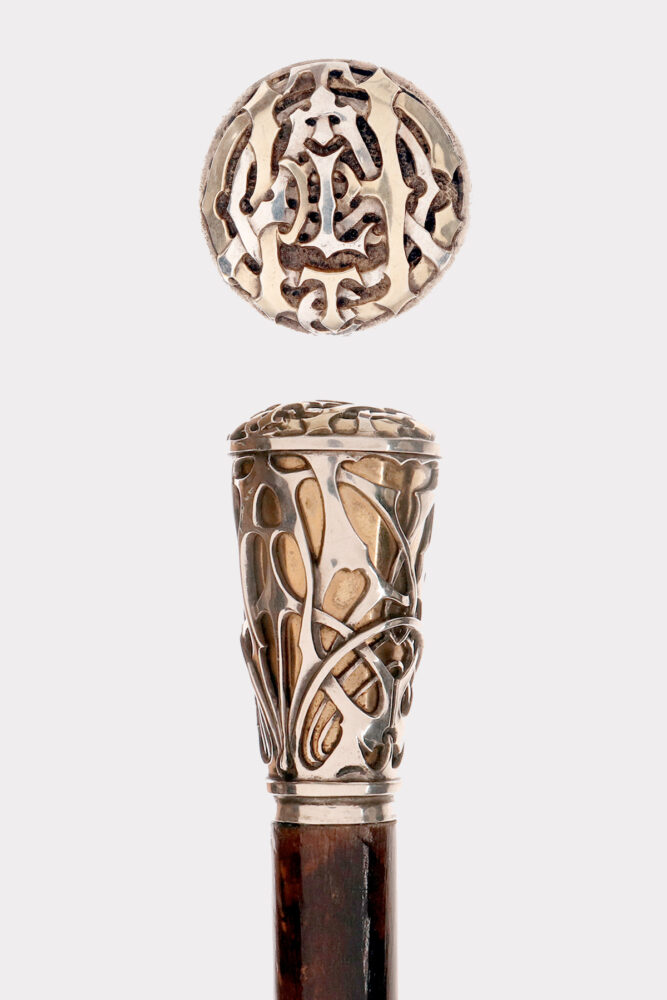 Bastone da passeggio: bastone gioiello Art Nouveau, pomolo a milord in oro e argento con monogramma intrecciato CHARLOTTE. Canna in legno di frutto. Puntale in corno bovino chiaro. Firmato Philippe Wolfers (1858-1929), il designer belga maggiormente associato alla forma francese dell’Art Nouveau. Philippe era uno dei tre figli dell’azienda di gioielleria di famiglia, Wolfers Frères, considerata una delle migliori argenterie d’Europa del XIX secolo. All’inizio degli anni novanta dell’ottocento, fondò il proprio laboratorio e fino al 1910 realizzo gioielli in stile Art Nouveau, unici nel loro genere. Bruxelles, Belgio 1900-1910.